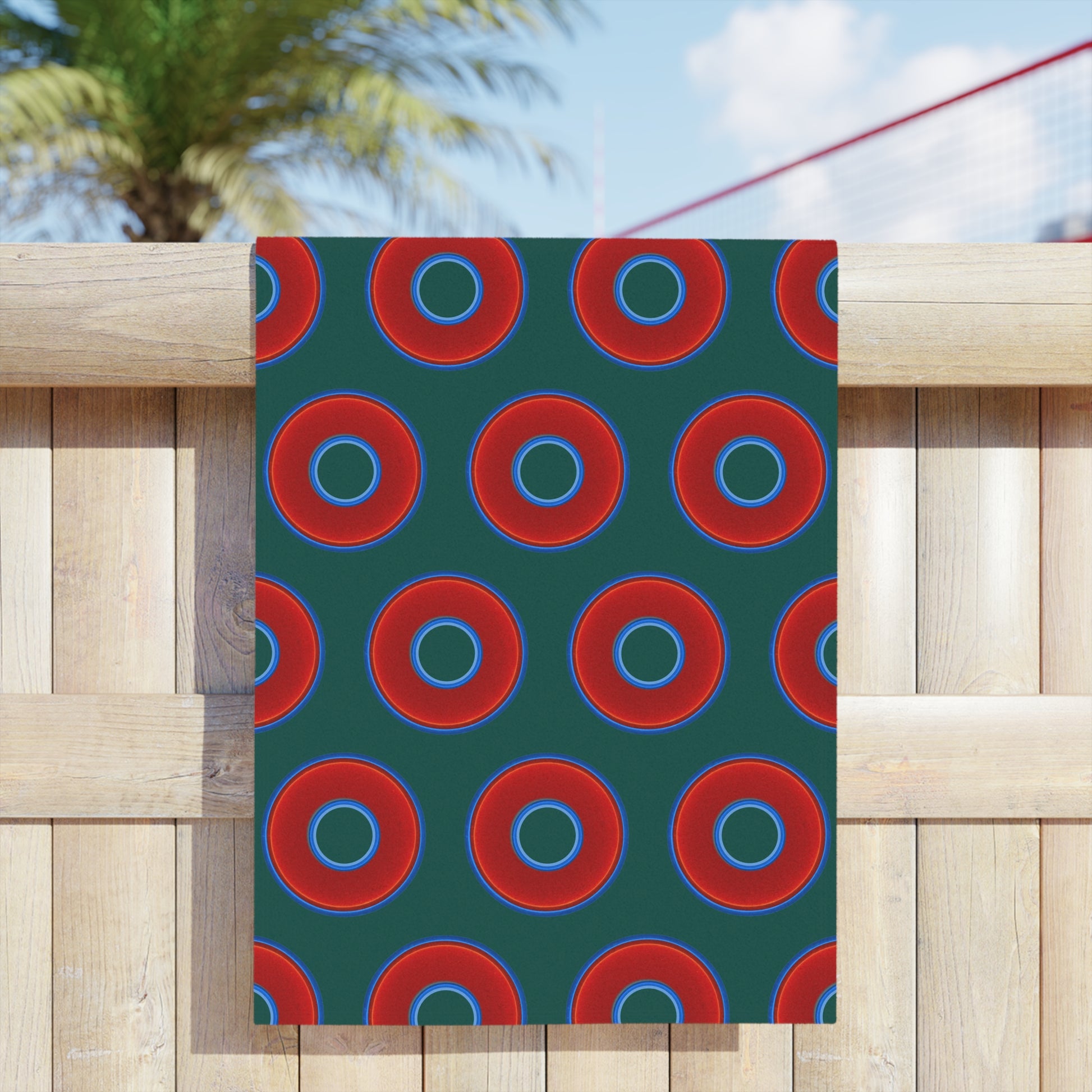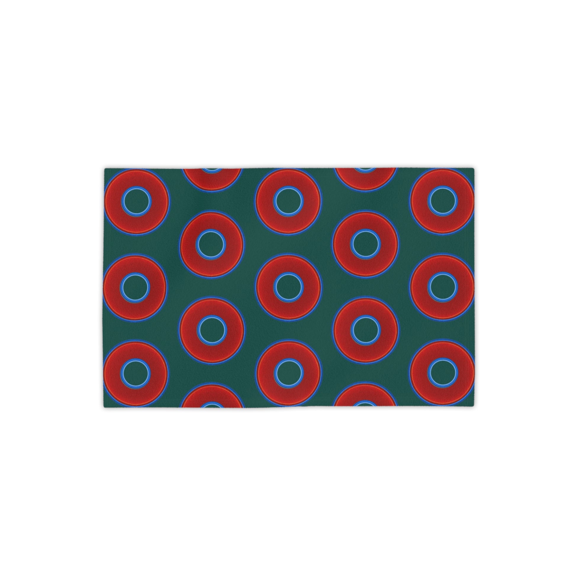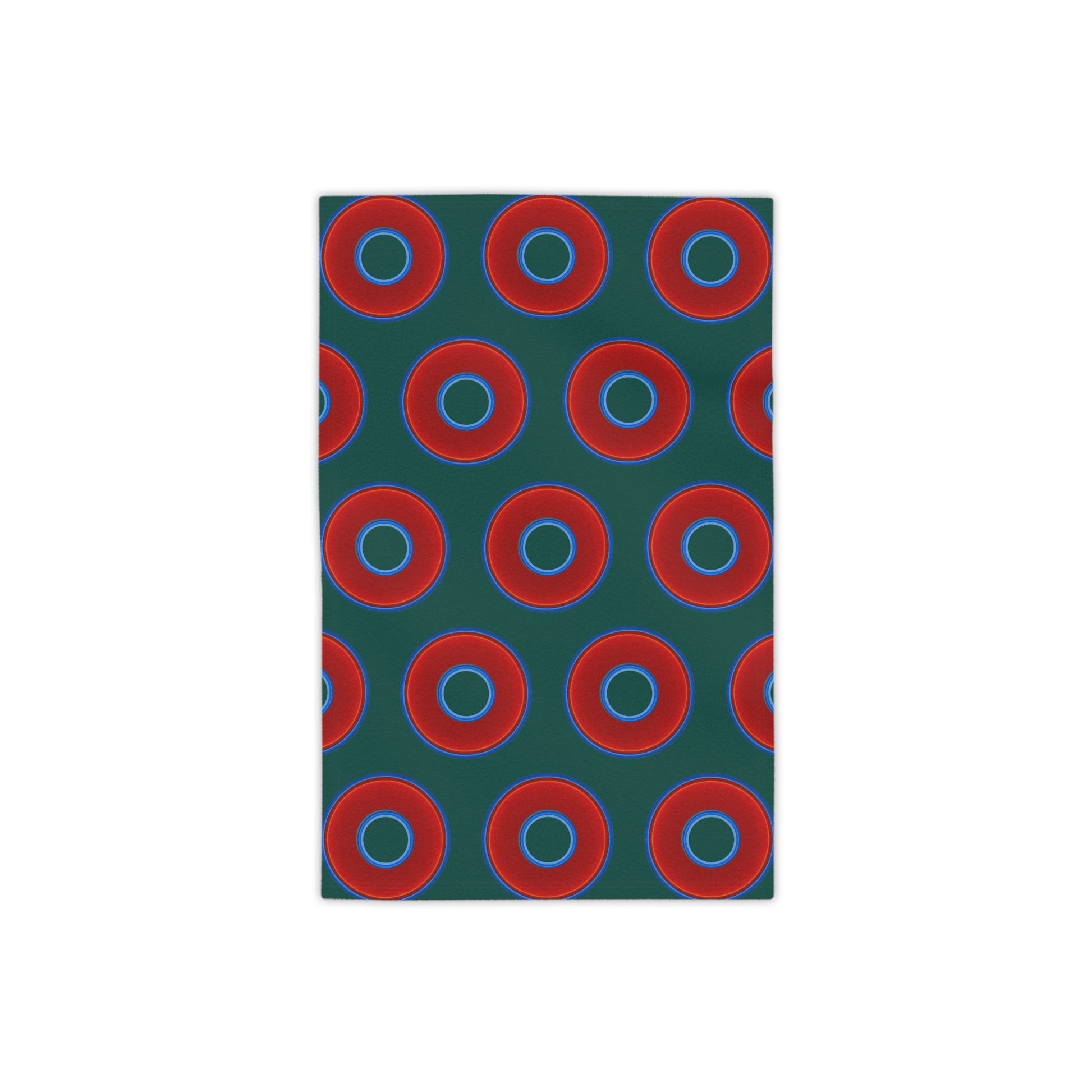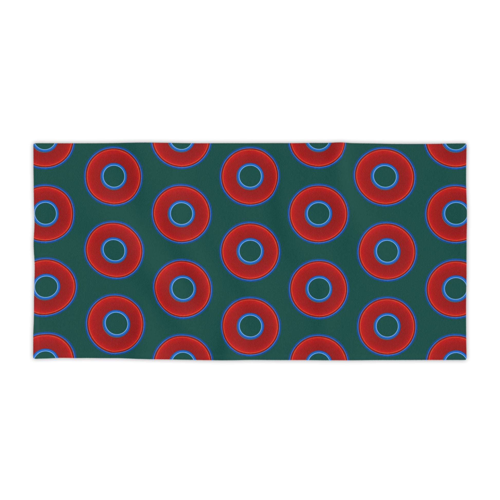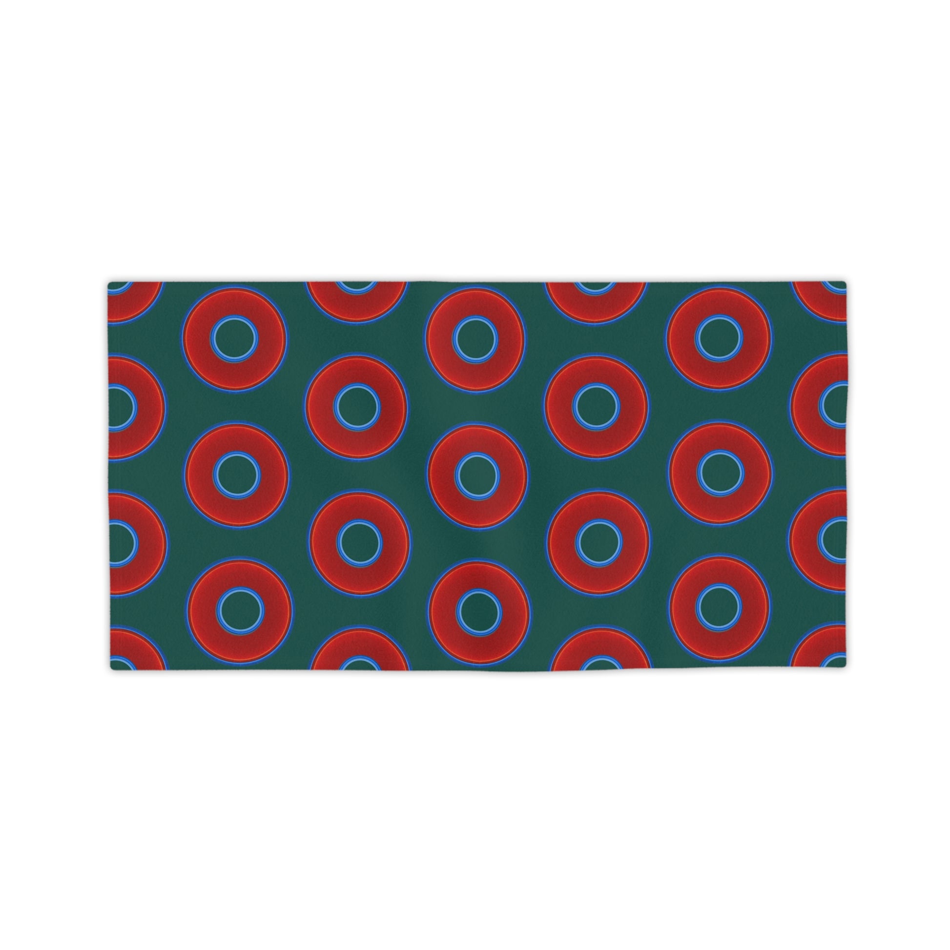 Lumpy Donut Towels - vivid red donuts w/dark Fenway green background