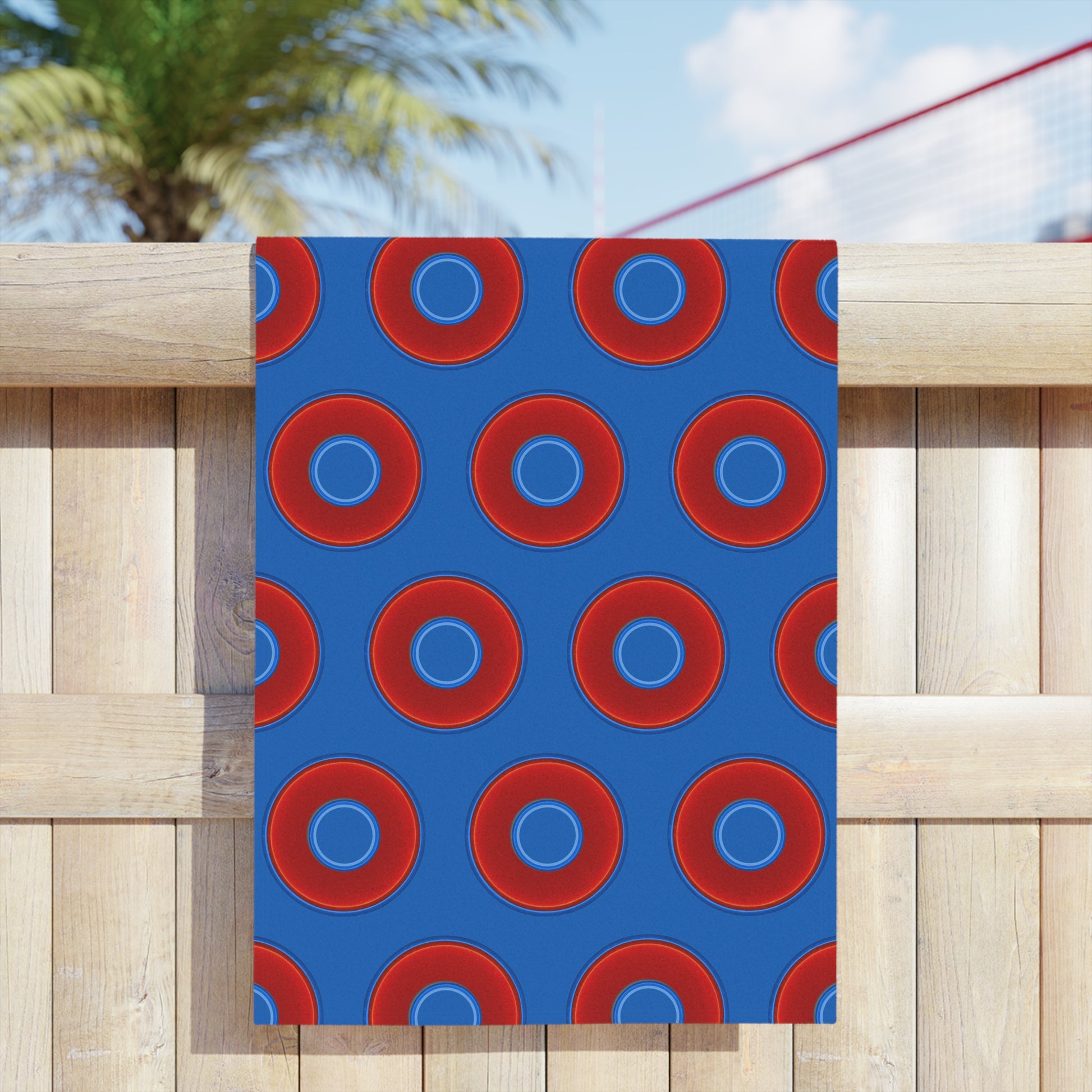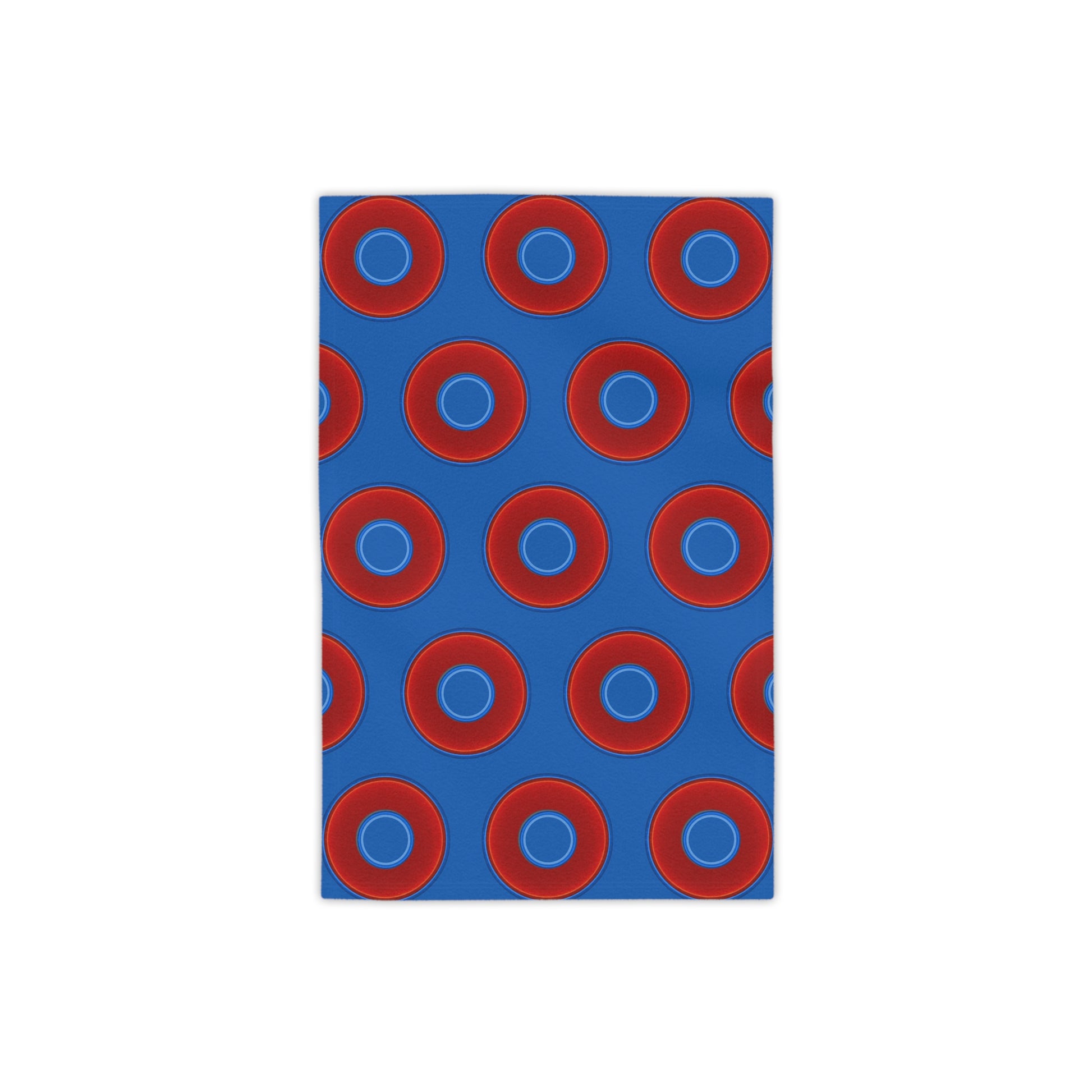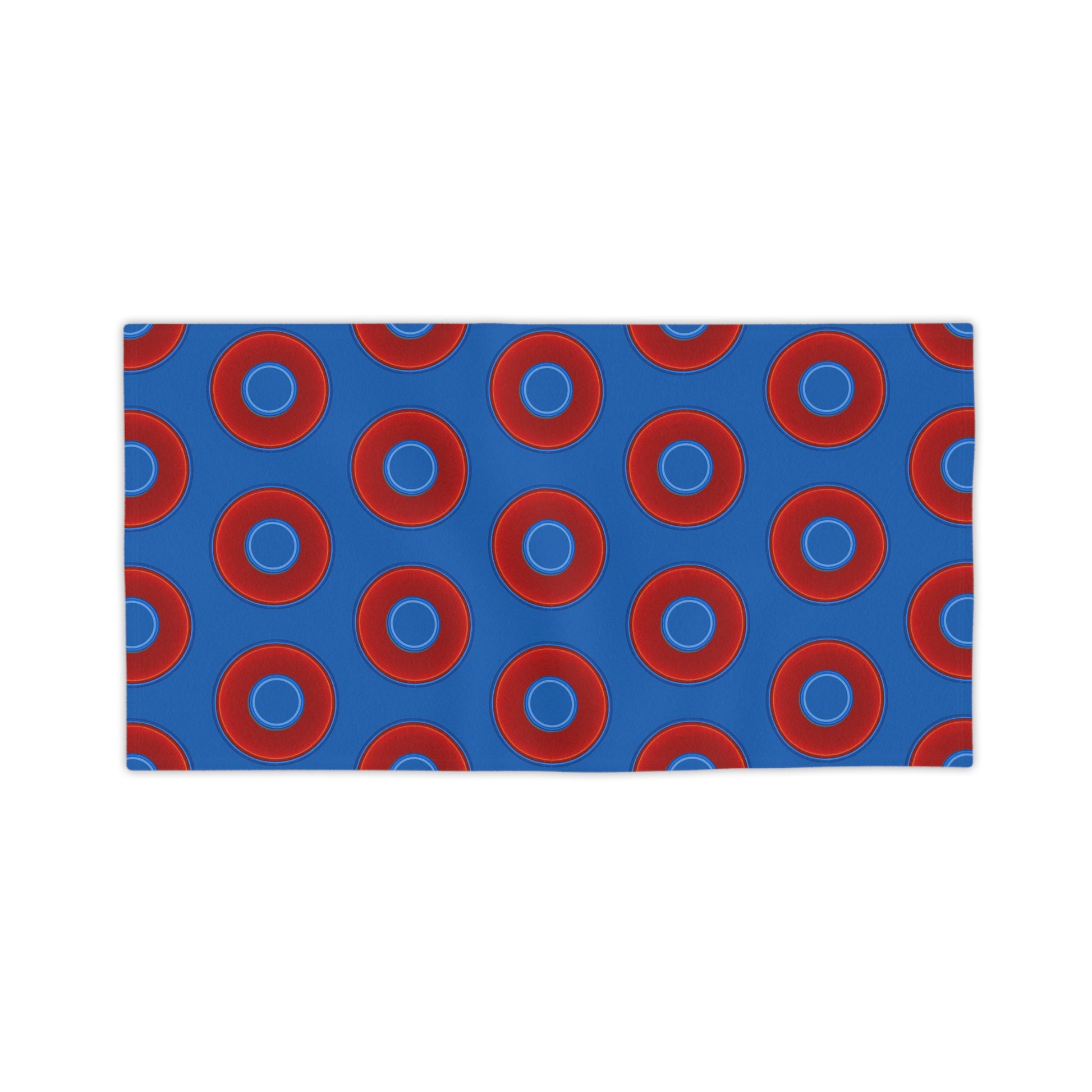 Lumpy Donut Towels - vivid red donuts w/dark royal blue background