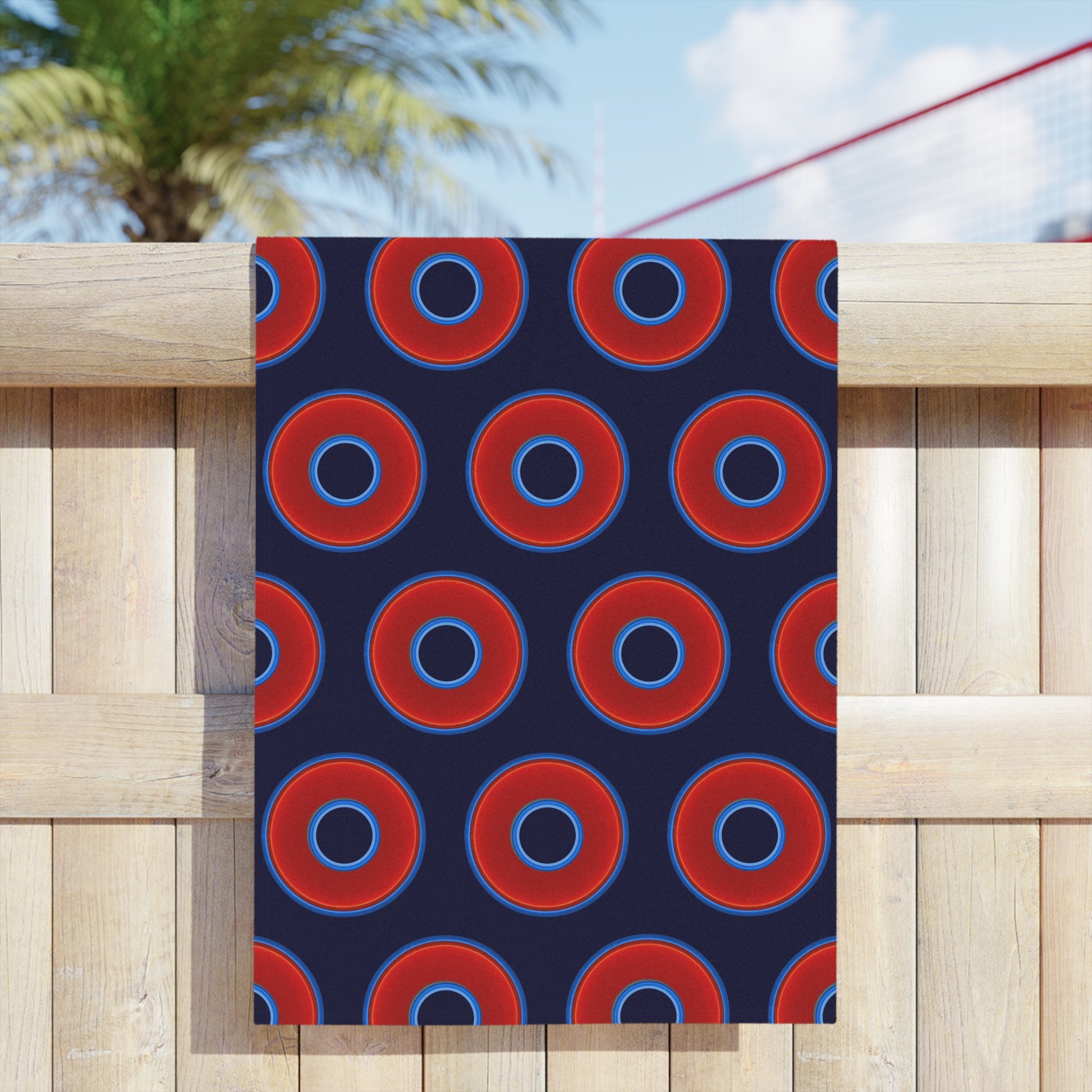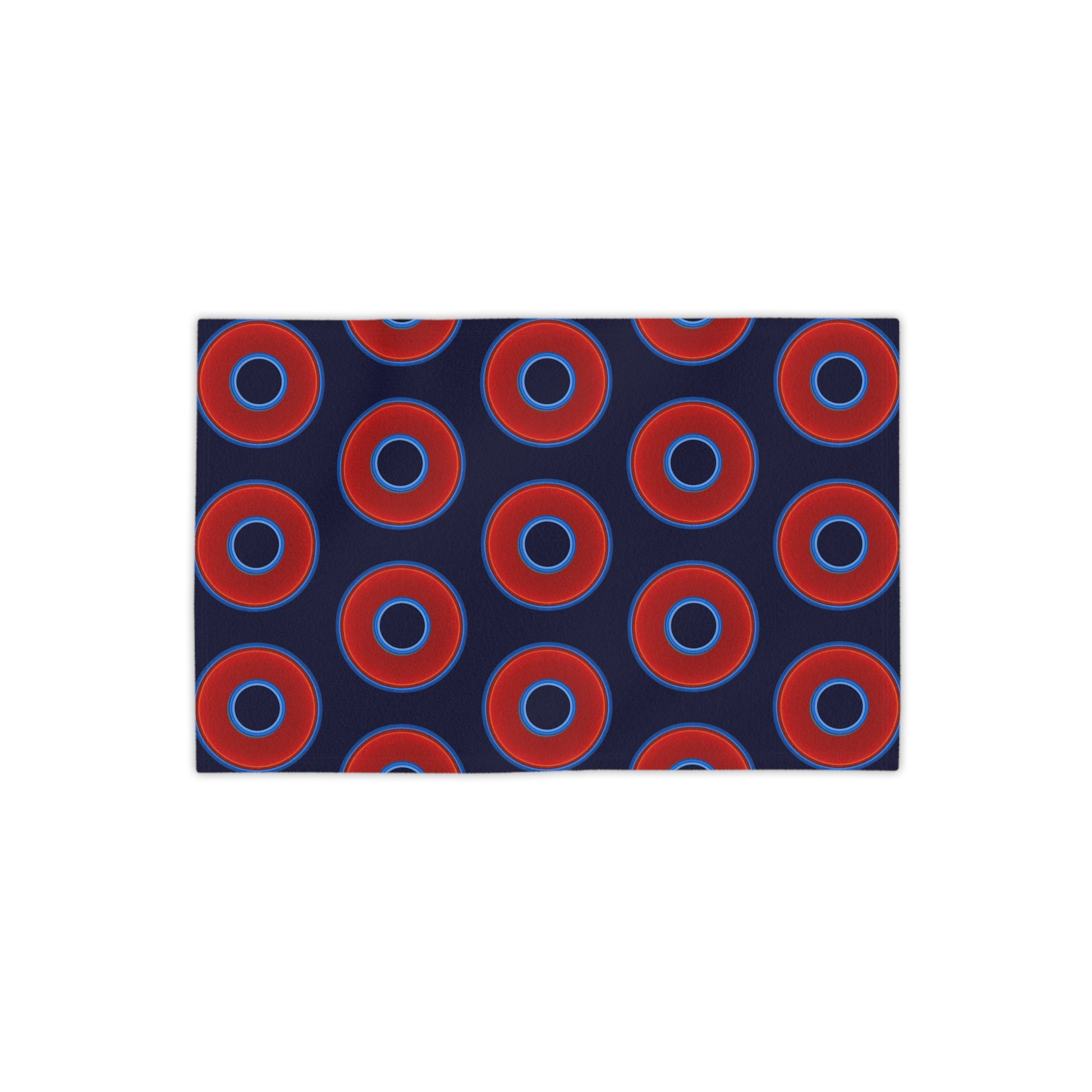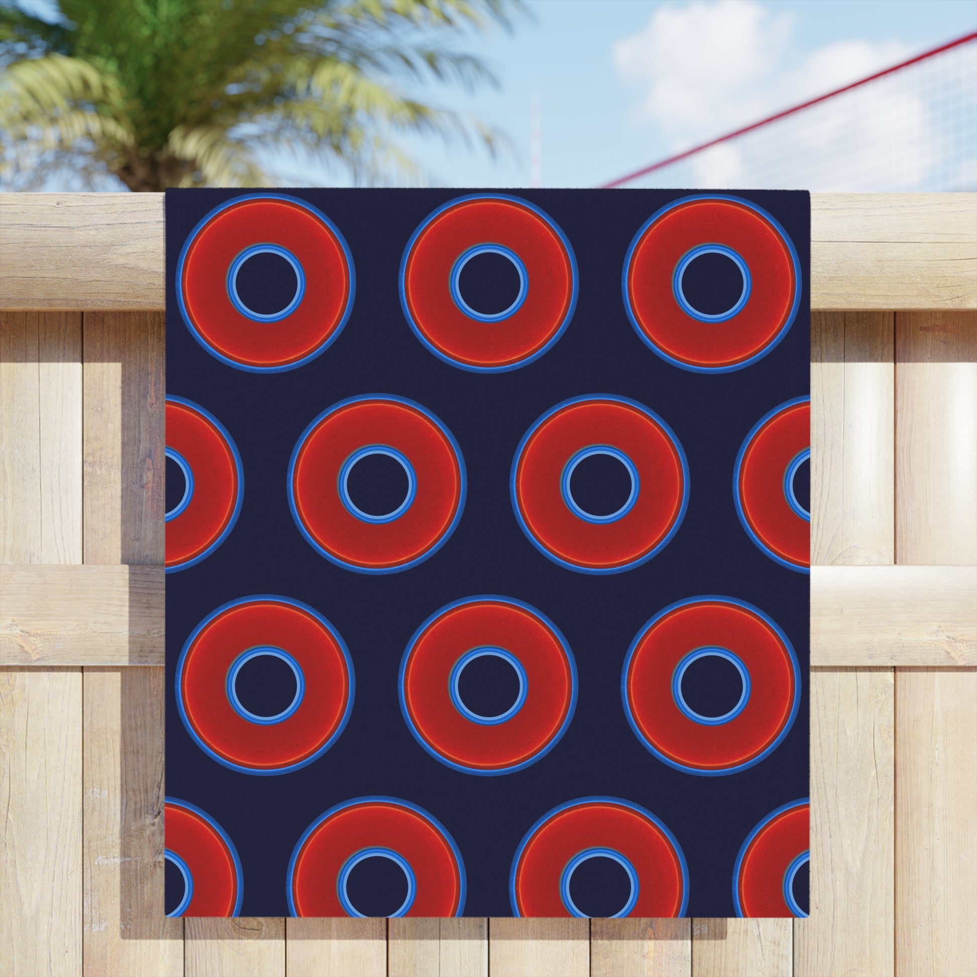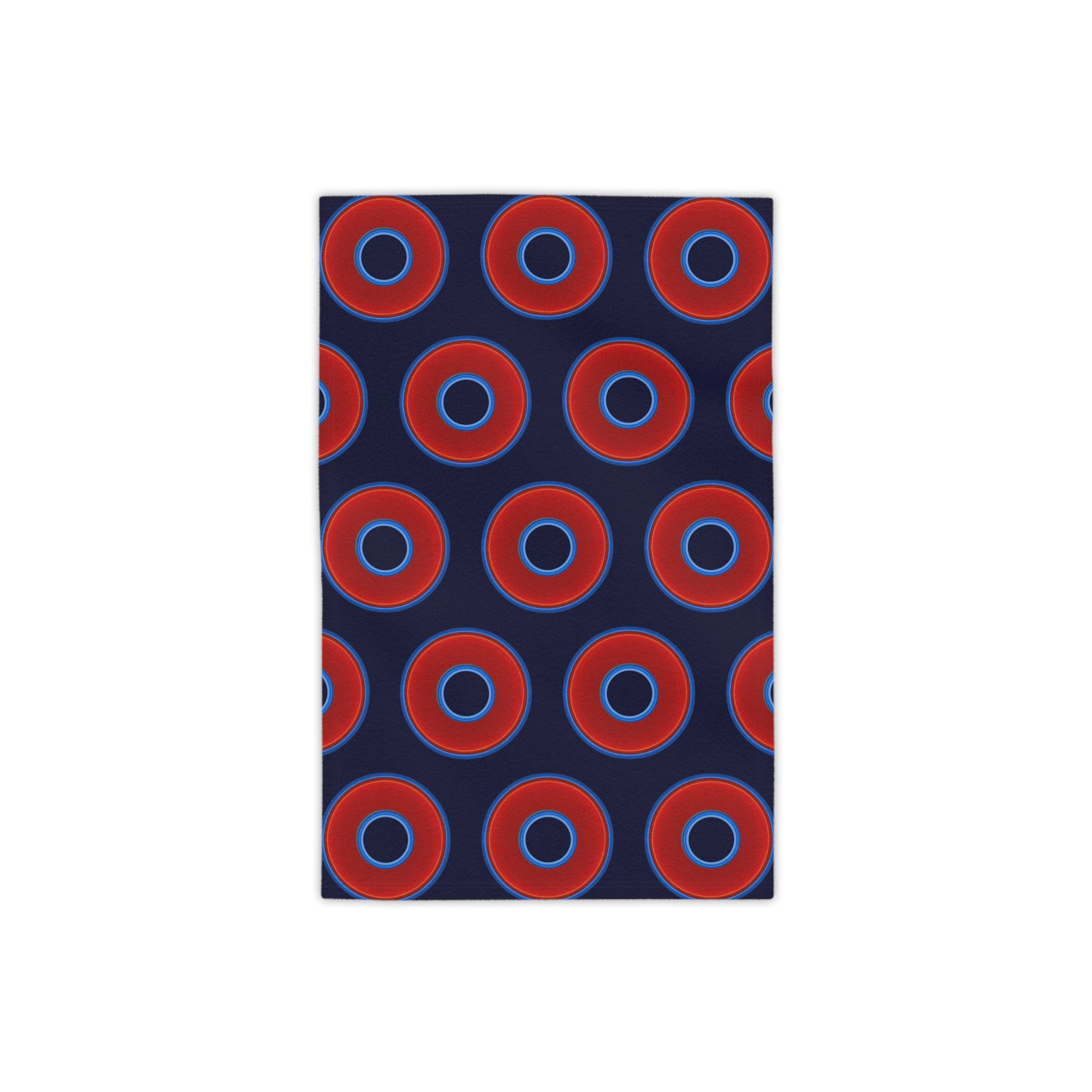 Lumpy Donut Towels - vivid red donuts w/midnight blue background