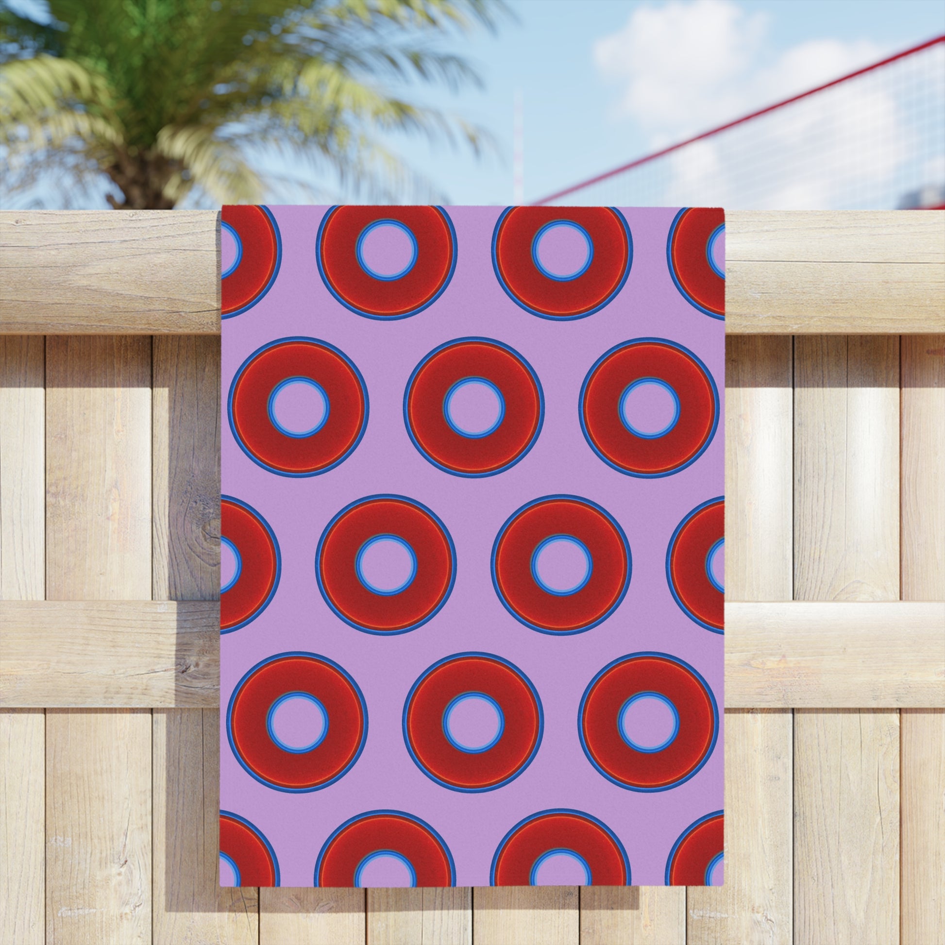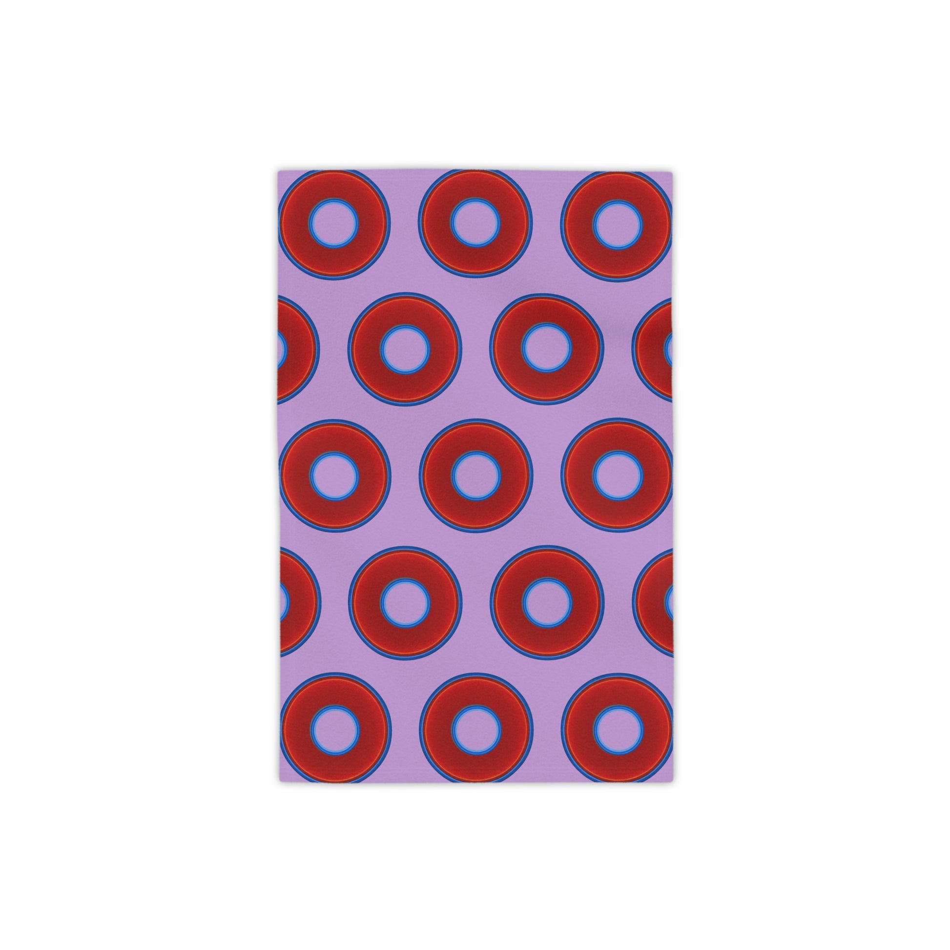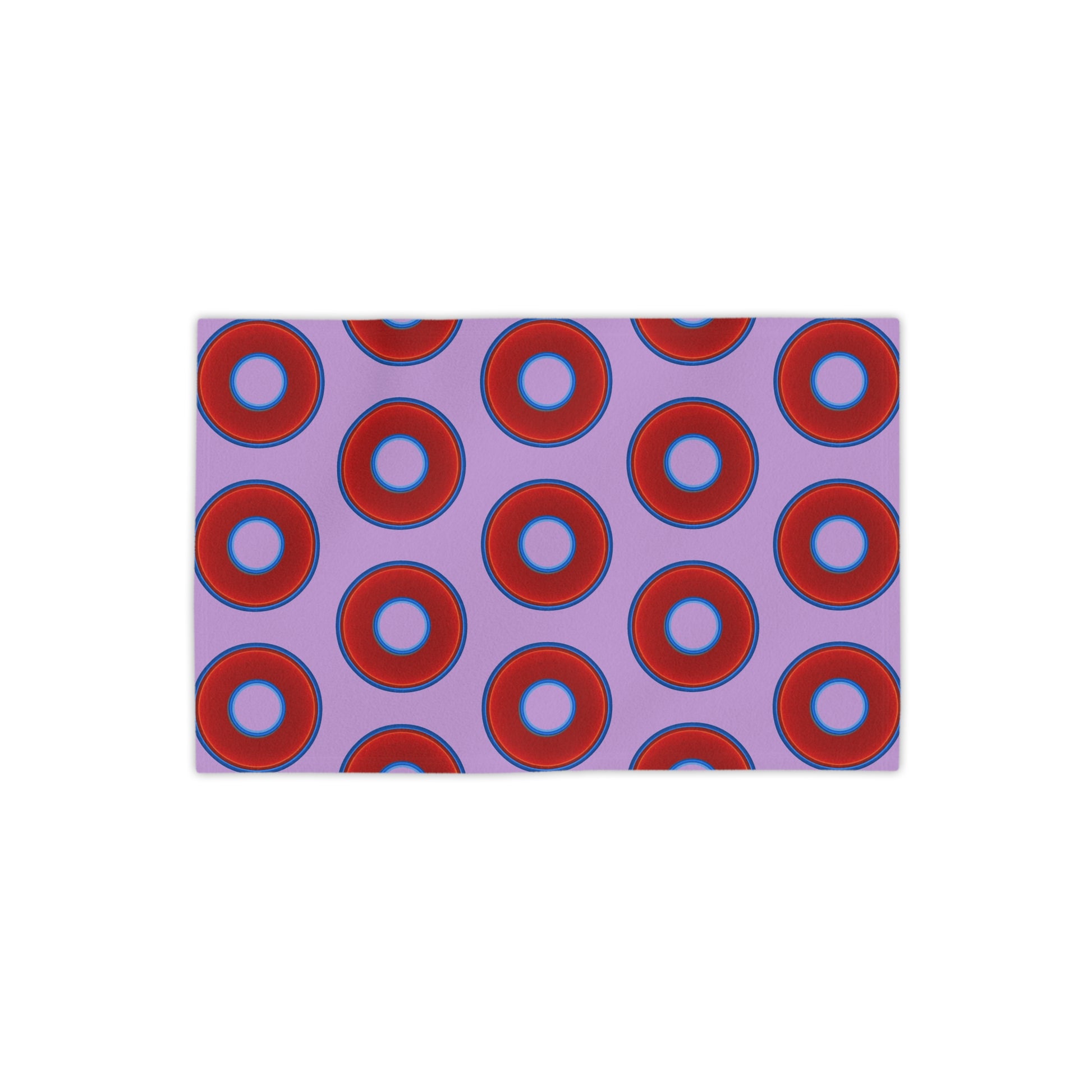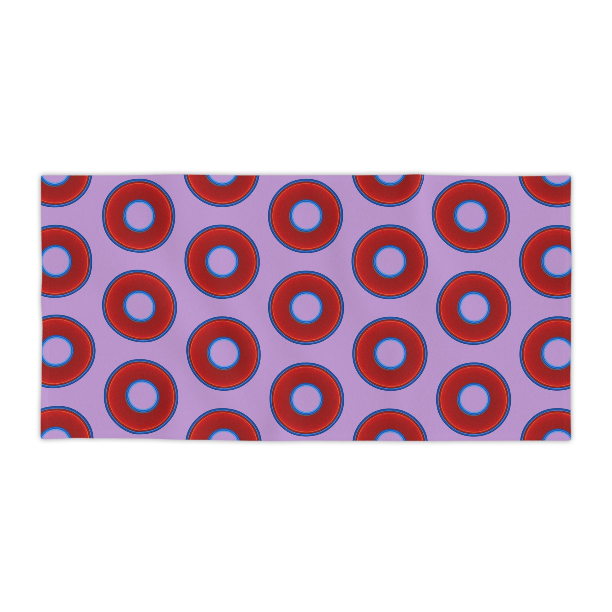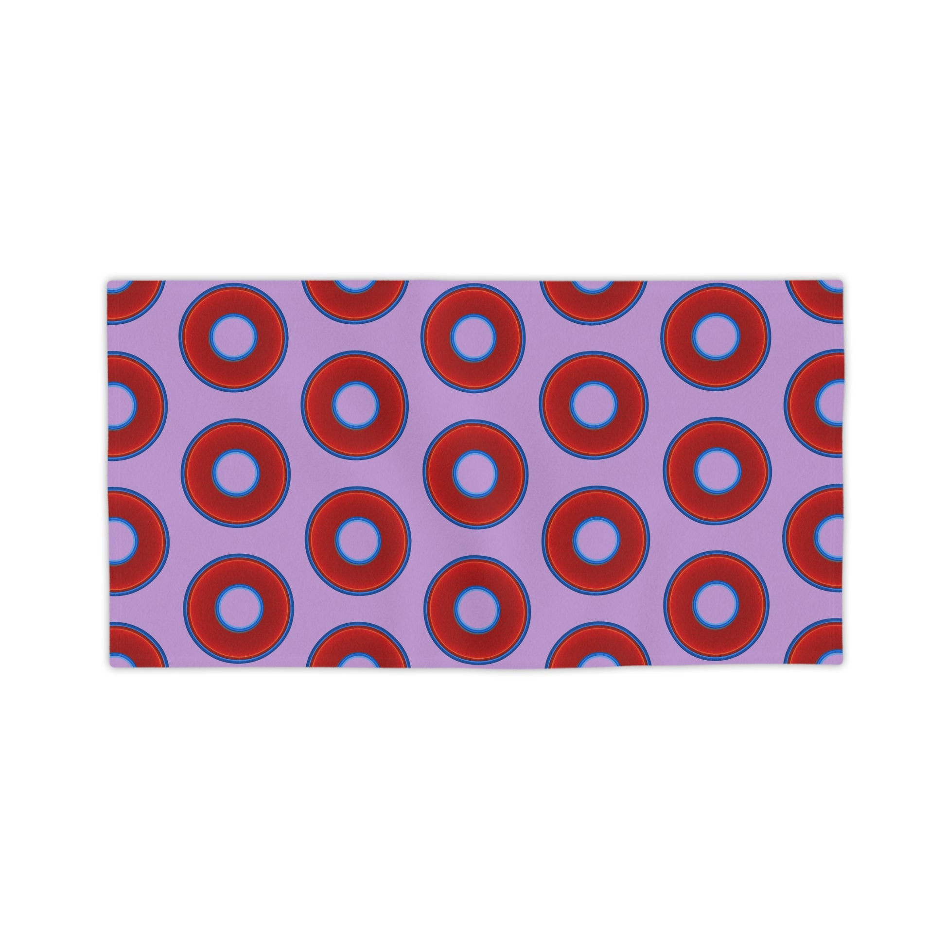 Lumpy Donut Towels - vivid red donuts w/wisteria purple background