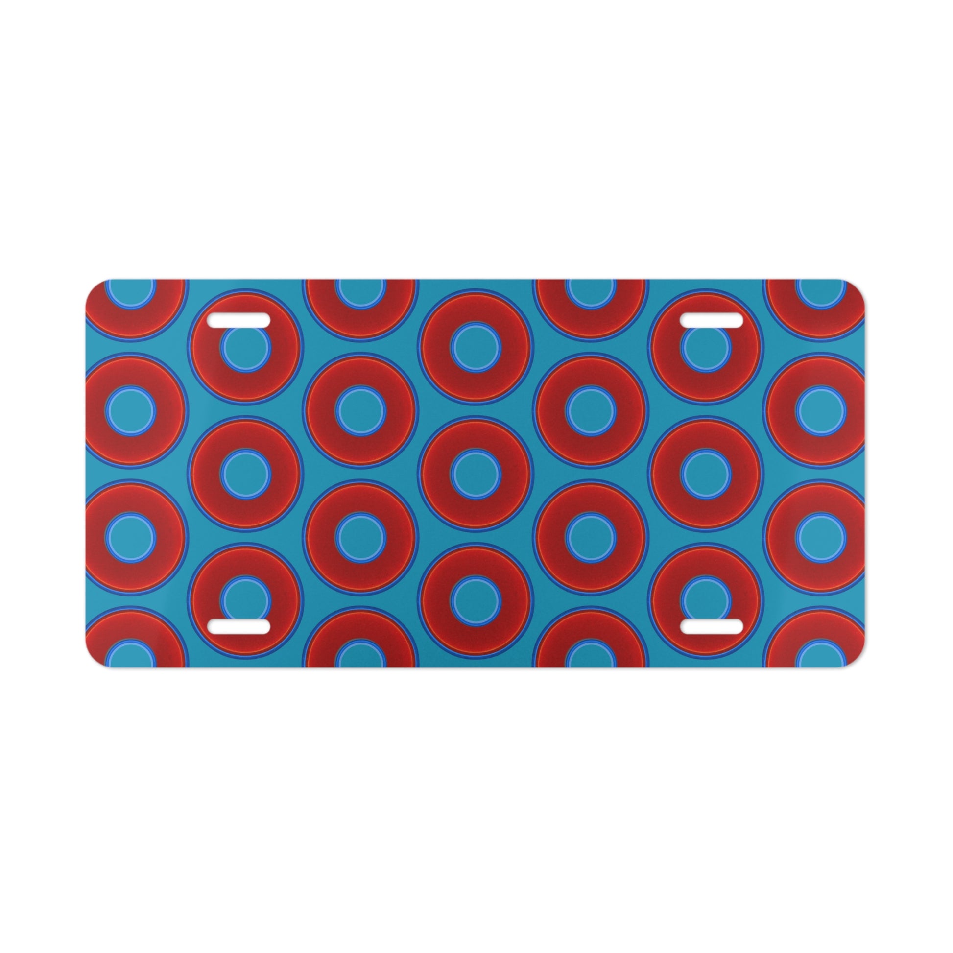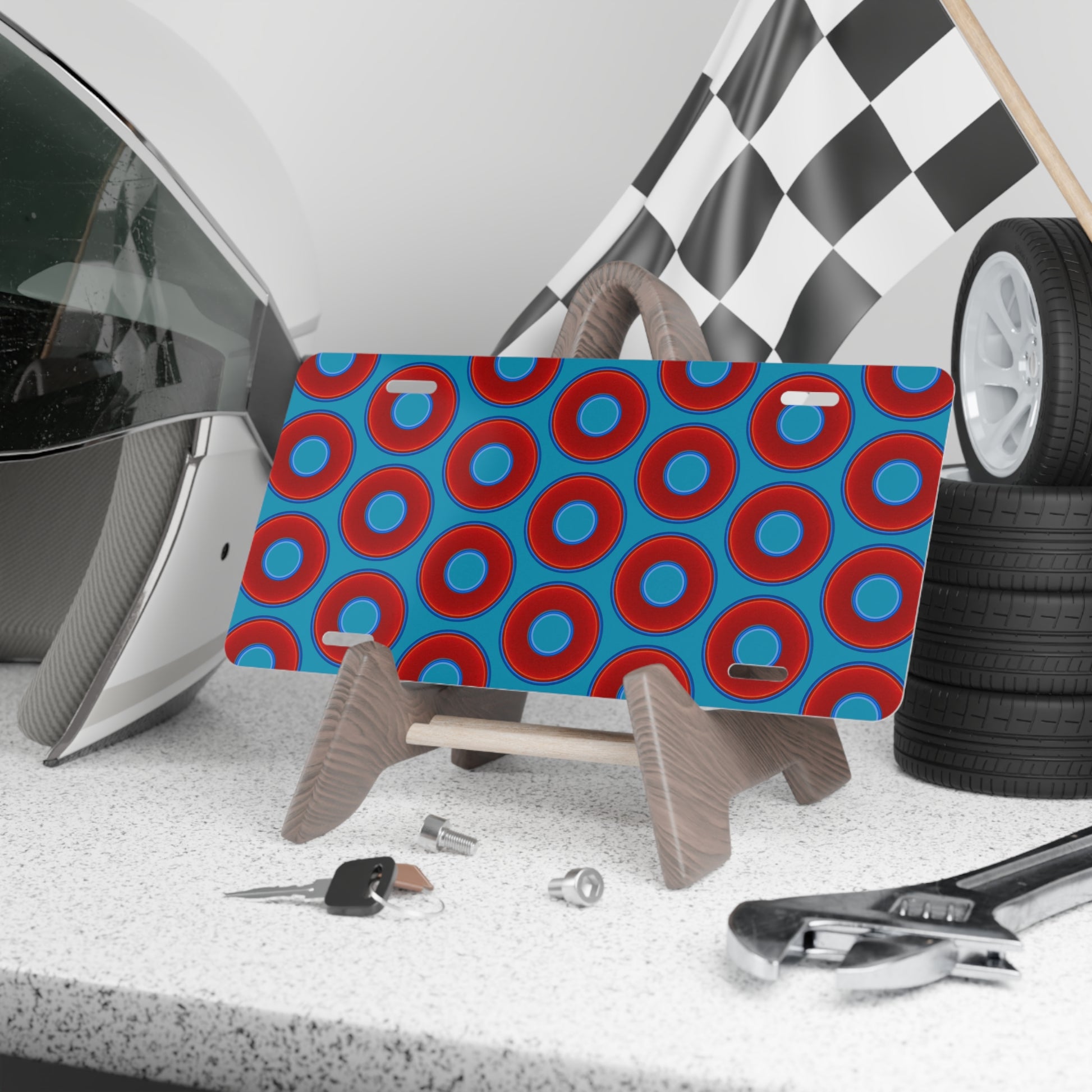 Lumpy Donut Vanity Plate - red vivid donut print w/aquamarine blue background