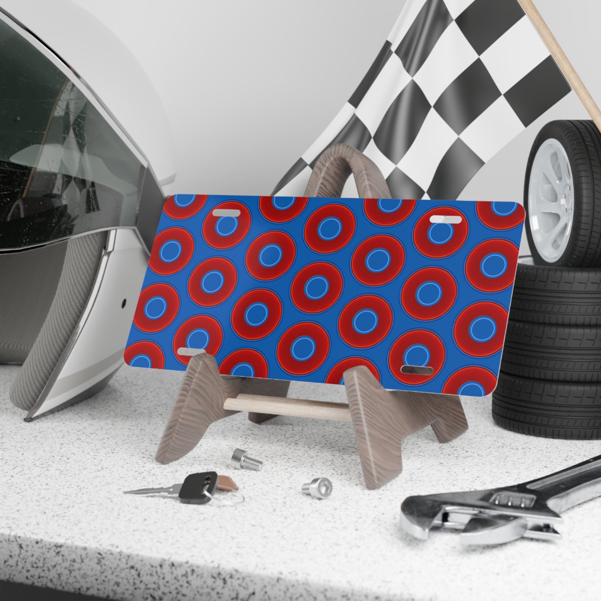 Lumpy Donut Vanity Plate - red vivid donut print w/dark royal blue background