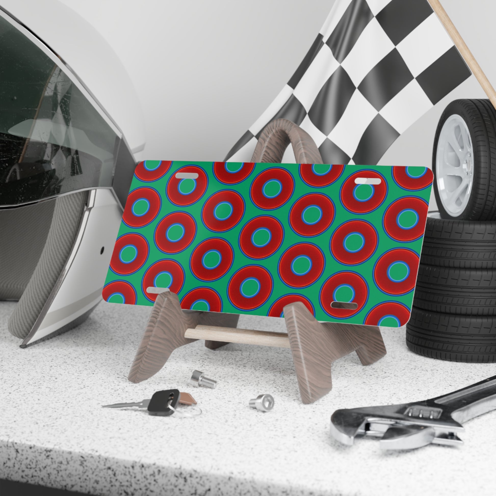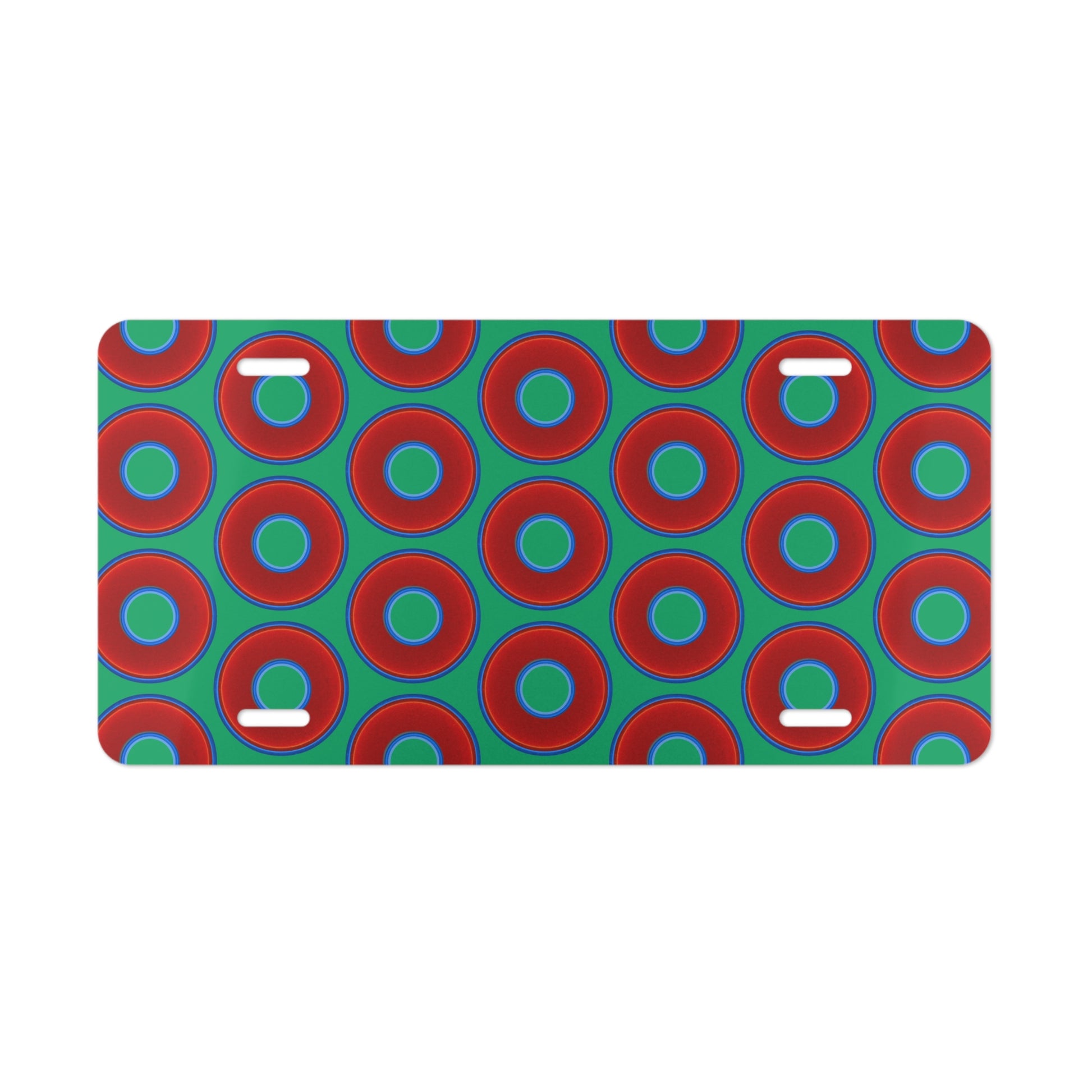 Lumpy Donut Vanity Plate - red vivid donut print w/jade green background