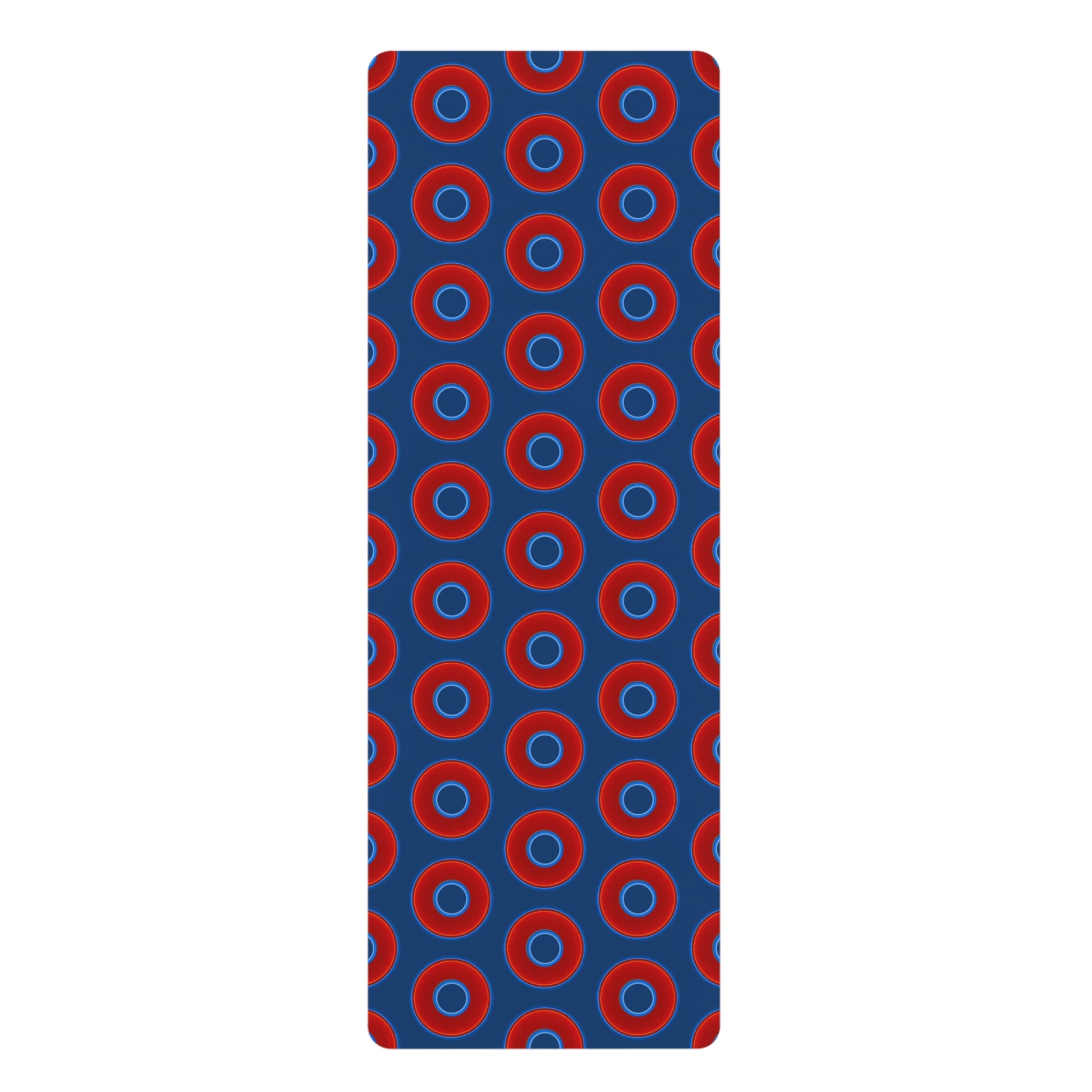 Lumpy Donut Yoga Mat :) - 24″ x 70" - vivid red donut print w/Atlantic navy blue background