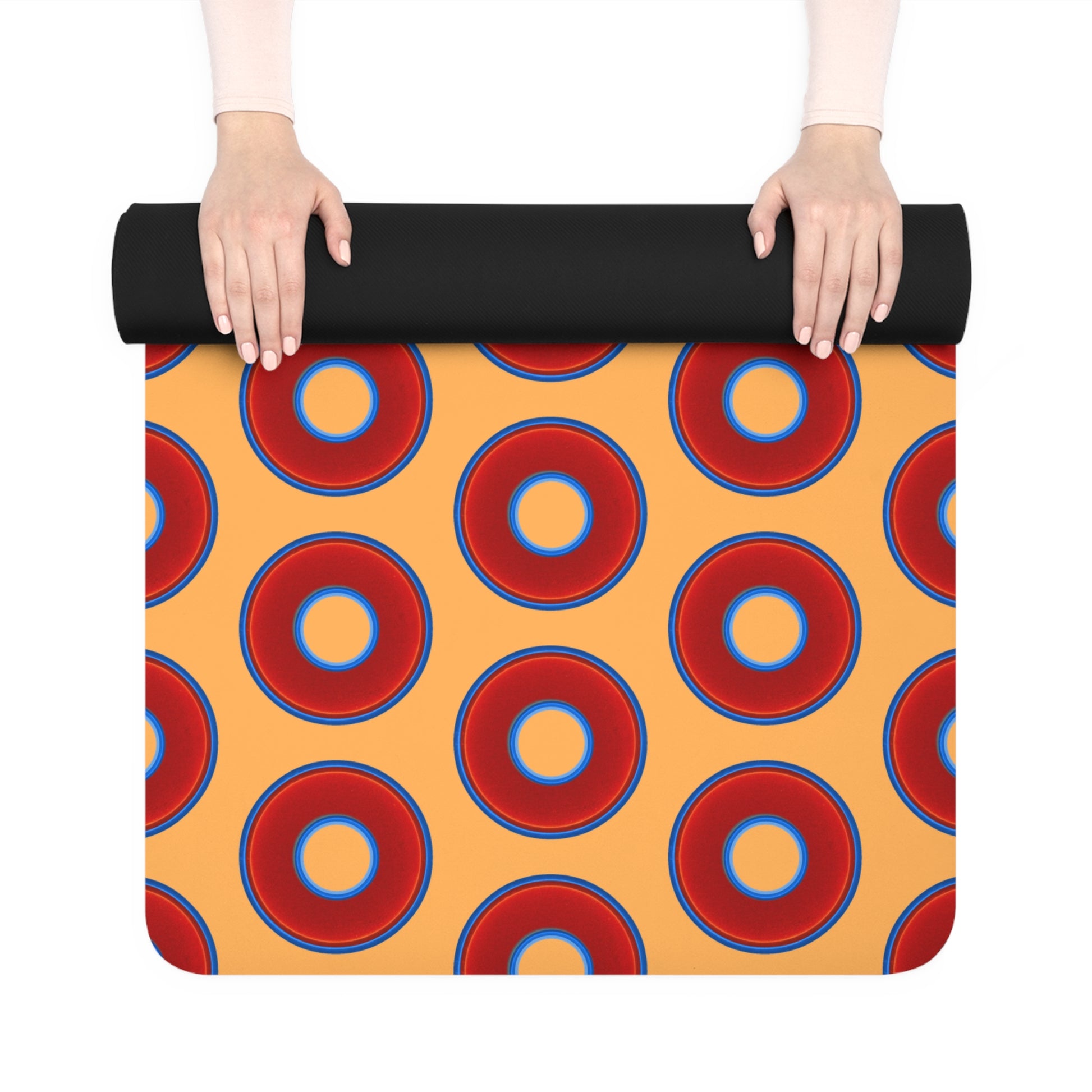 Lumpy Donut Yoga Mat :) - 24″ x 70" - vivid red donut print w/creamsicle background