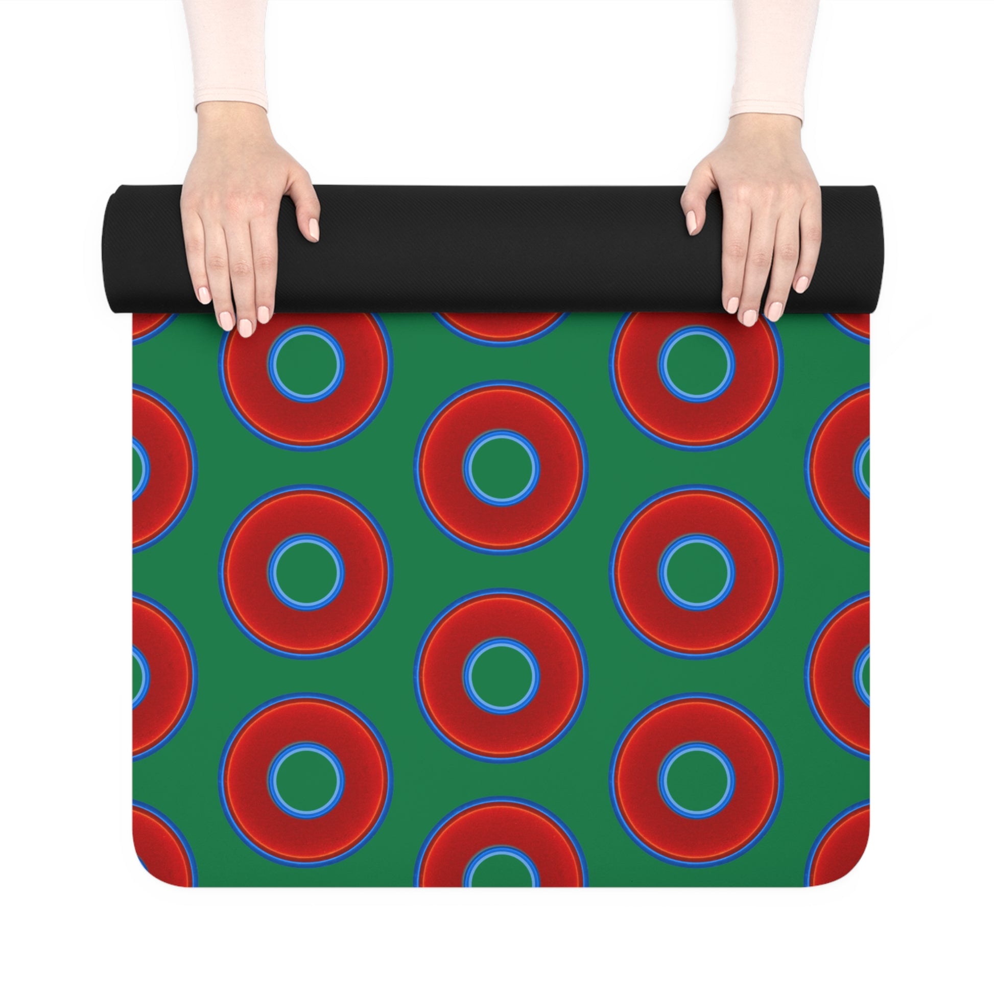 Lumpy Donut Yoga Mat :) - 24″ x 70" - vivid red donut print w/dark green background