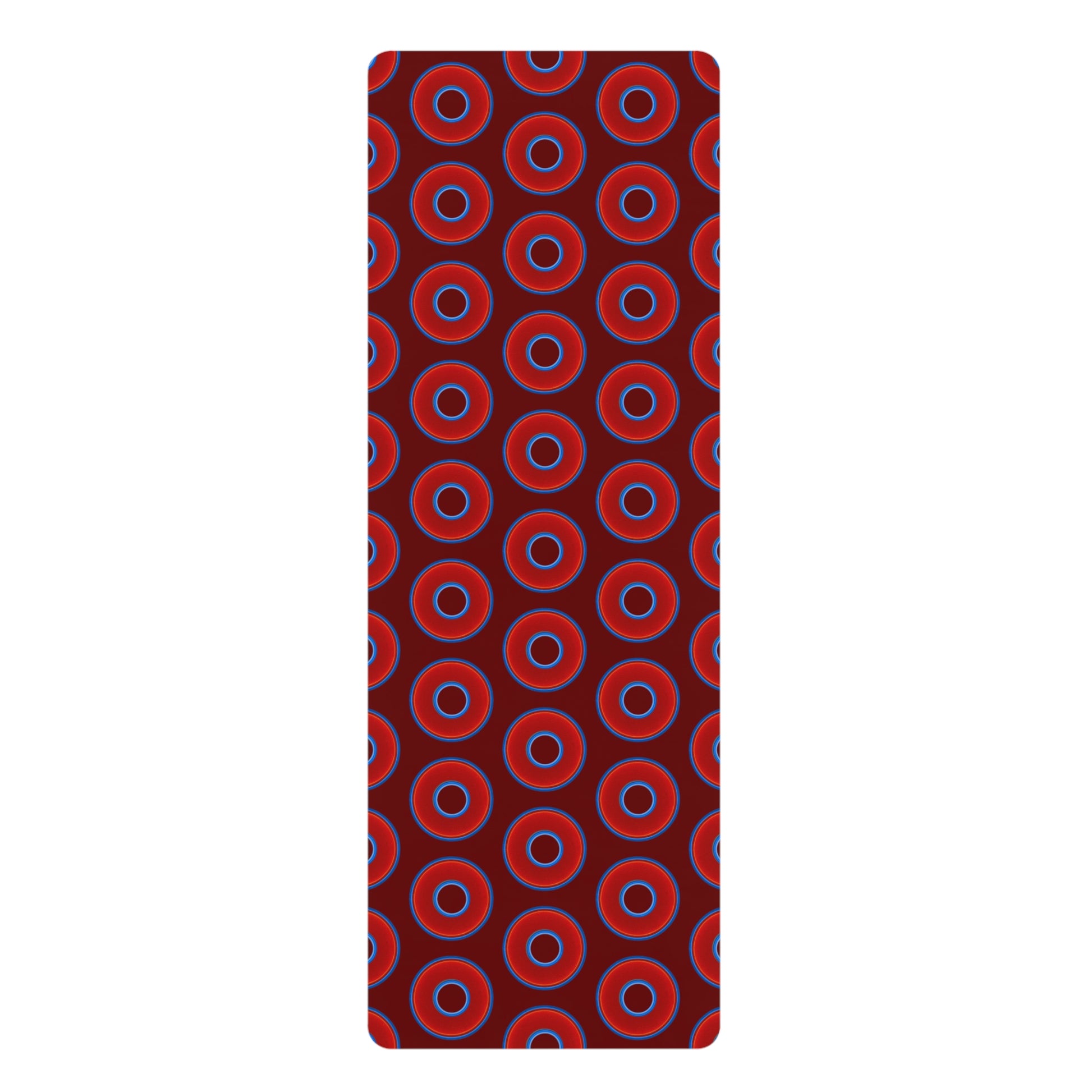 Lumpy Donut Yoga Mat :) - 24″ x 70" - vivid red donut print w/dark red background