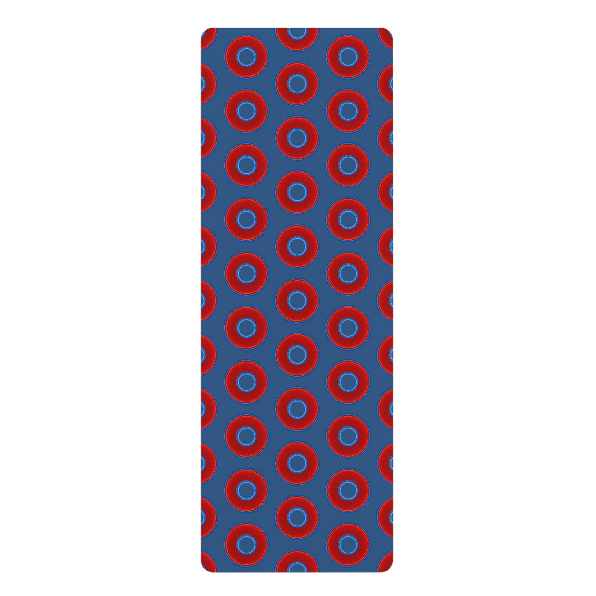 Lumpy Donut Yoga Mat :) - 24″ x 70" - vivid red donut print w/light navy blue background