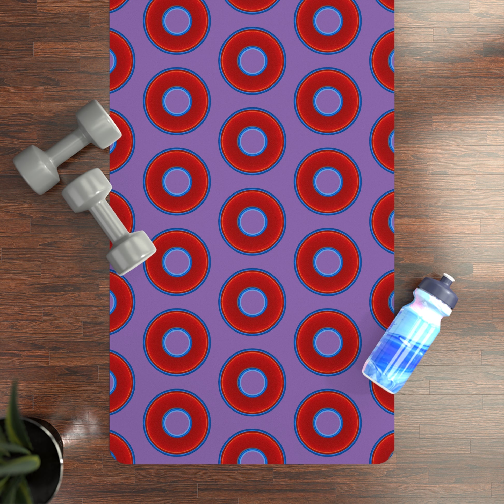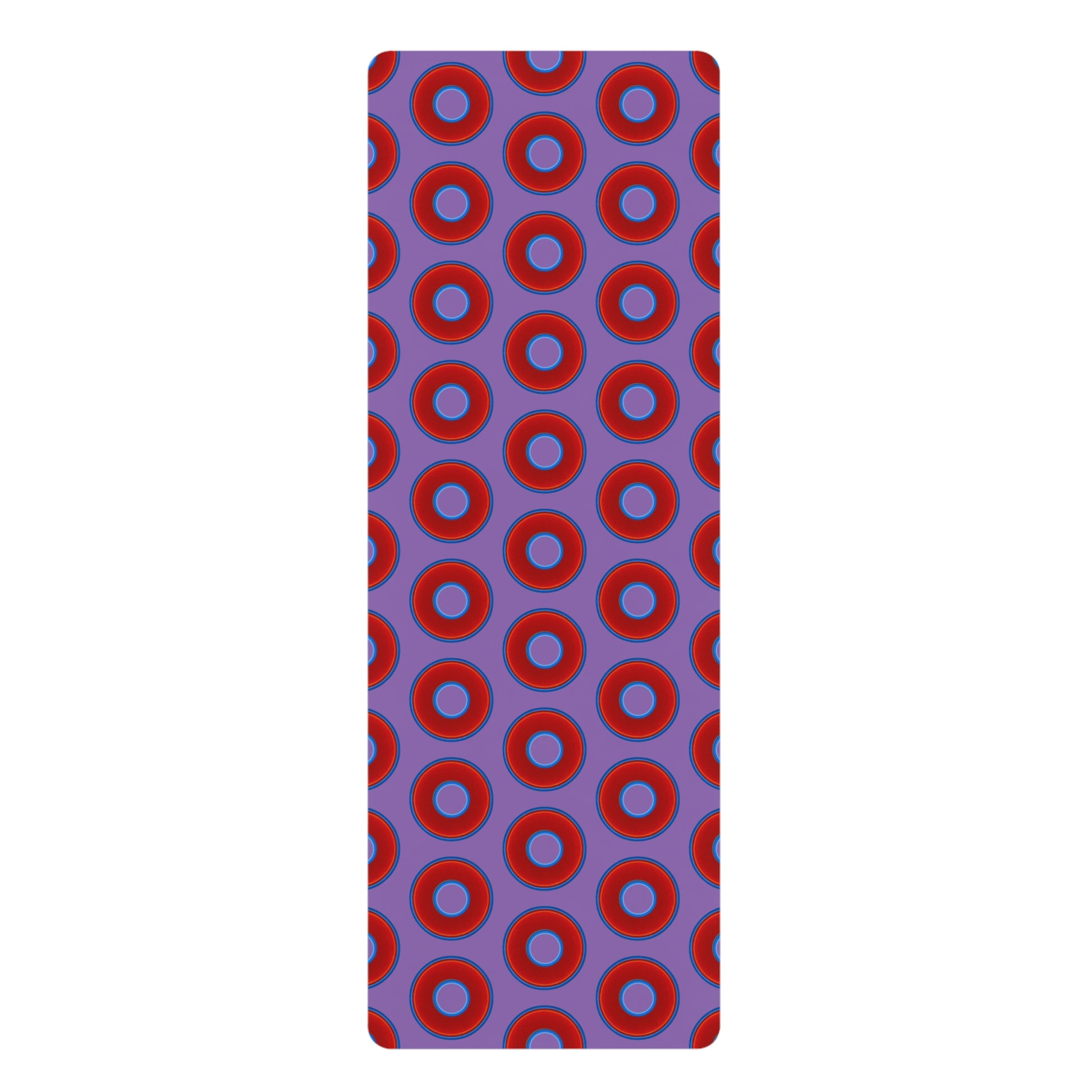 Lumpy Donut Yoga Mat :) - 24″ x 70" - vivid red donut print w/light purple background