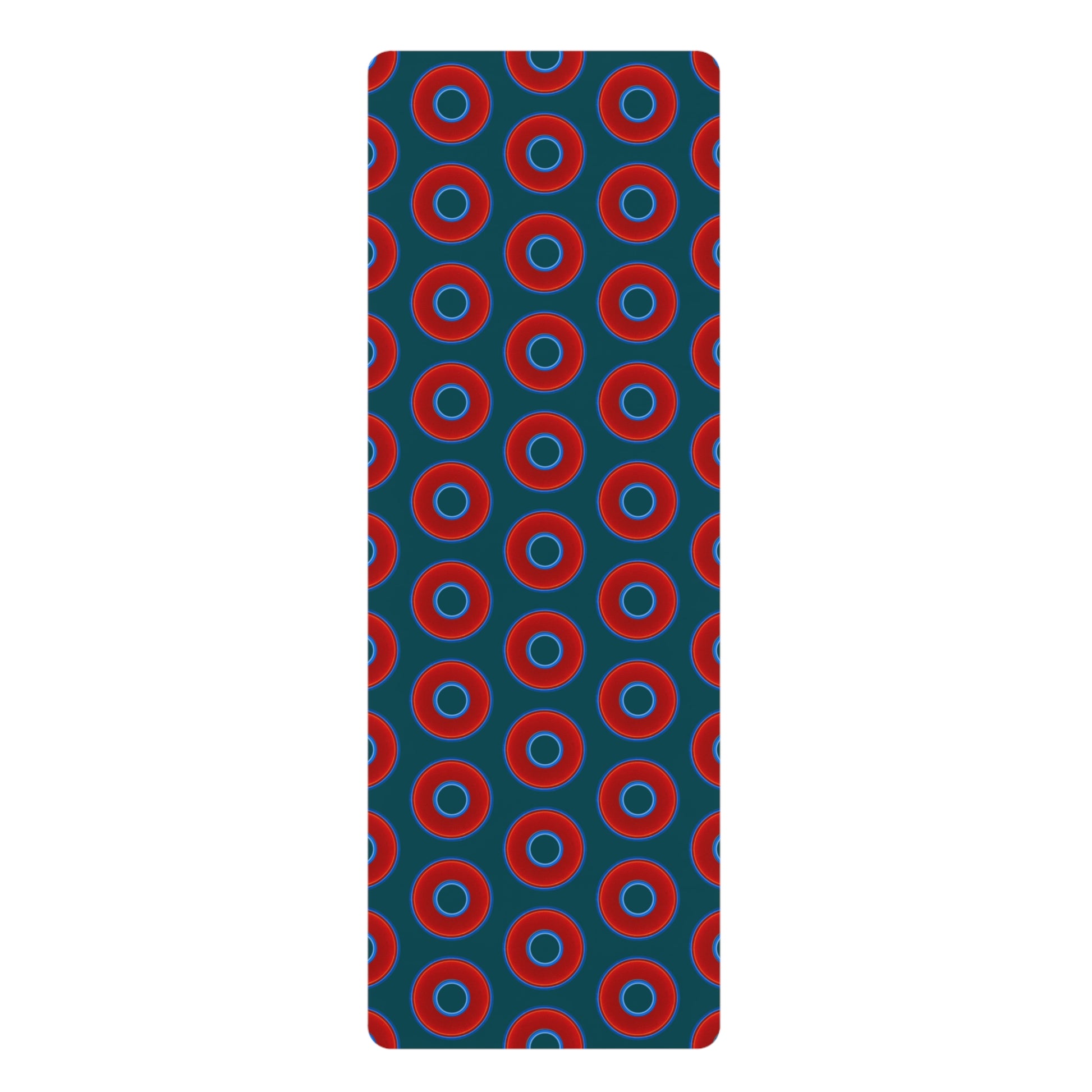 Lumpy Donut Yoga Mat :) - 24″ x 70" - vivid red donut print w/midnight teal green background