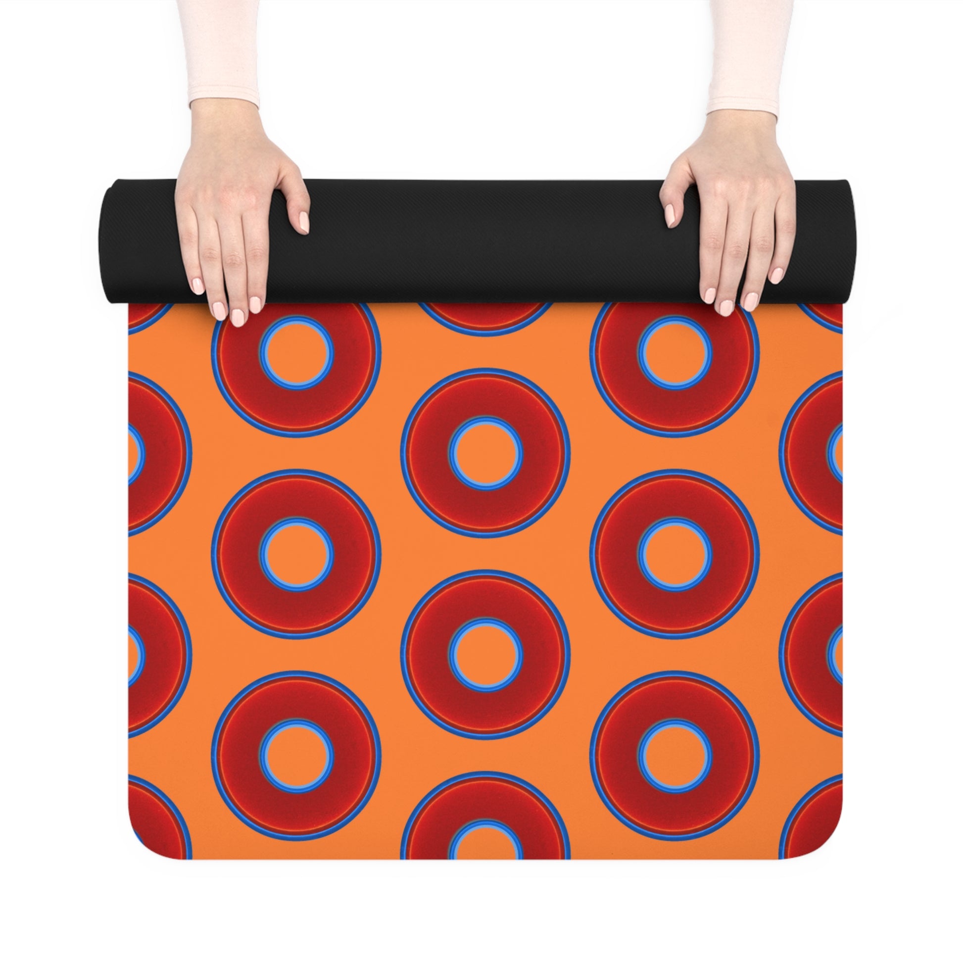 Lumpy Donut Yoga Mat :) - 24″ x 70" - vivid red donut print w/orange background