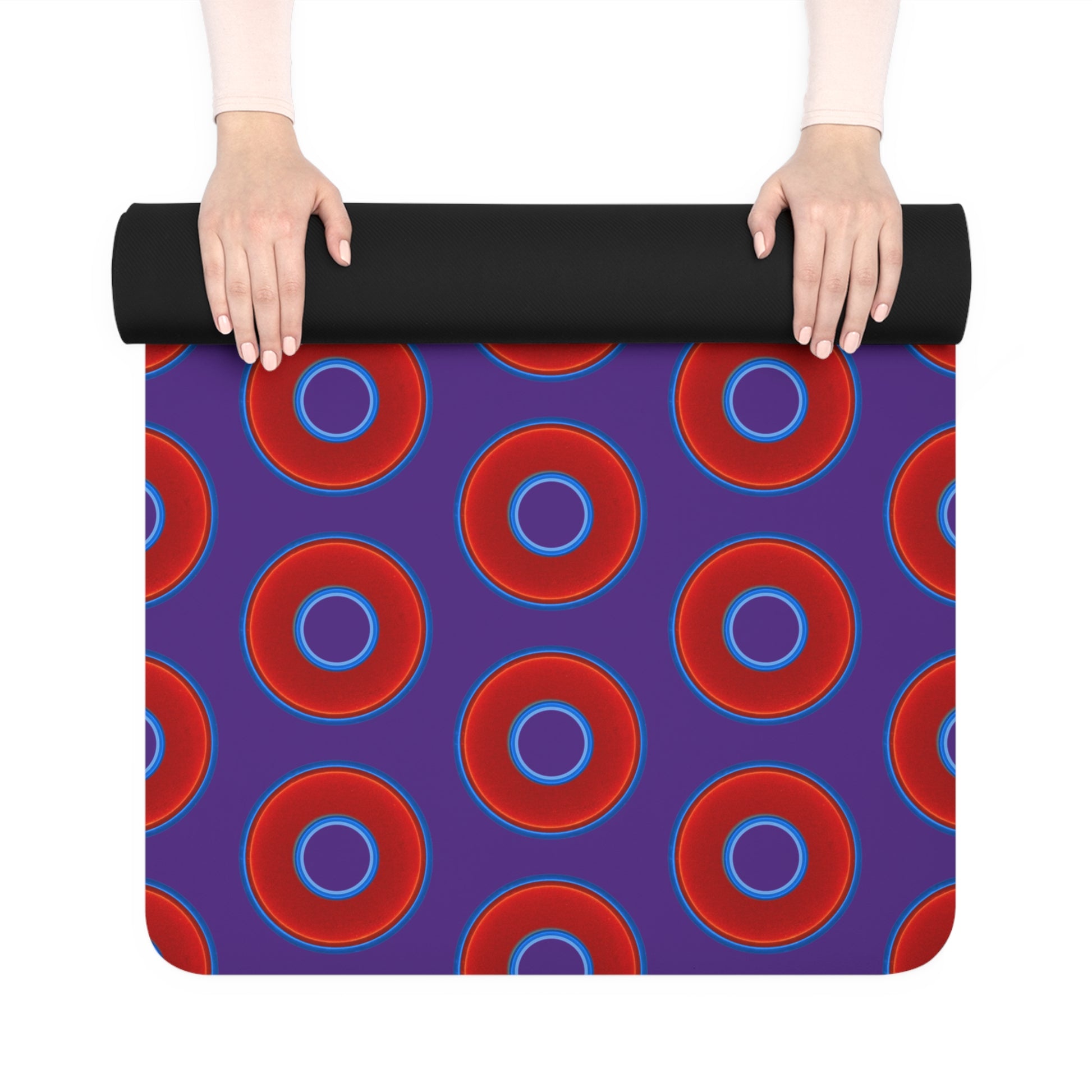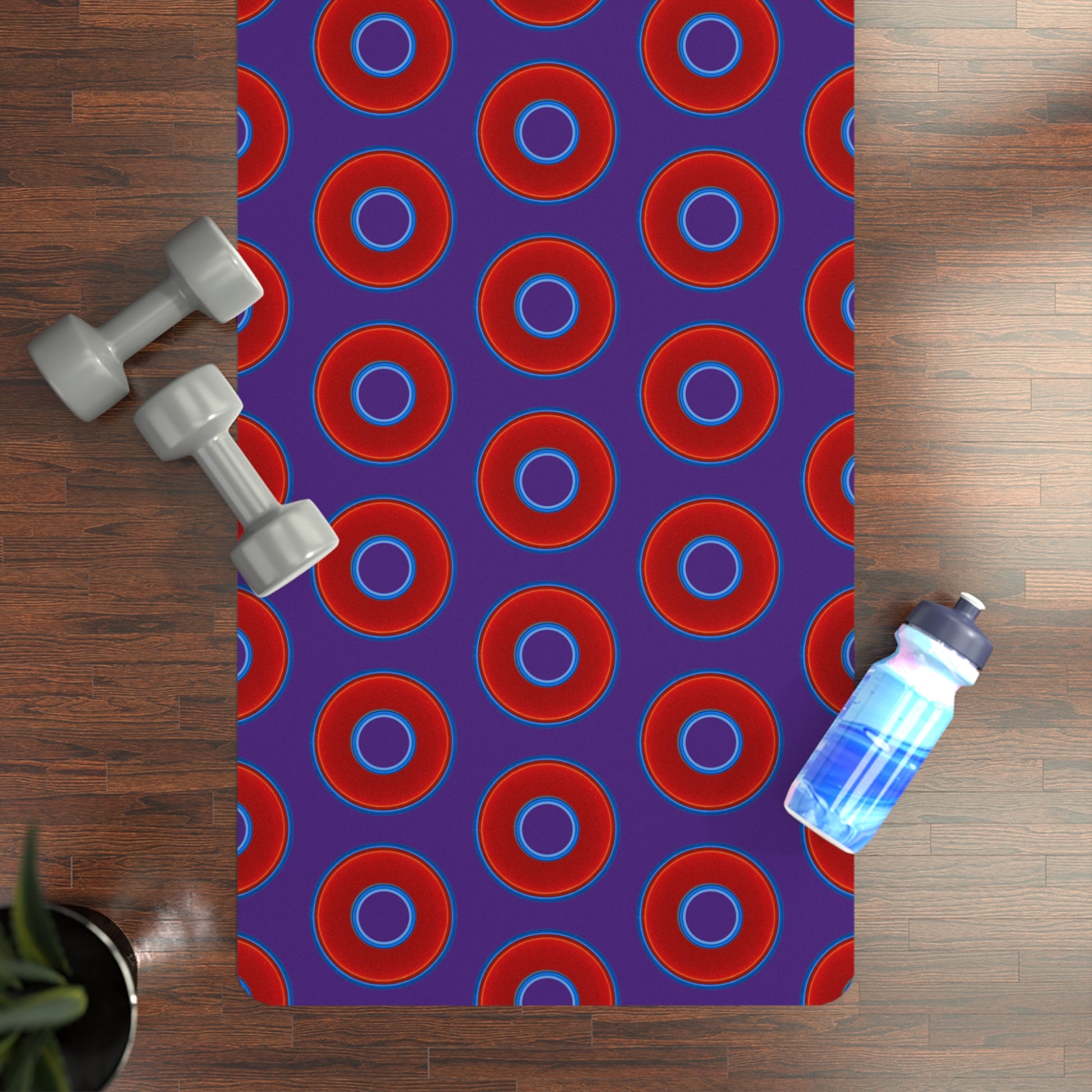 Lumpy Donut Yoga Mat :) - 24″ x 70" - vivid red donut print w/purple background