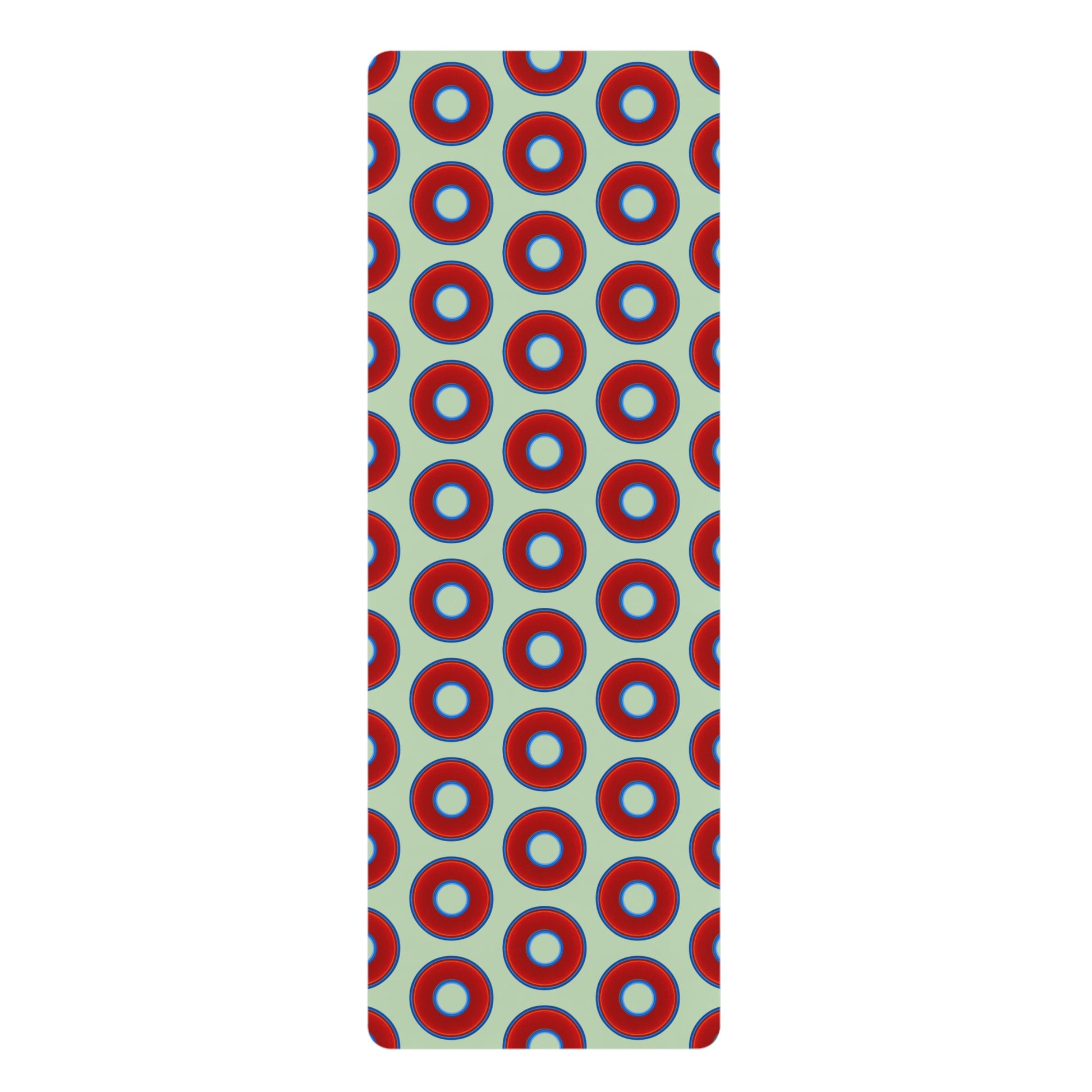 Lumpy Donut Yoga Mat :) - 24″ x 70" - vivid red donut print w/seafoam green background