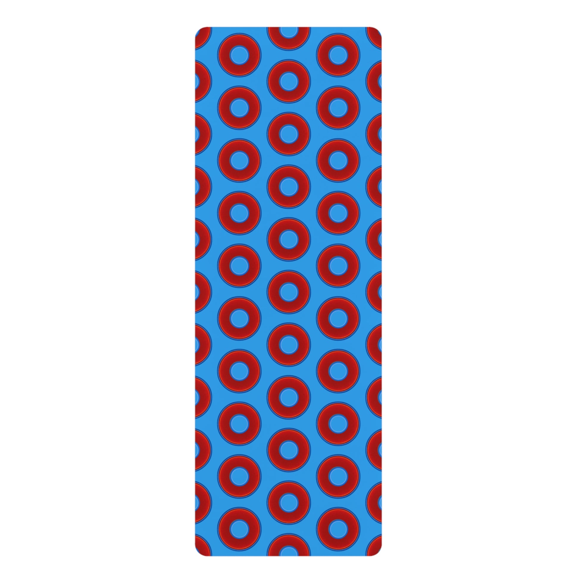 Lumpy Donut Yoga Mat :) - 24″ x 70" - vivid red donut print w/sky royal blue background