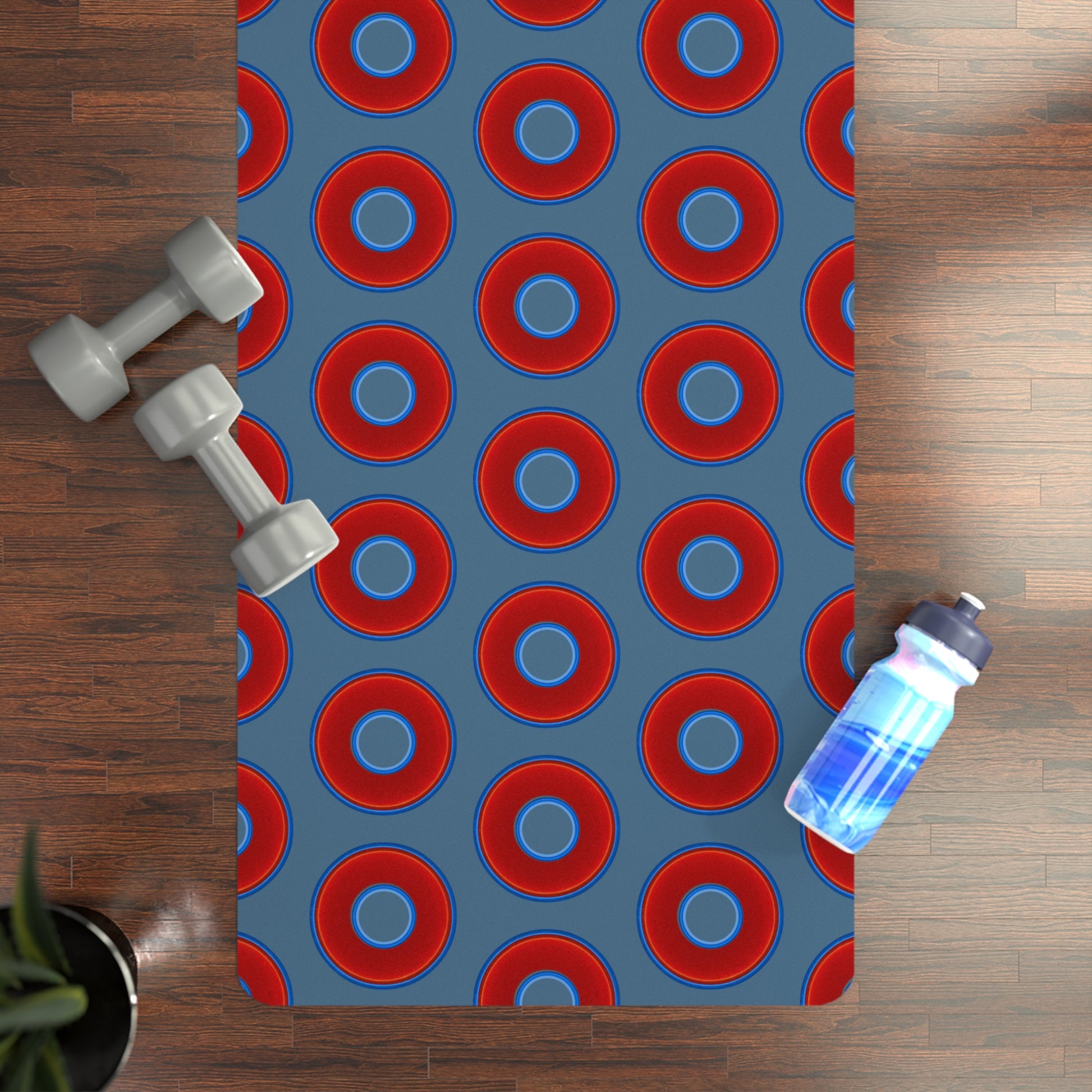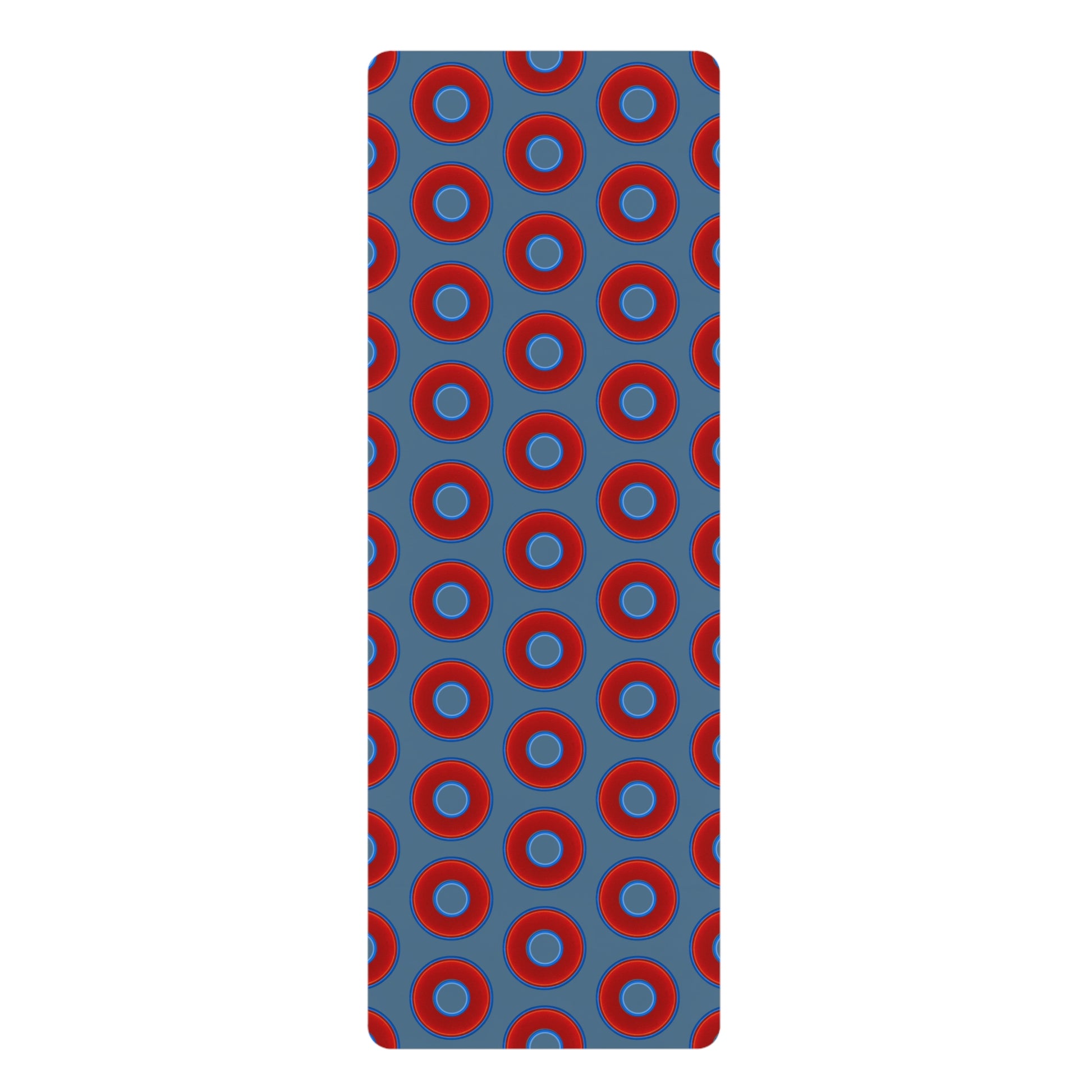 Lumpy Donut Yoga Mat :) - 24″ x 70" - vivid red donut print w/steel blue background