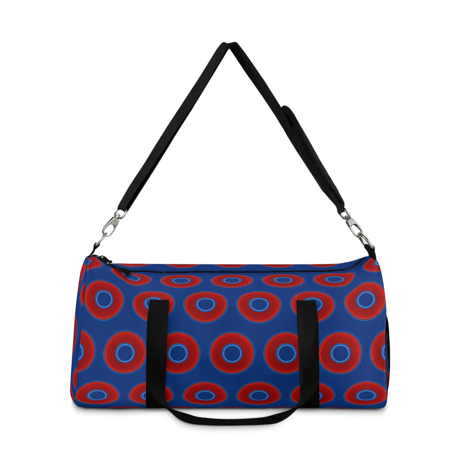 Lumpy Duffel - vivid red donuts w/dark blue background