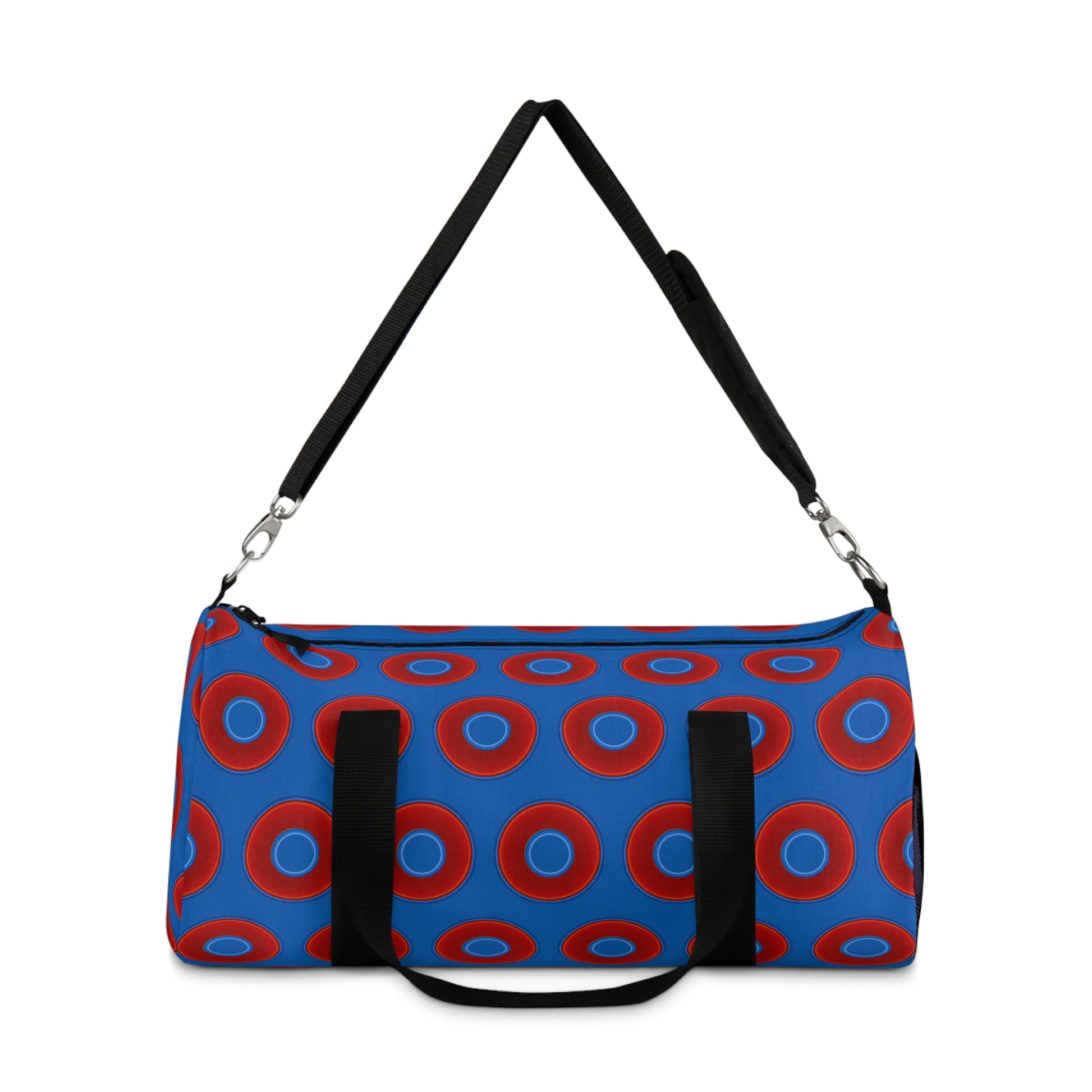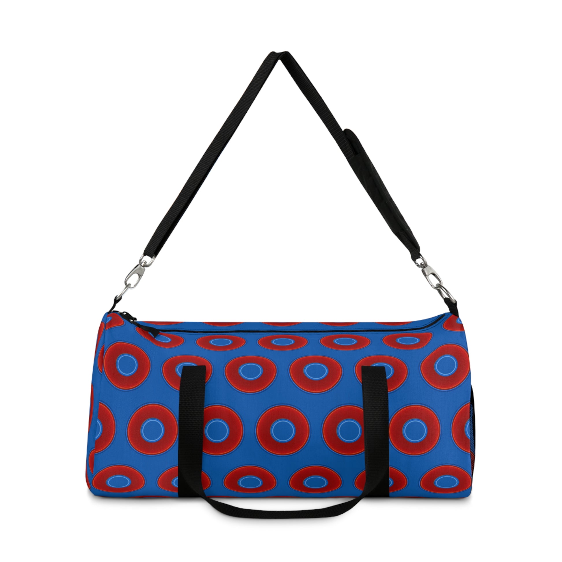 Lumpy Duffel - vivid red donuts w/dark royal blue background