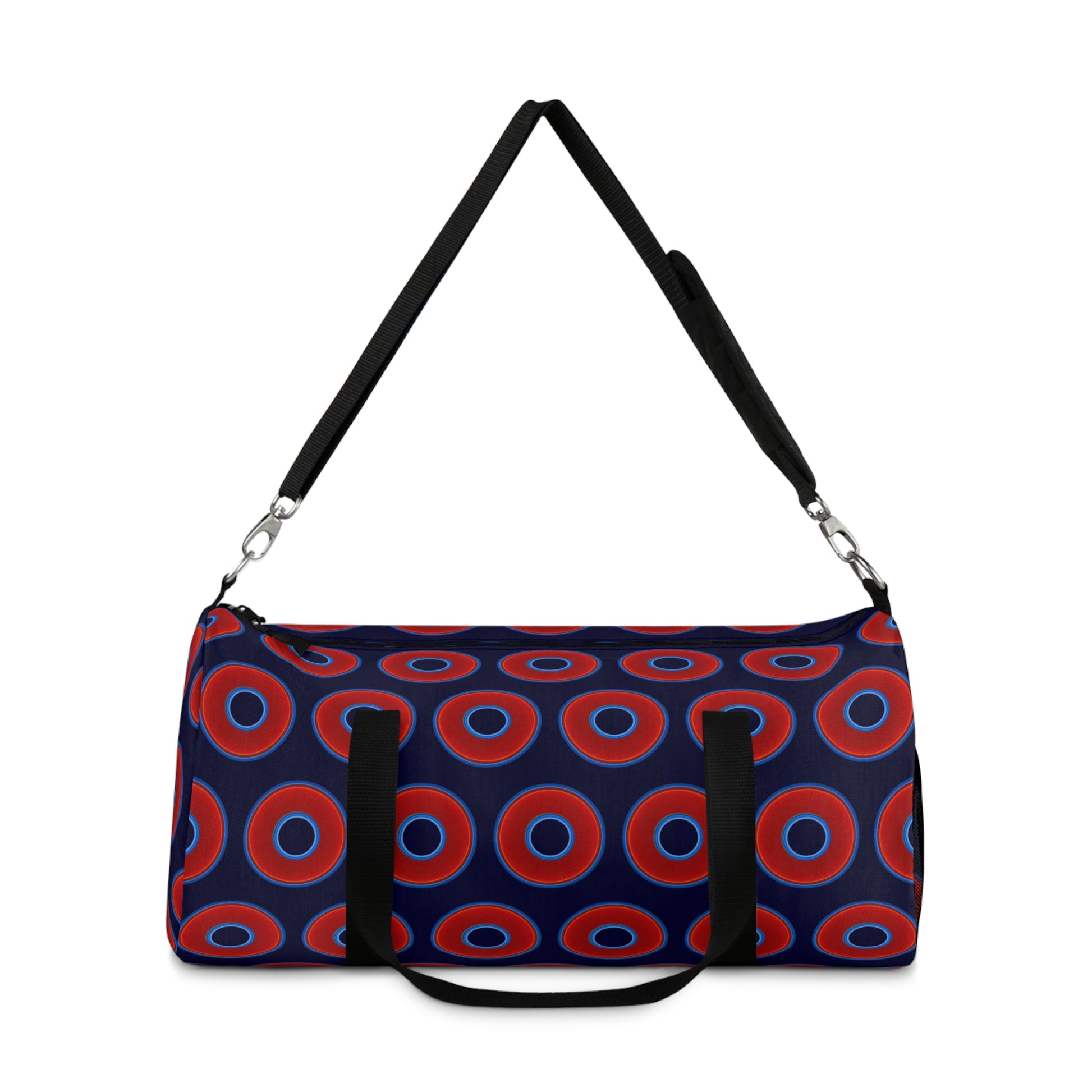 Lumpy Duffel - vivid red donuts w/midnight blue background