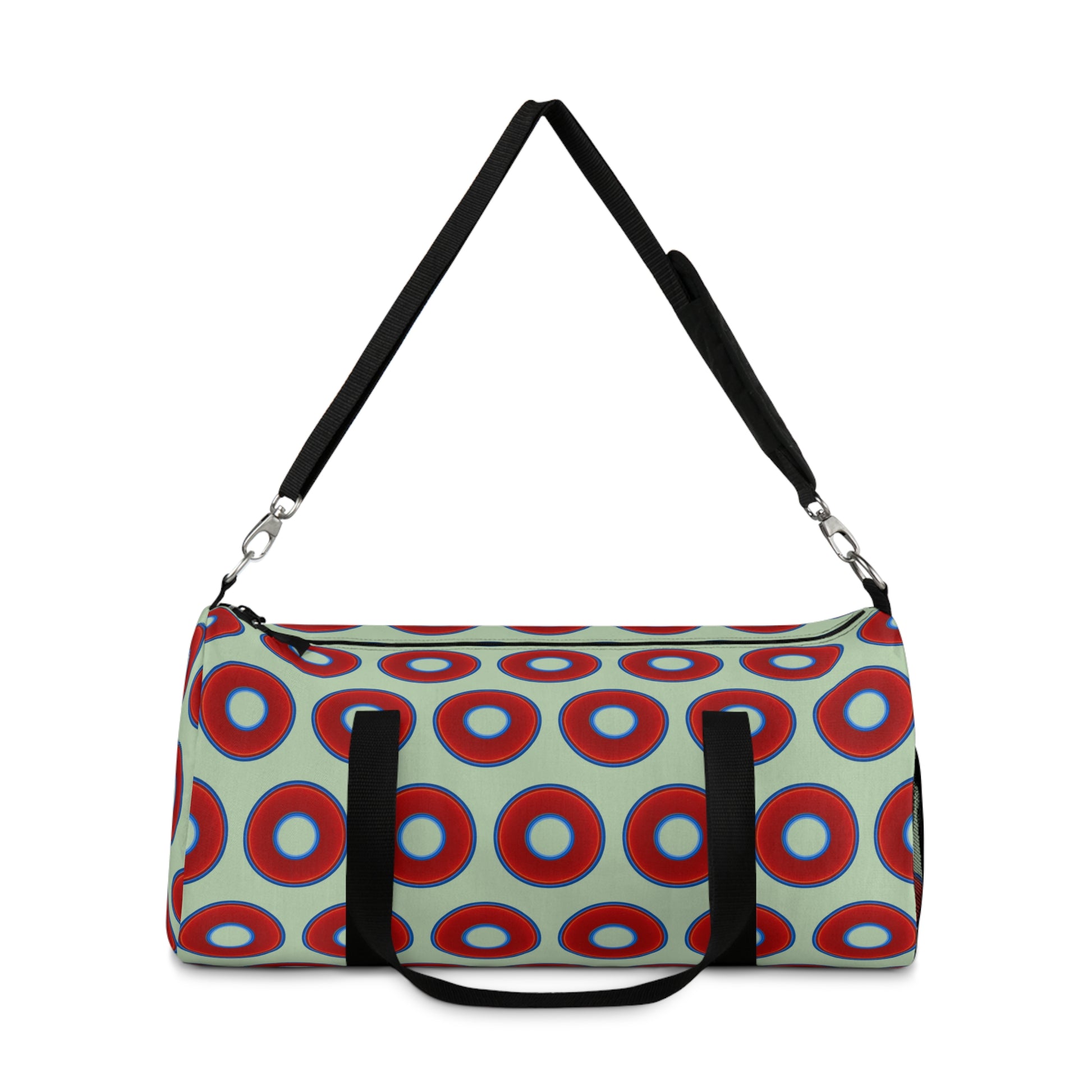 Lumpy Duffel - vivid red donuts w/seafoam background