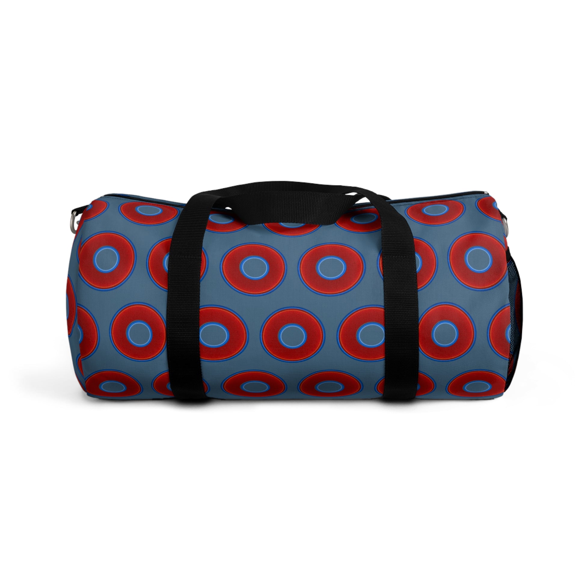 Lumpy Duffel - vivid red donuts w/steel blue background