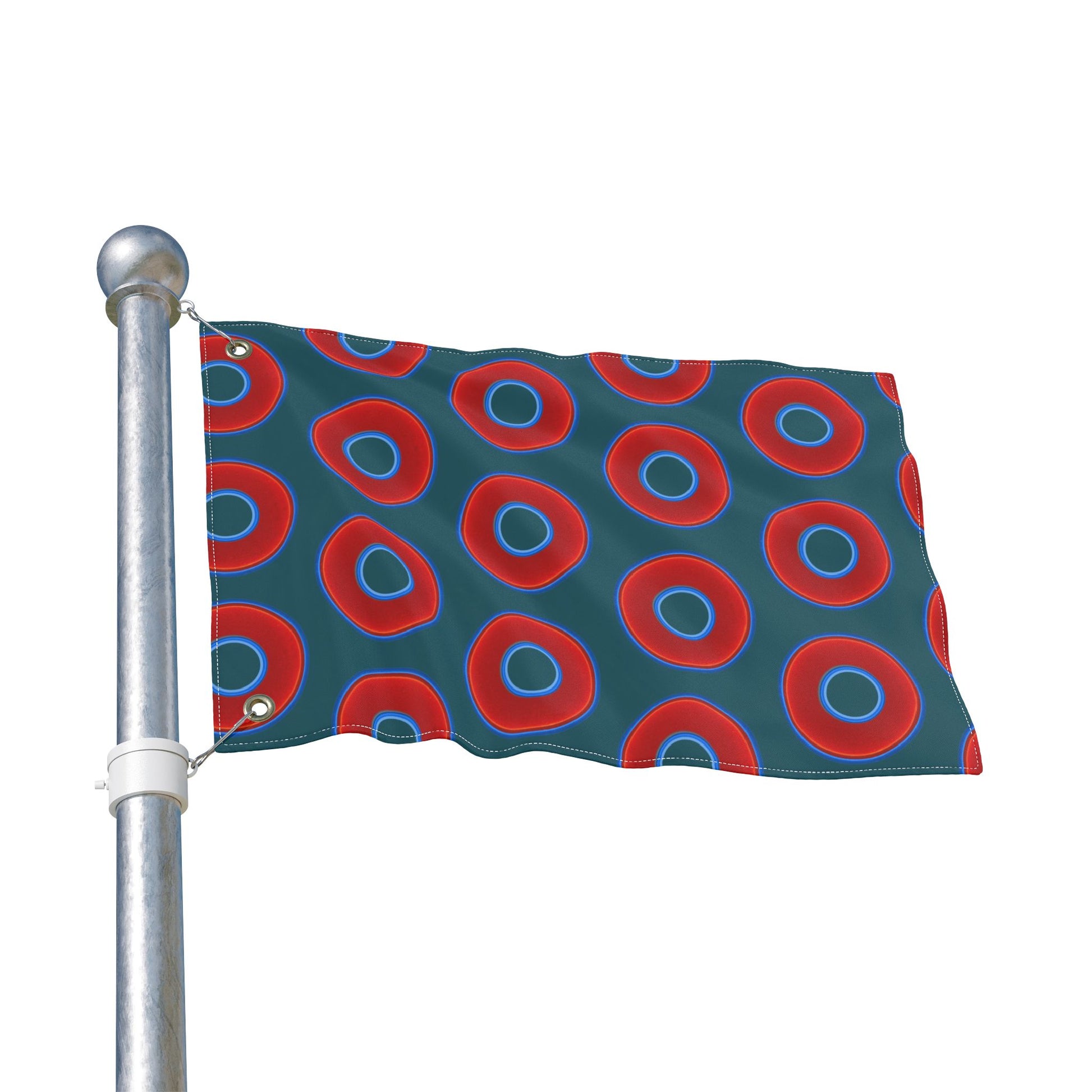 Trick out your house or provide identity to your campgrounds/homebase with Lumpy donuts. These flags feature our plain red vivid donut for the print. Flag is double-sided.