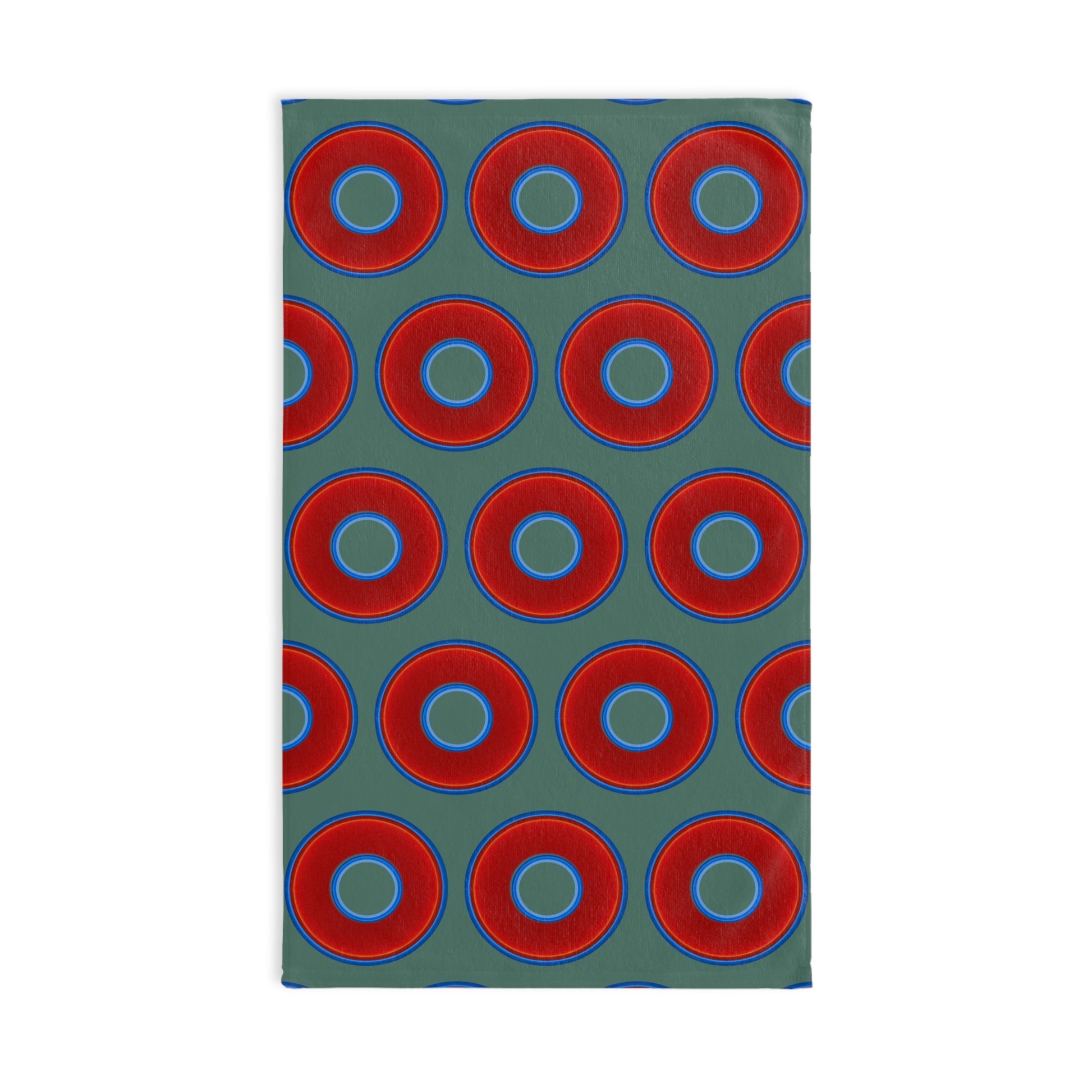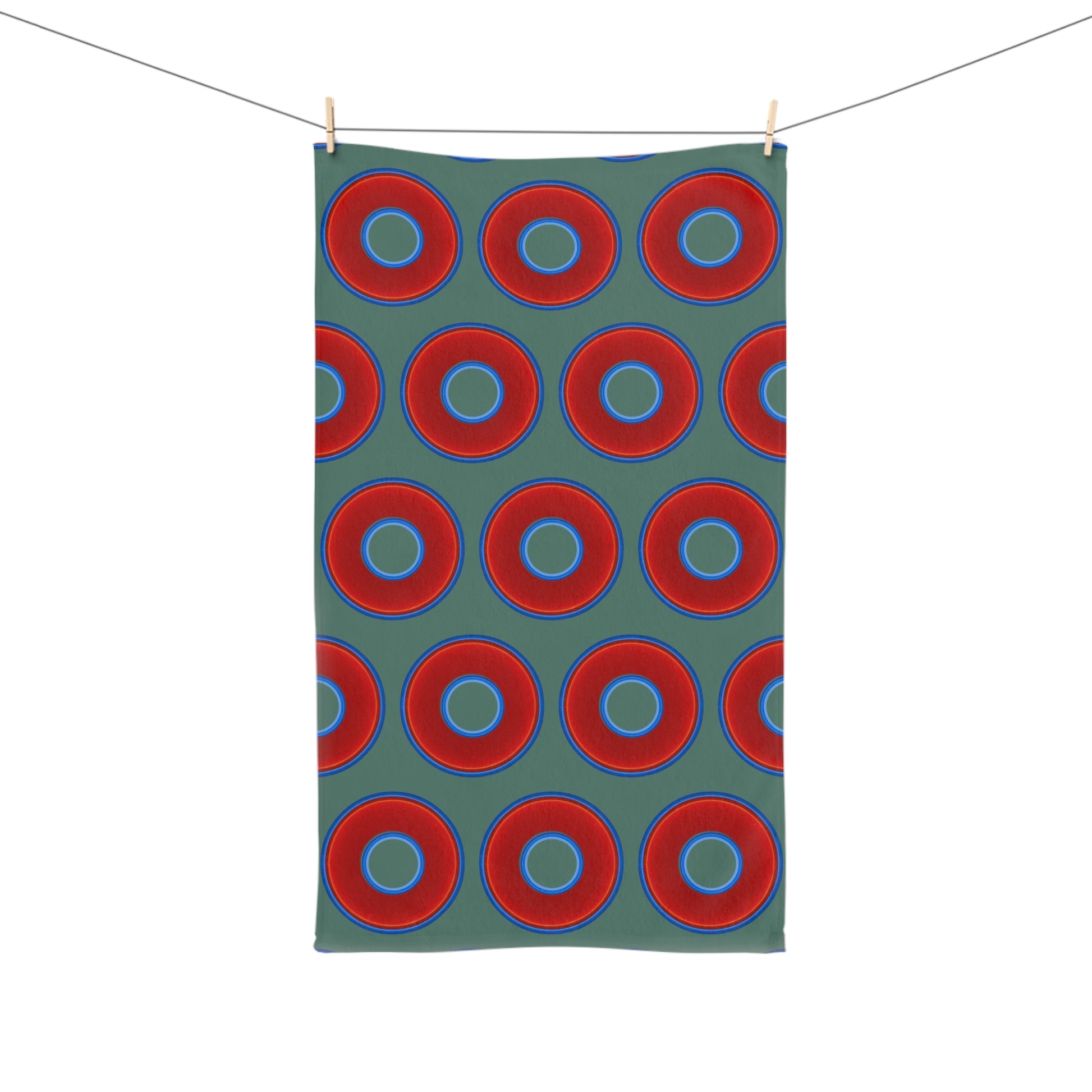 Lumpy Kitchen/Hand Towels - vivid red donuts w/Fenway green background