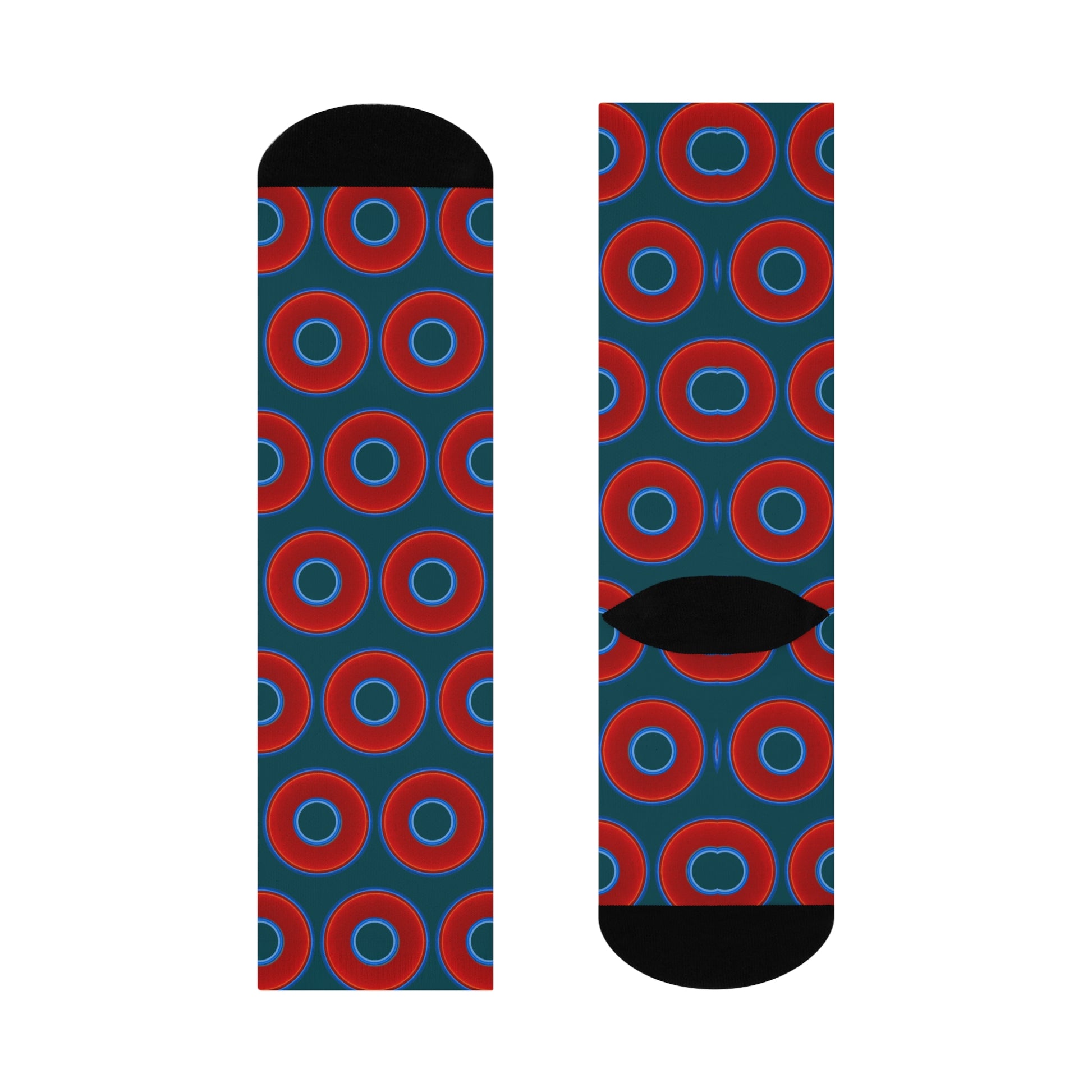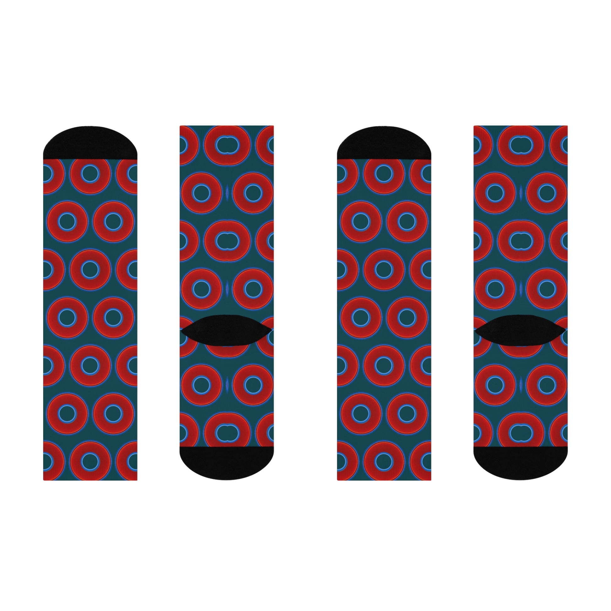 Lumpy Sox - cushioned crew - vivid red donut print w/midnight teal green background