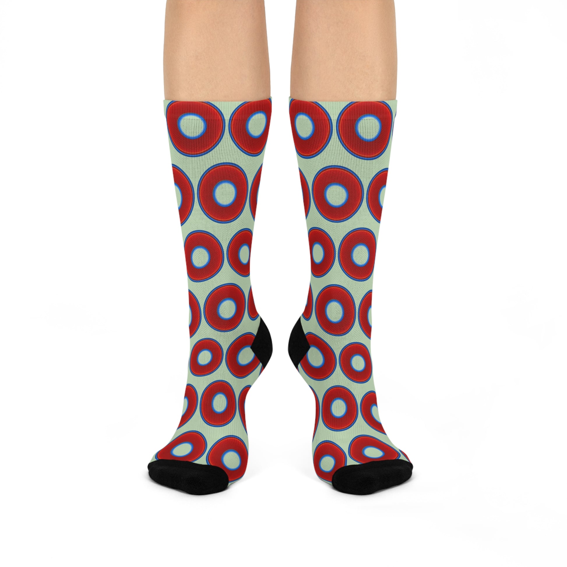 Lumpy Sox - cushioned crew - vivid red donut print w/seafoam background