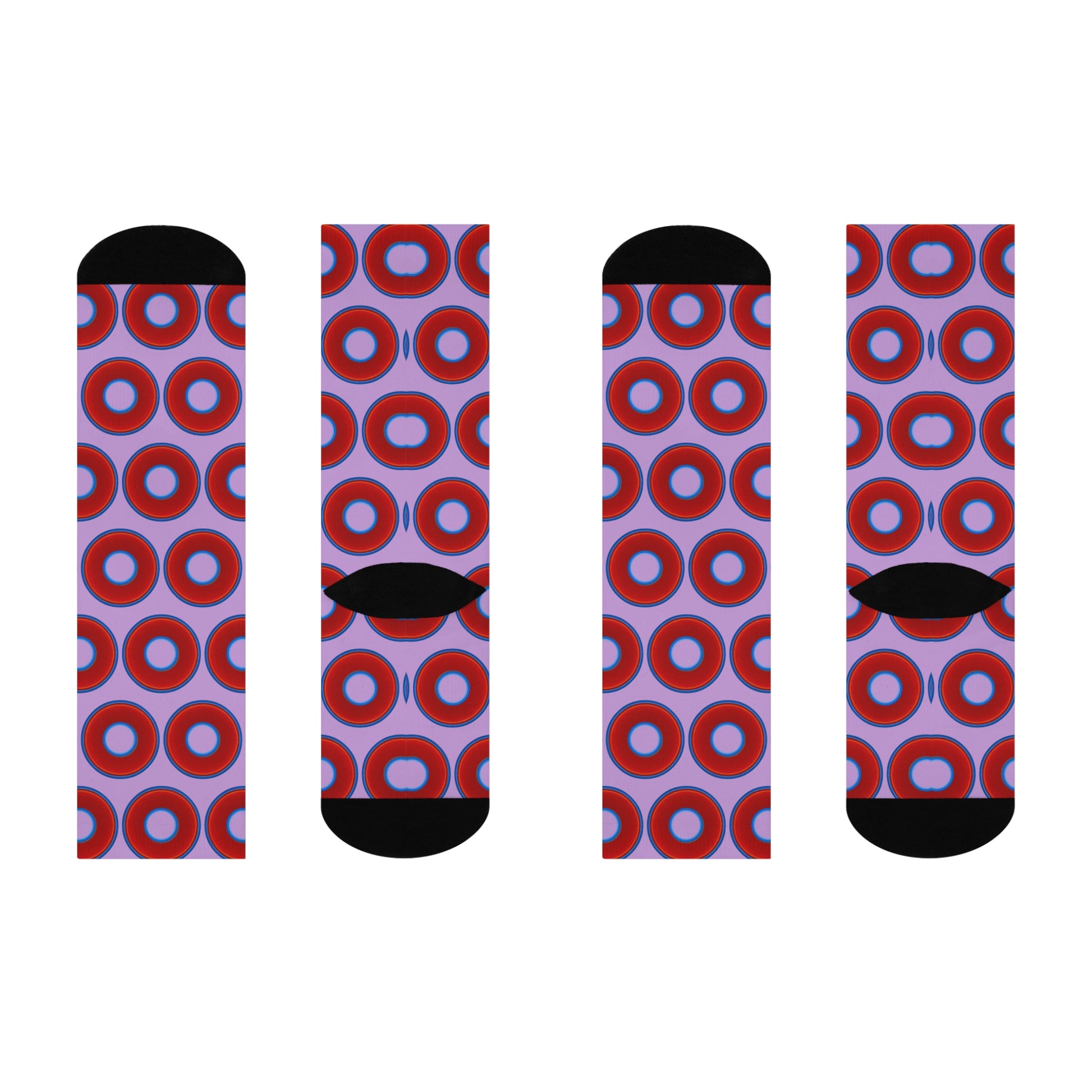 Lumpy Sox - cushioned crew - vivid red donut print w/wisteria purple background