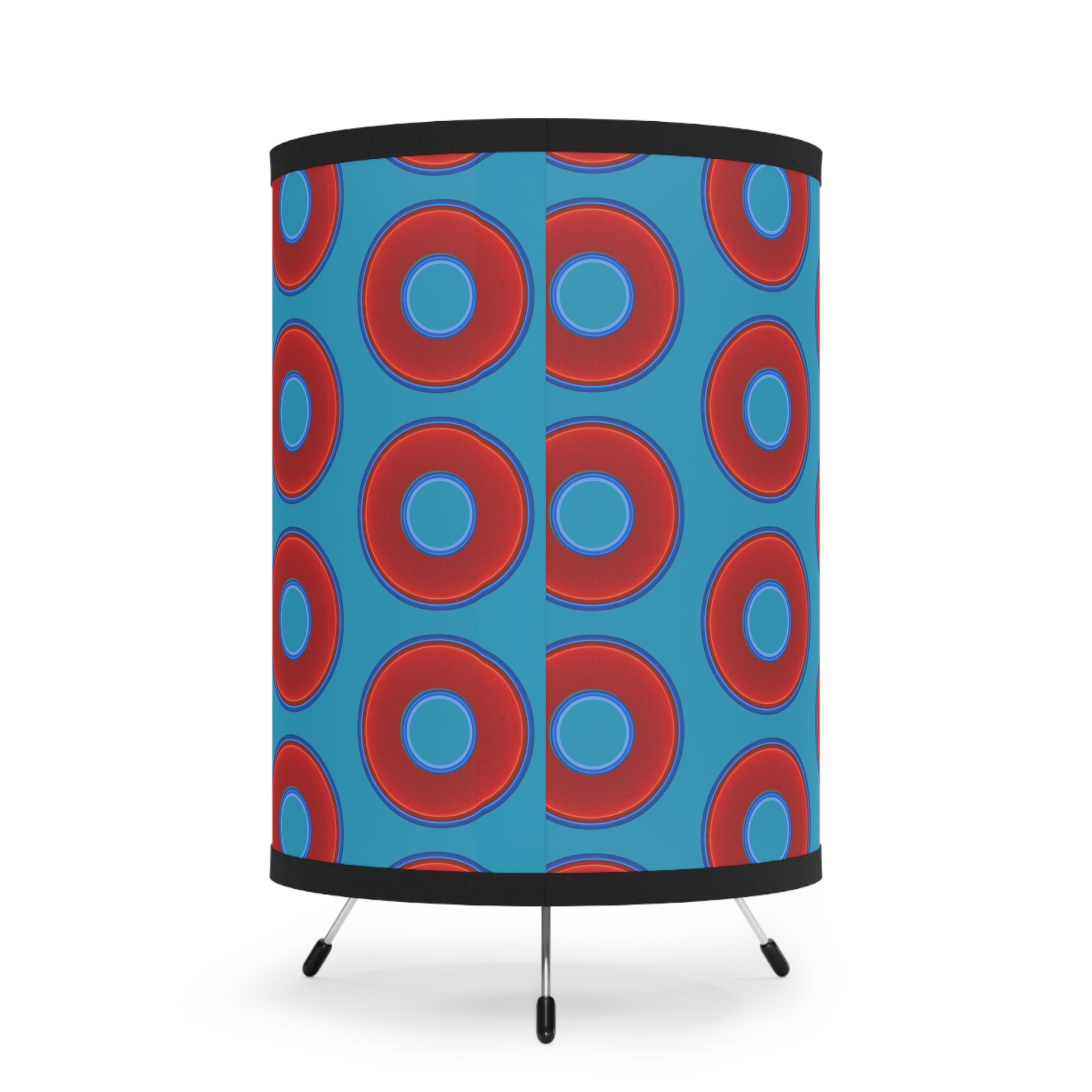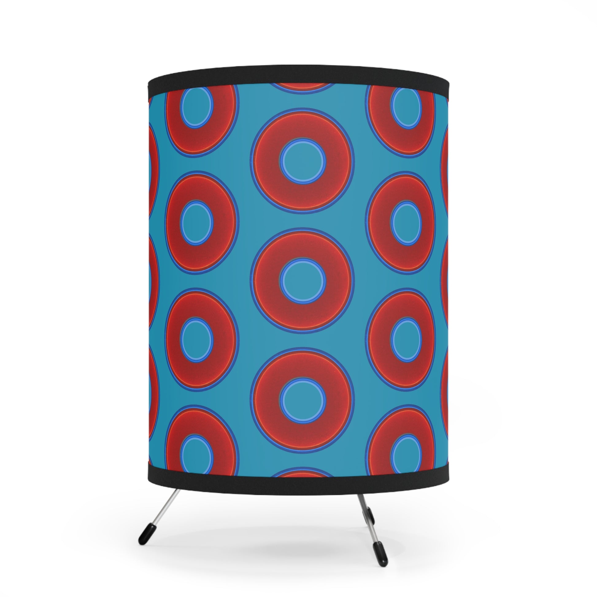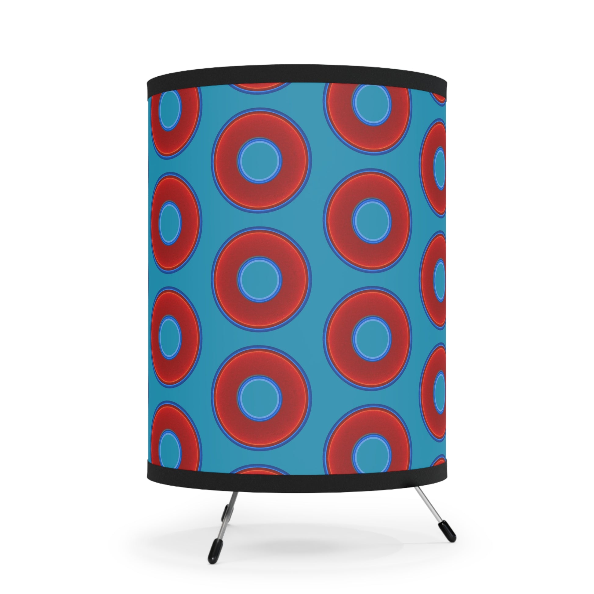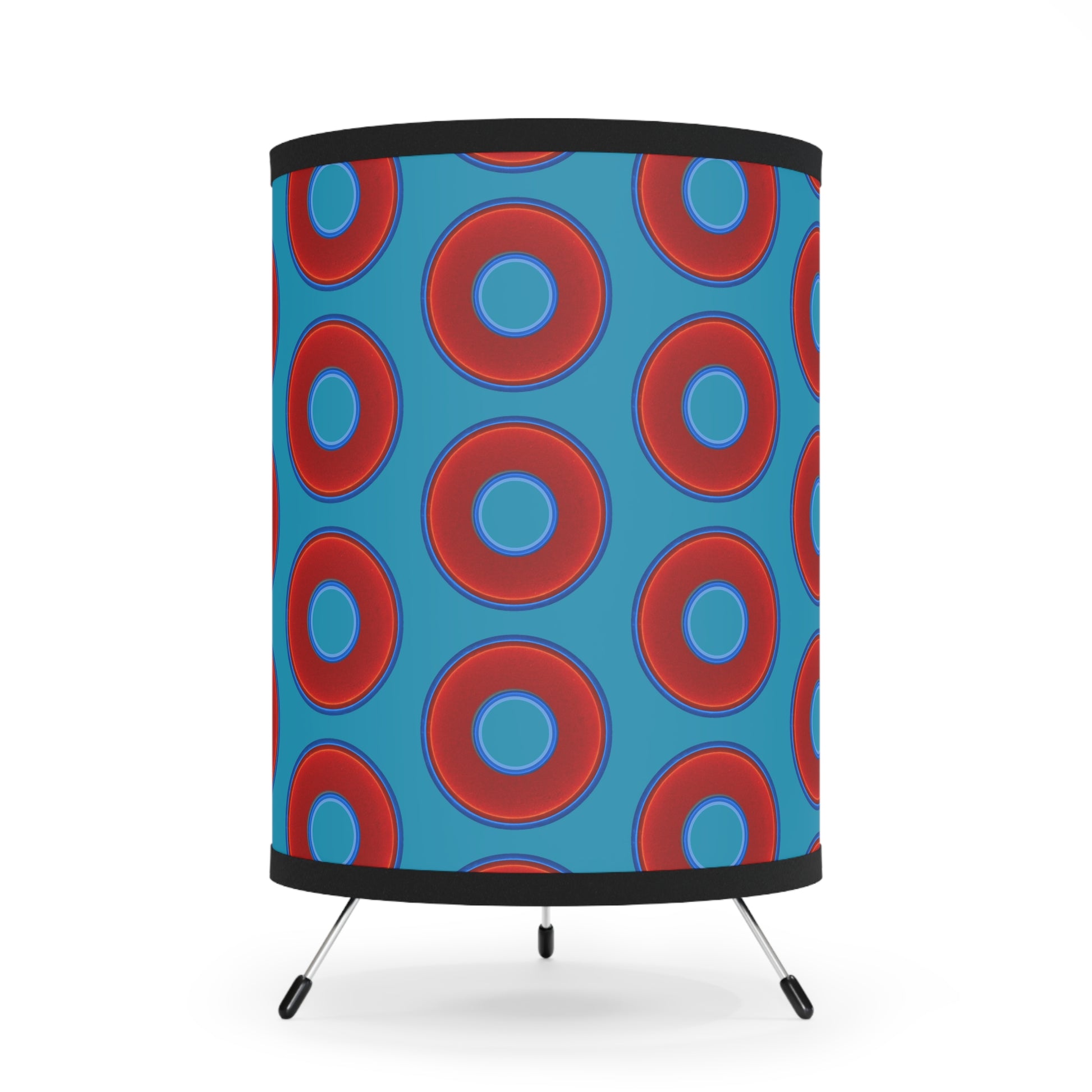 Lumpy Tripod Donut Lamp - vivid red donuts w/aquamarine blue background