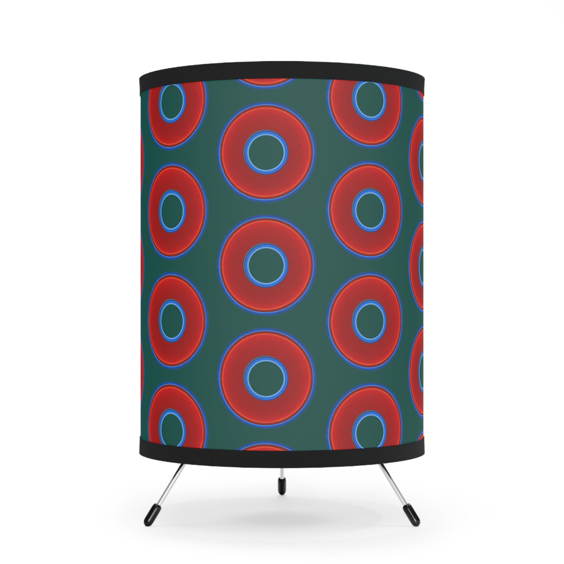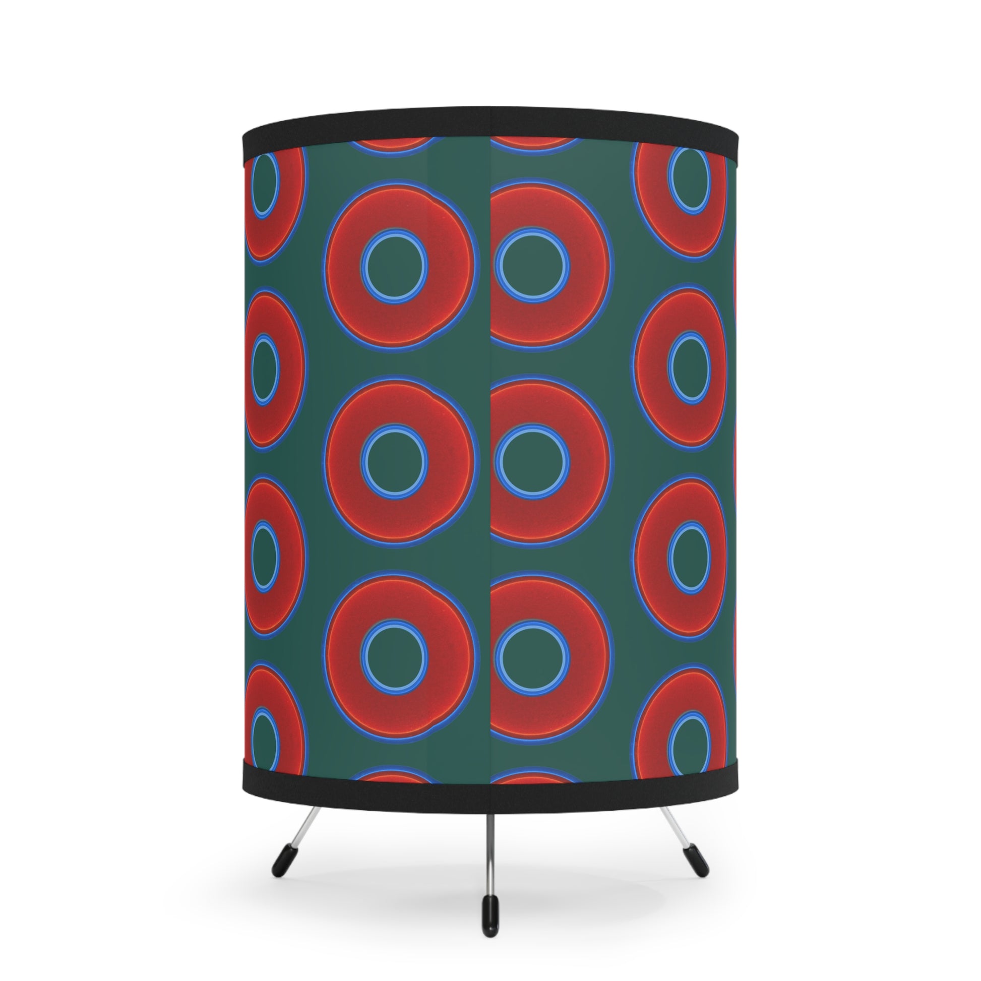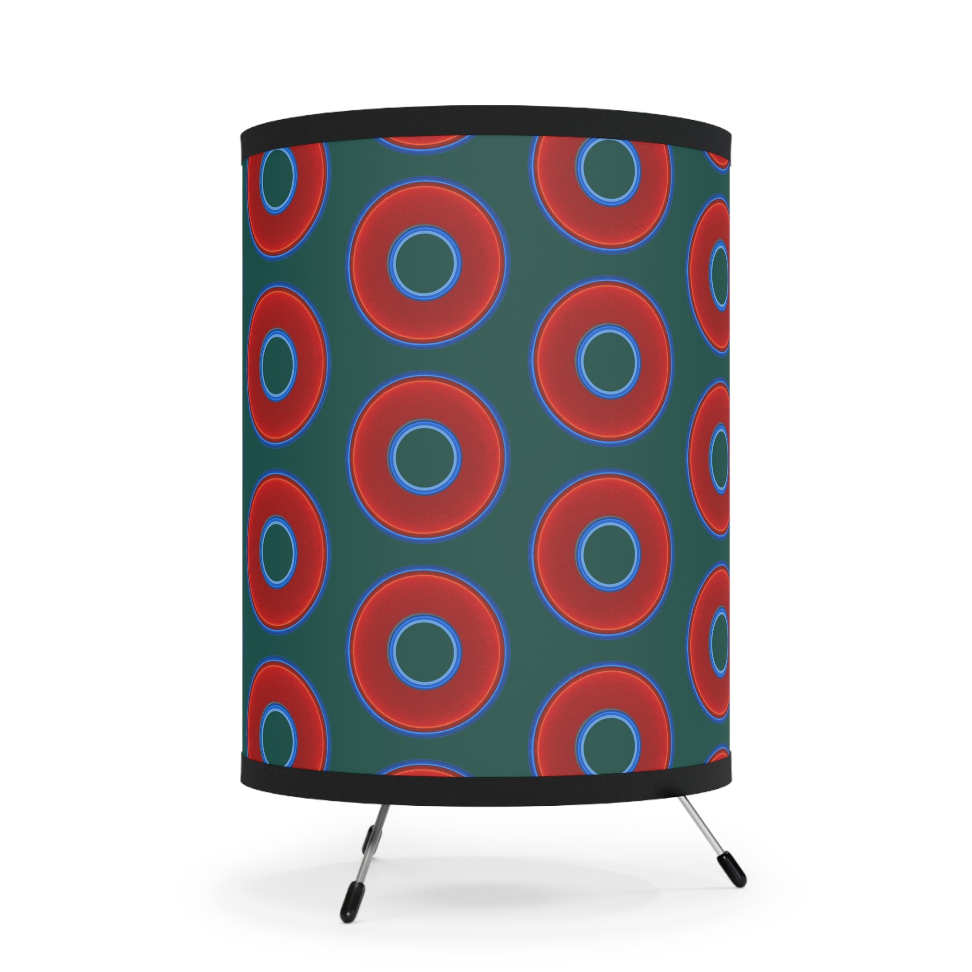 Lumpy Tripod Donut Lamp - vivid red donuts w/dark Fenway green background