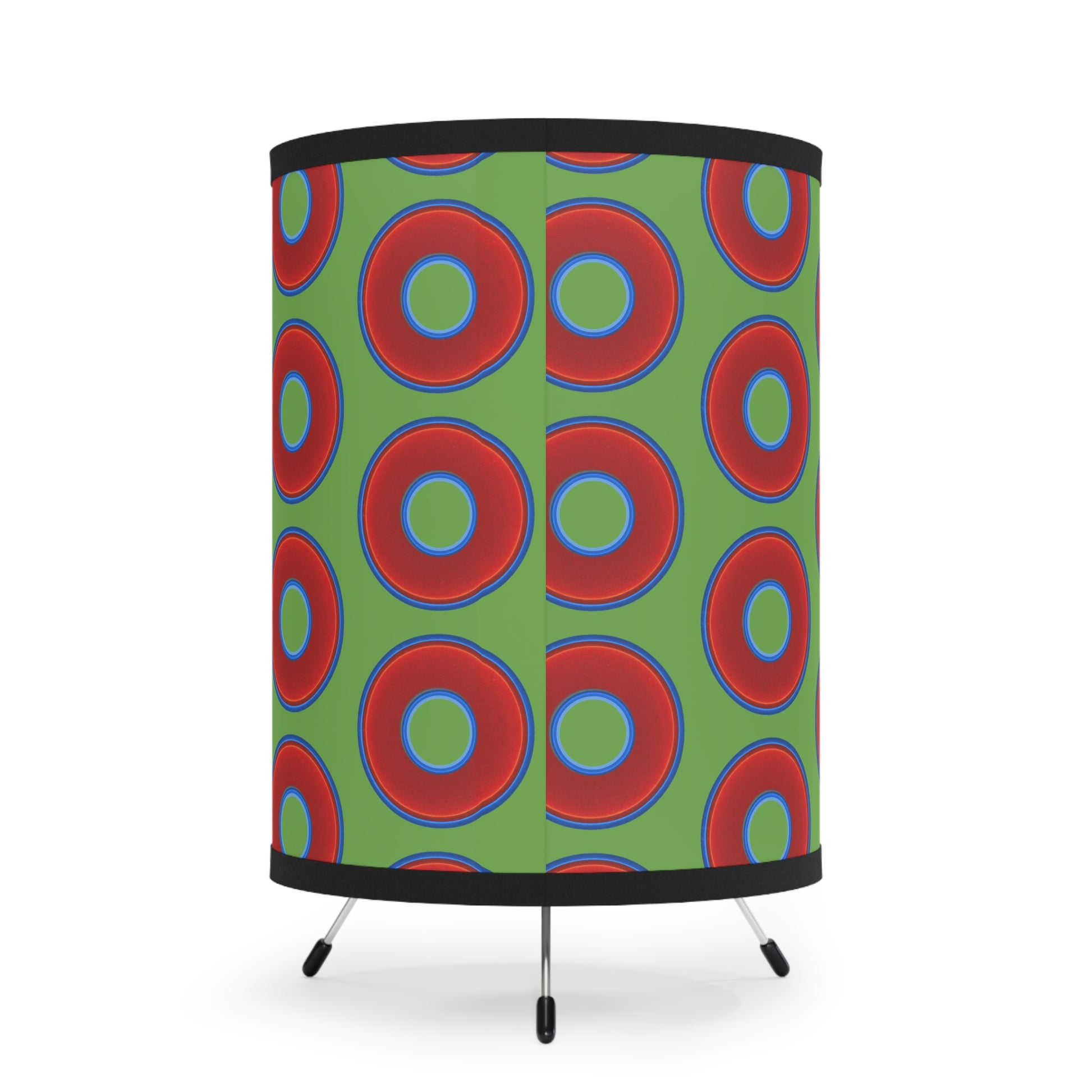 Lumpy Tripod Donut Lamp - vivid red donuts w/light green background