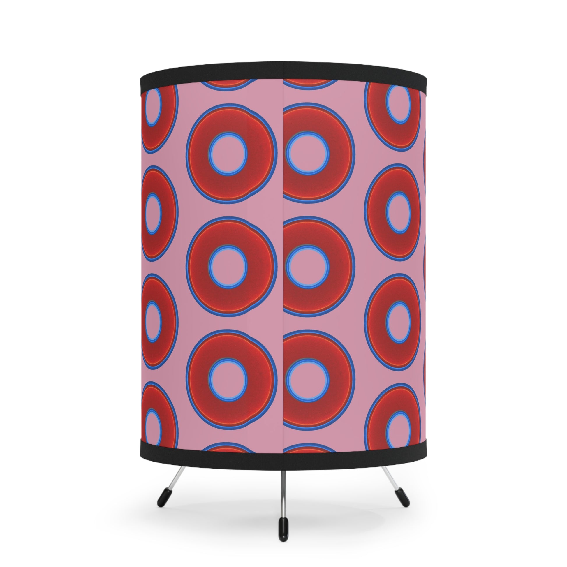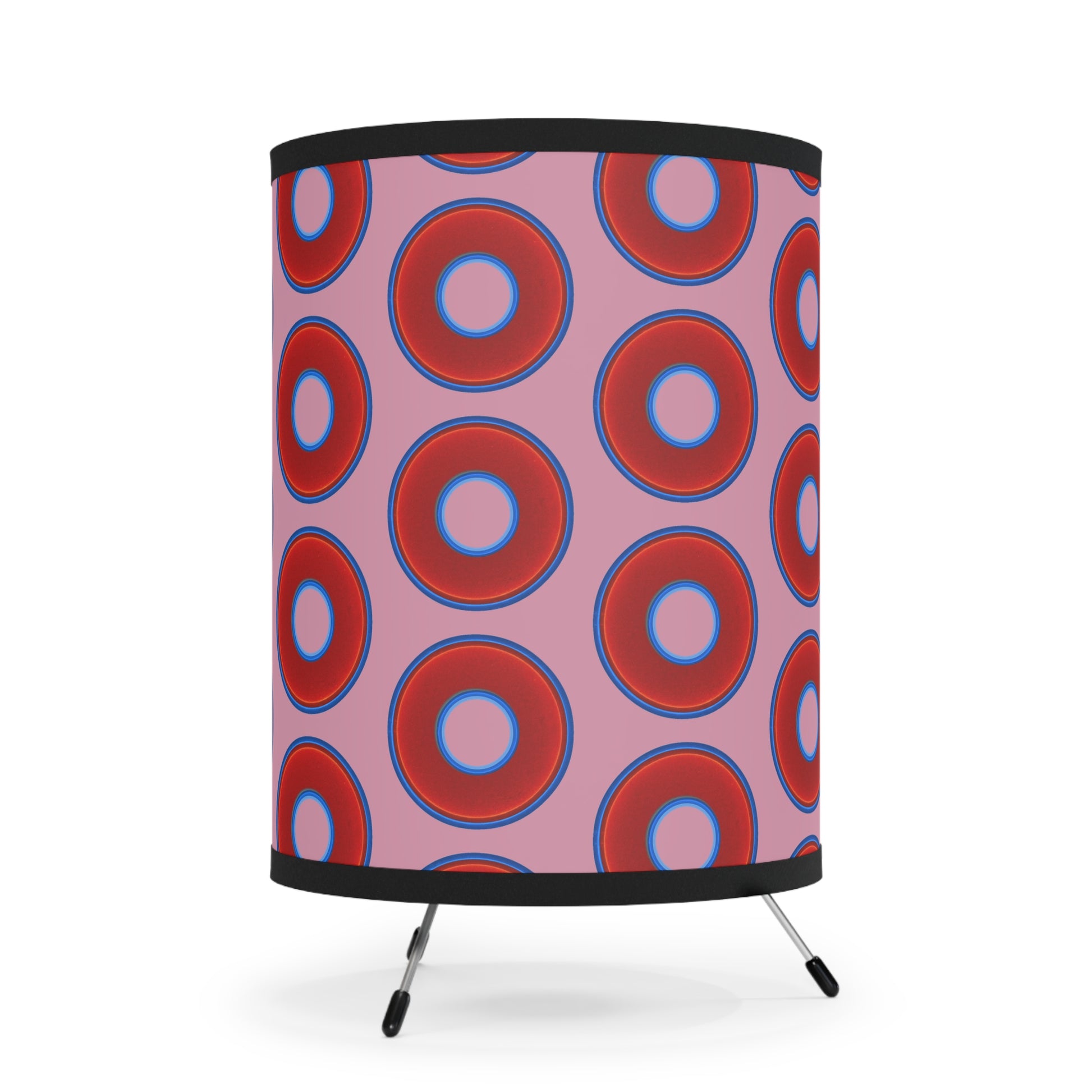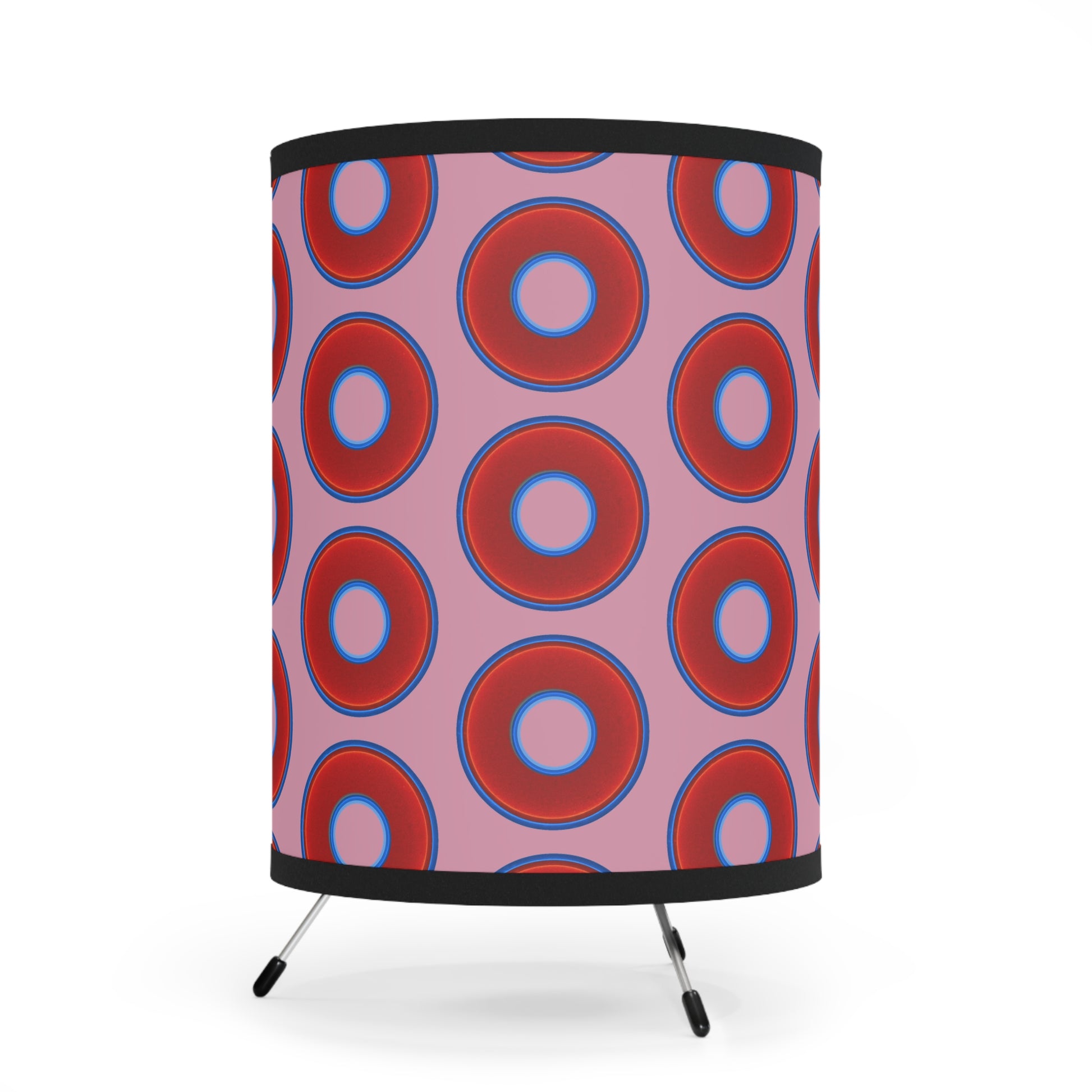 Lumpy Tripod Donut Lamp - vivid red donuts w/pale magenta background