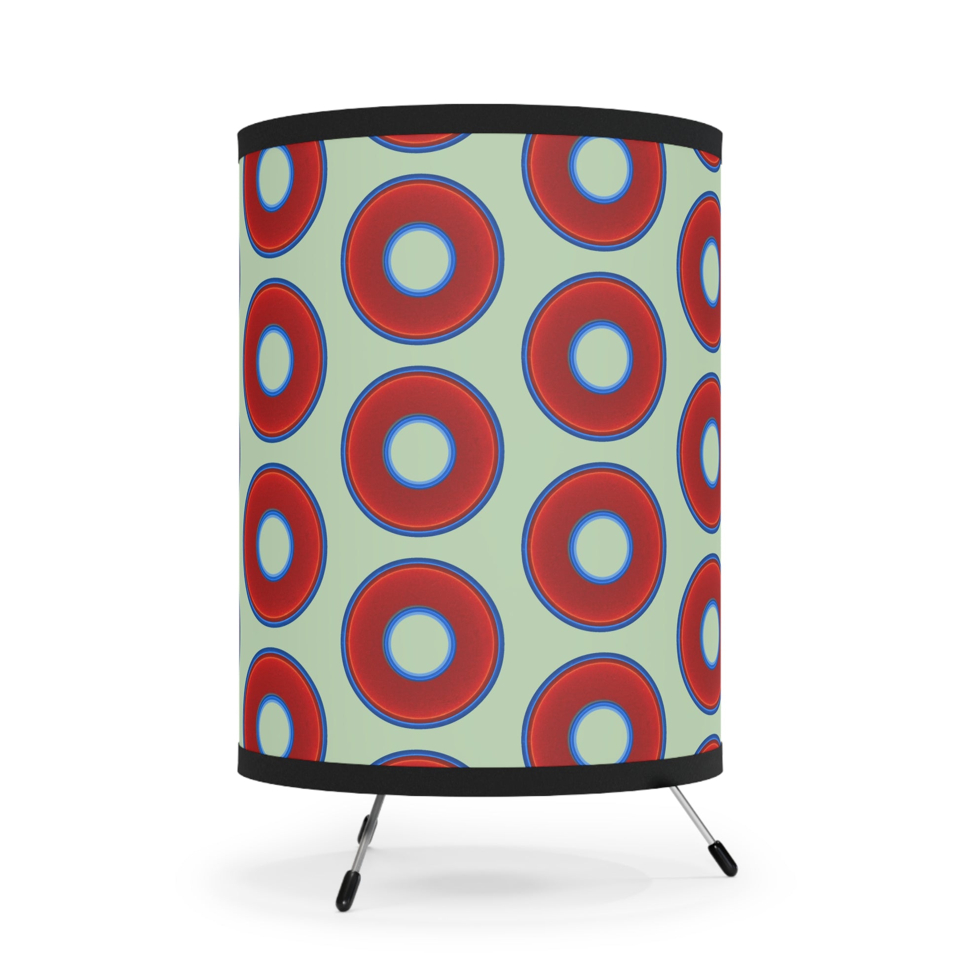Lumpy Tripod Donut Lamp - vivid red donuts w/seafoam background