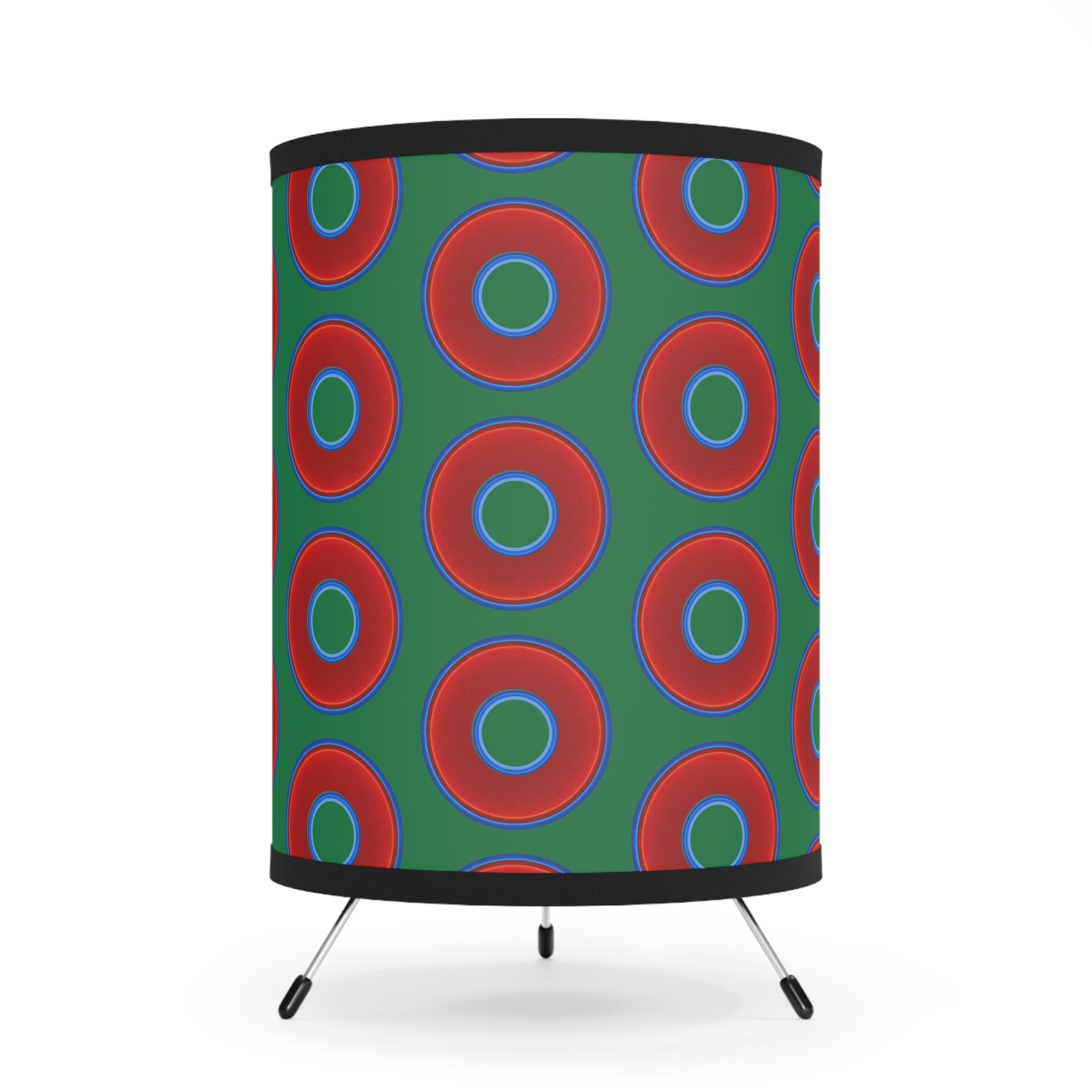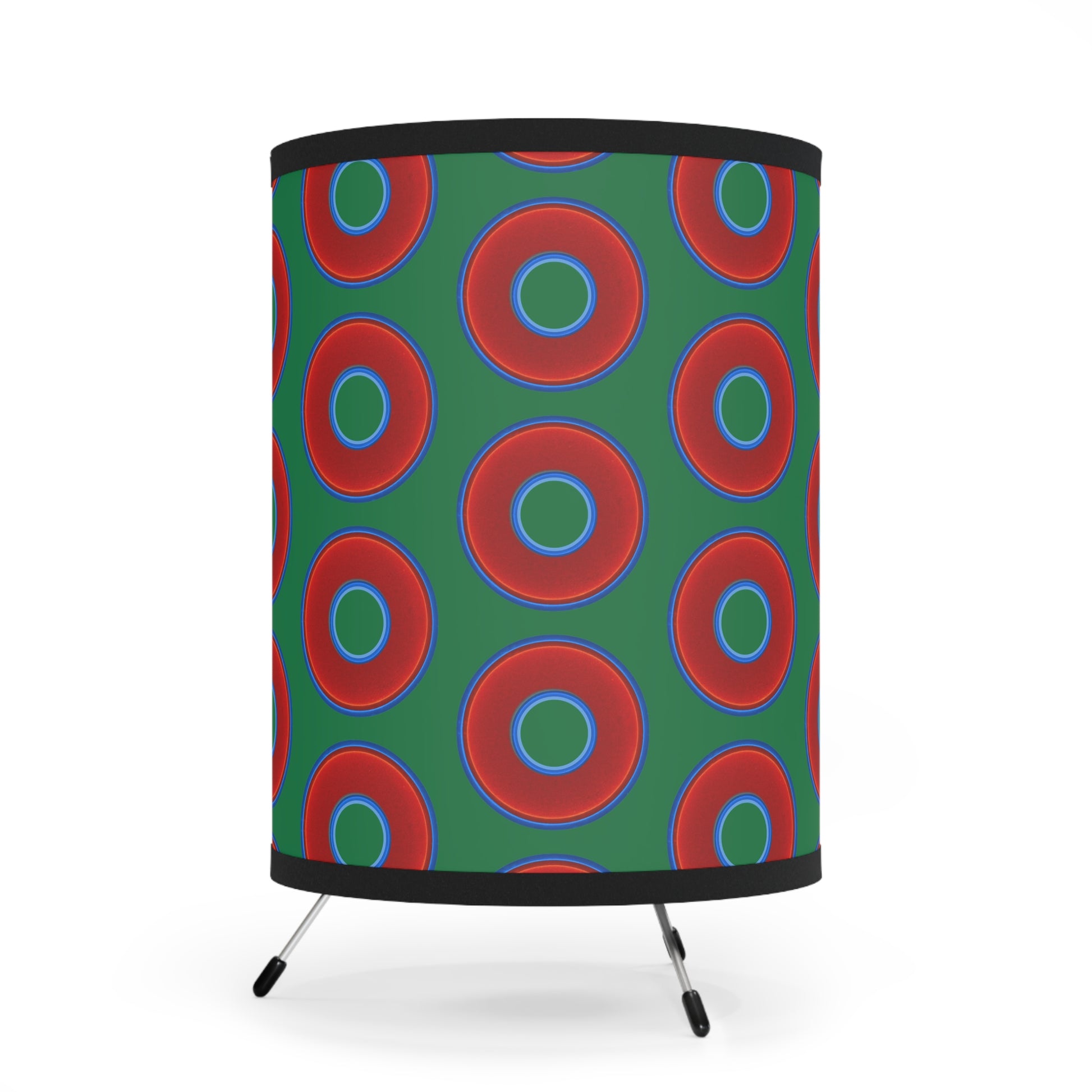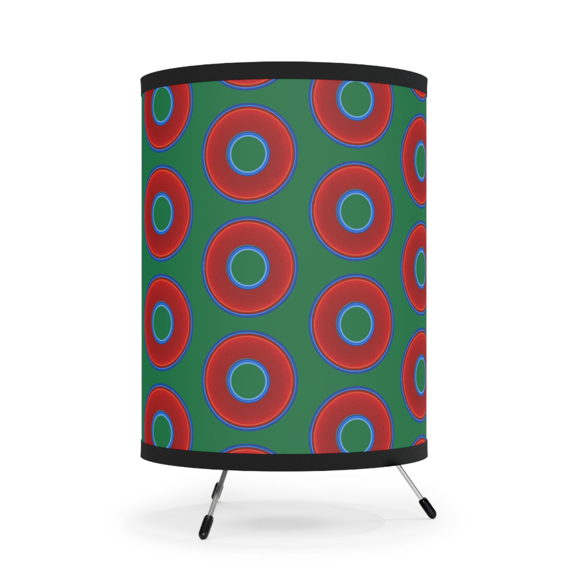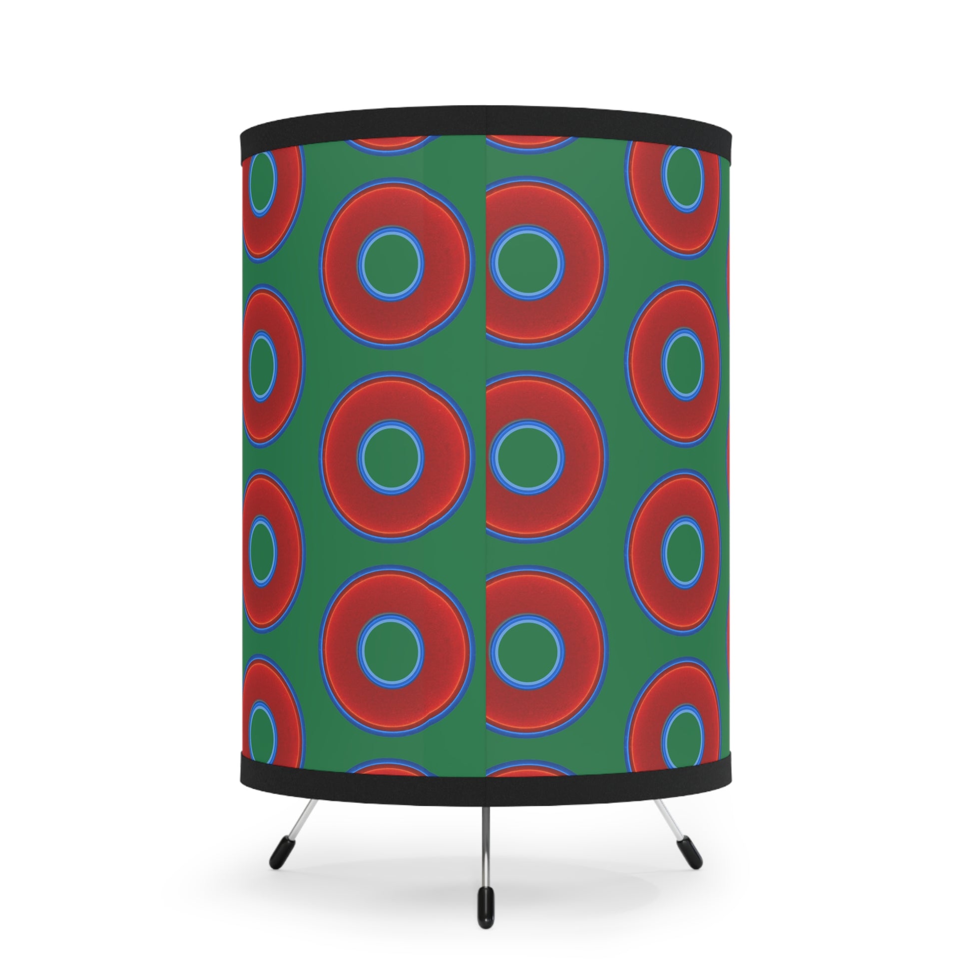 Lumpy Tripod Donut Lamp - vivid red donuts w/green background