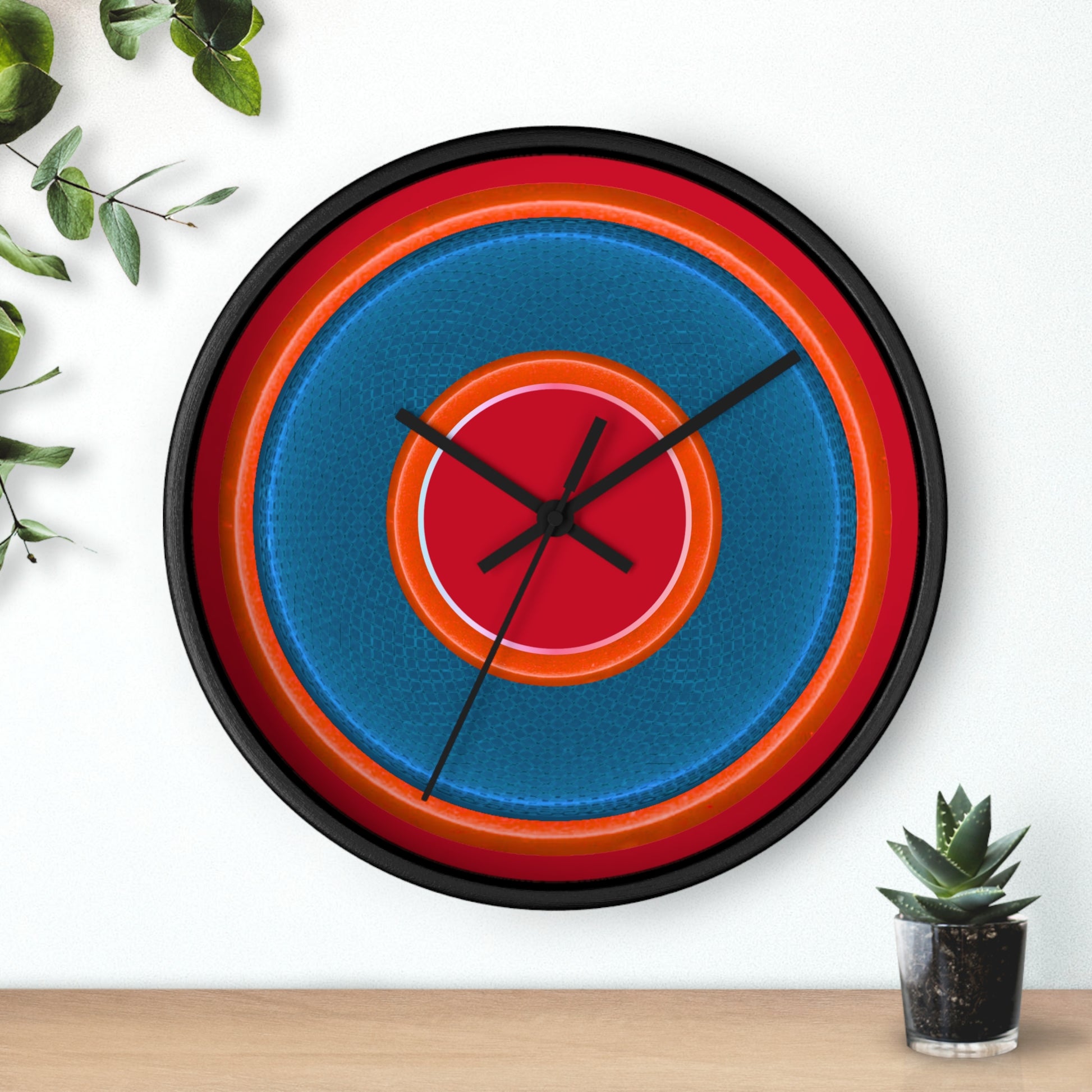 Lumpy Wall Clock - blue rustic donut w/light red/orange edging - variant 8 w/red background