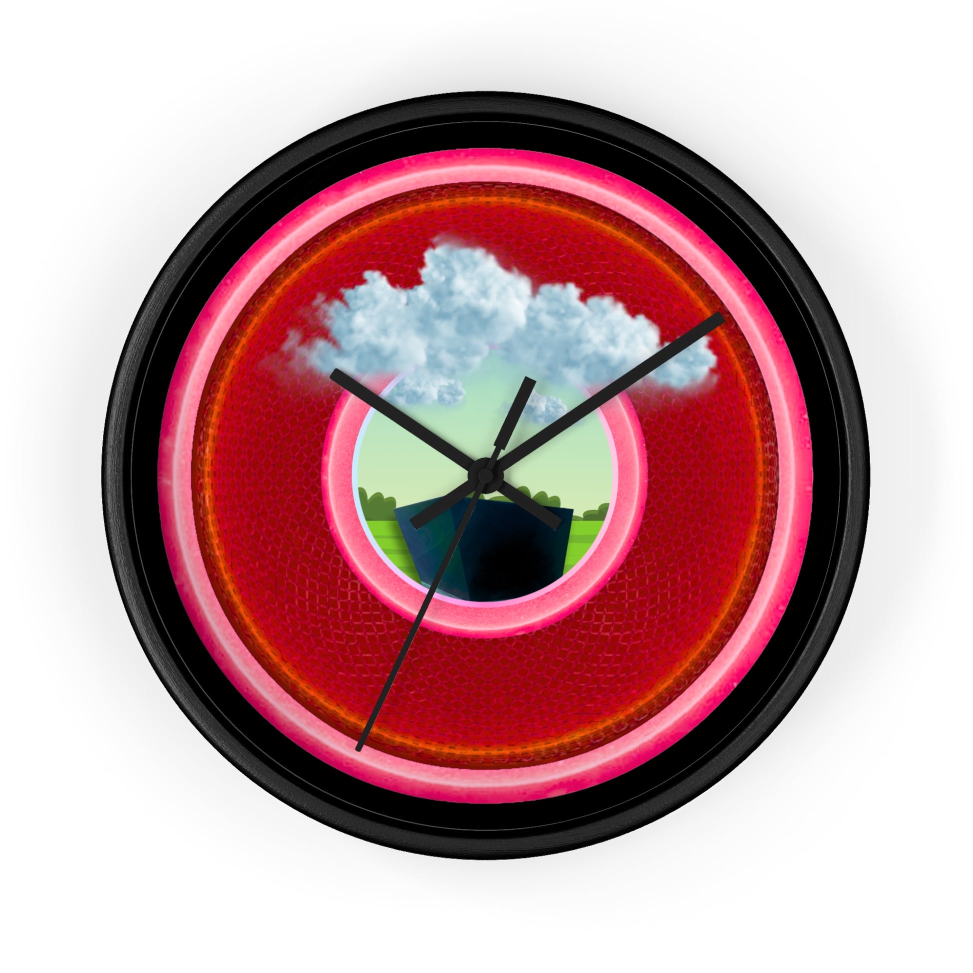 Lumpy Wall Clock - "Got Rhombus?" - variant 2 - red/pink rustic donut w/black background