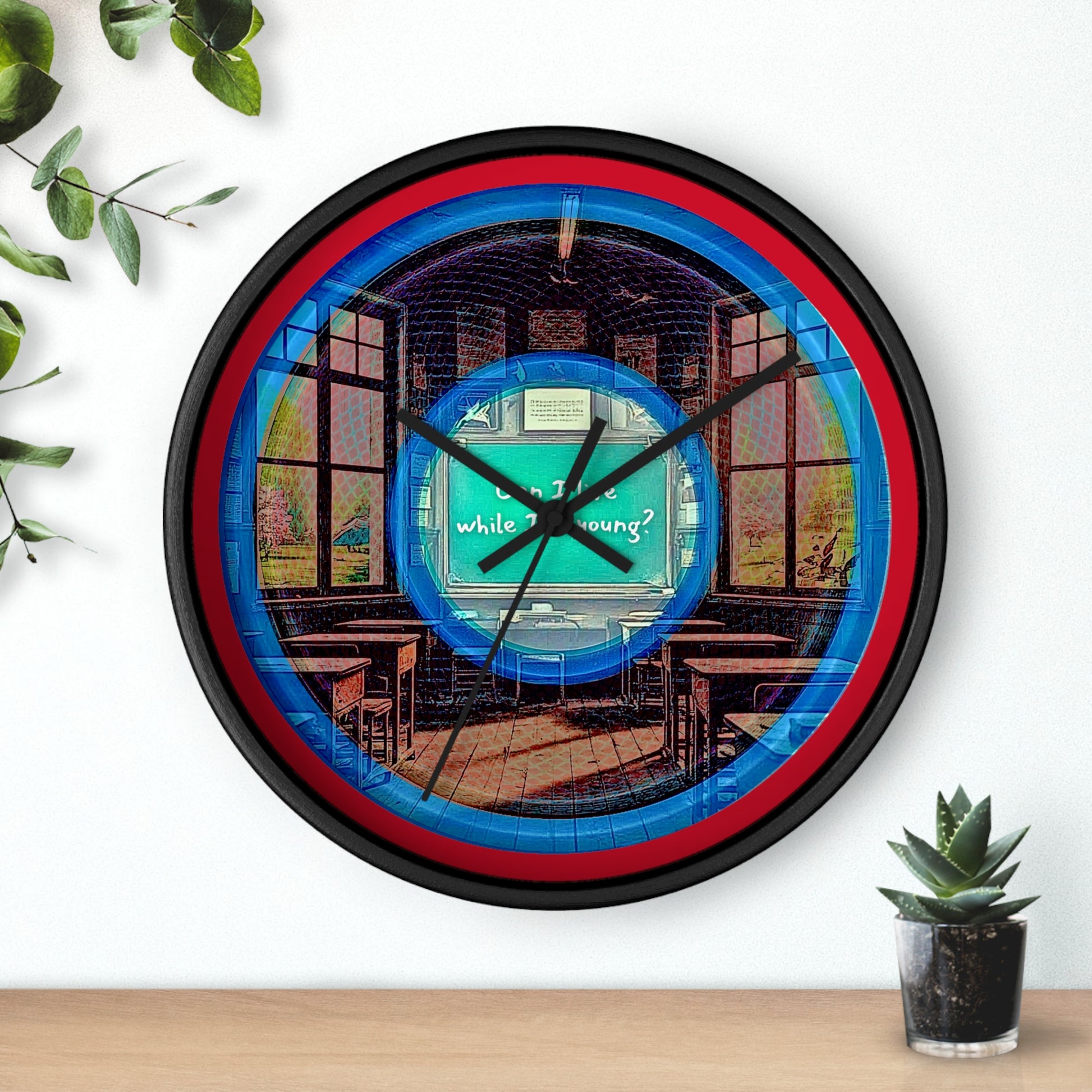 Lumpy Wall Clock - "The Torturous Donut Clock" - rustic blue/red pic donut w/dark red background