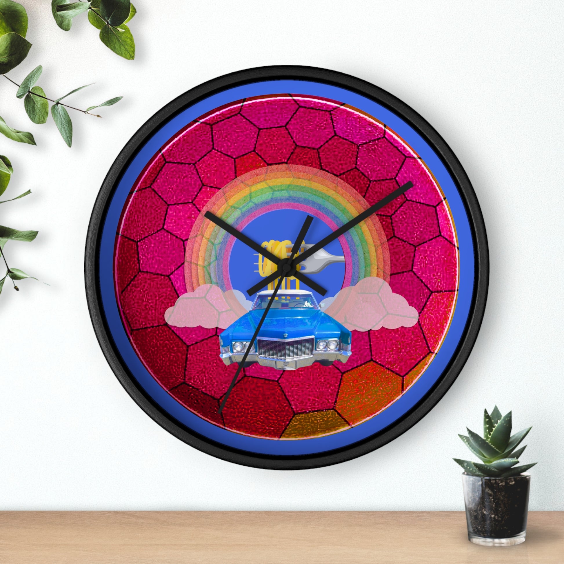 Lumpy Wall Clock - "Time for a Spaghetti Incident in my Caddy" - variant 2 - magenta hexadonut w/royal blue background