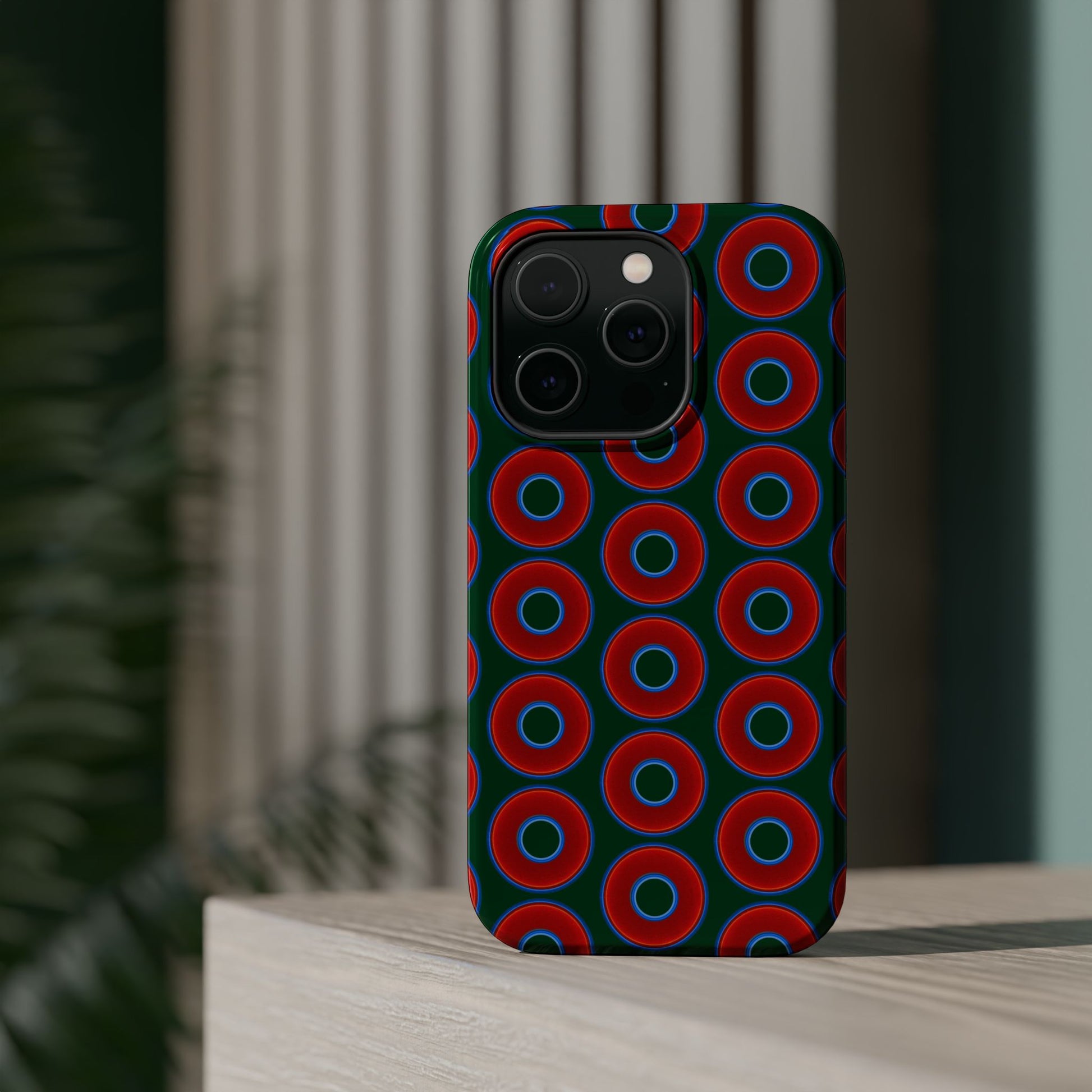 Magnetic Tough Donut Case - red vivid donut print w/deep pond green background