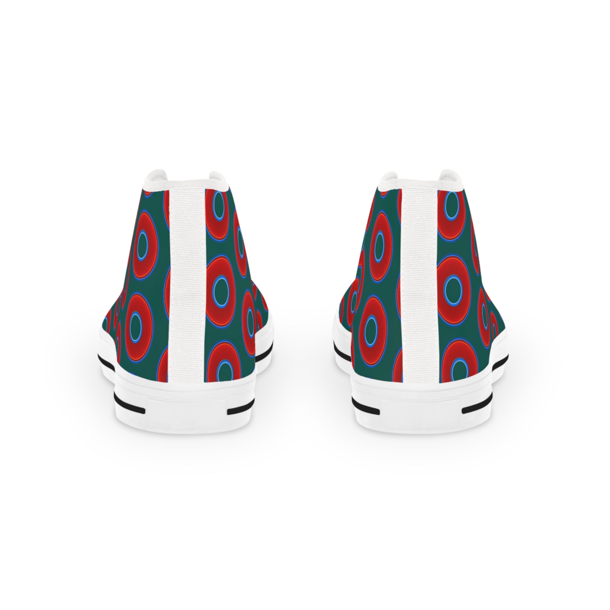 Men's High Top Chucks - large vivid red donut print w/dark Frenway green background