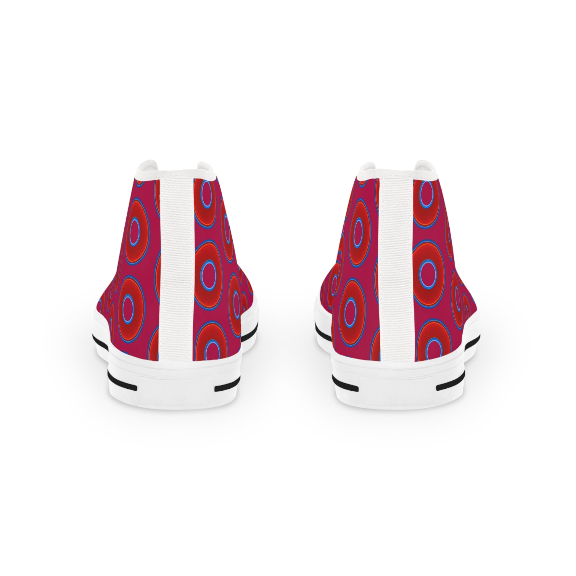 Men's High Top Chucks - large vivid red donut print w/dark magenta background