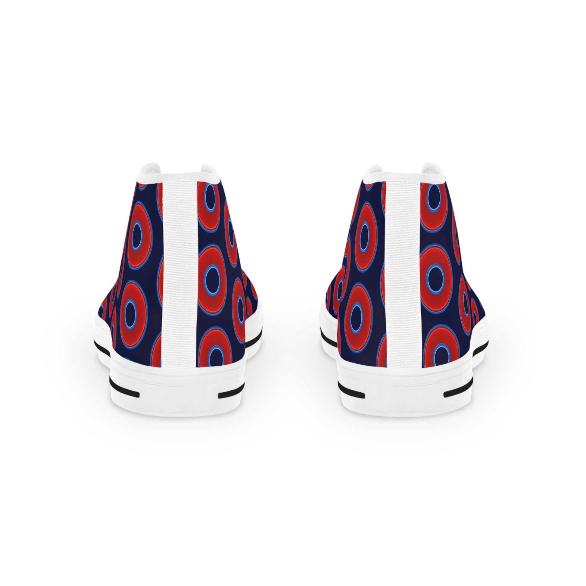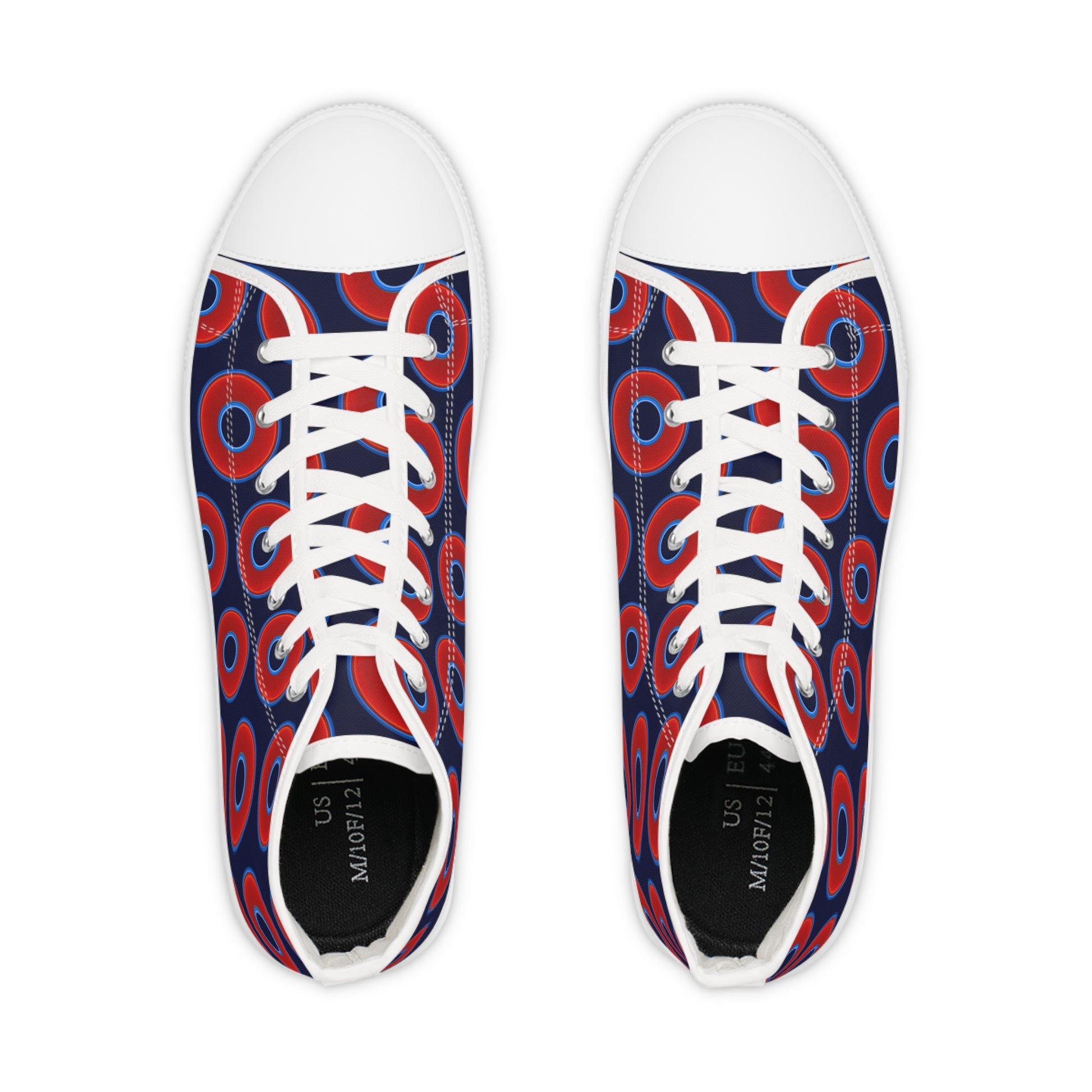 Men's High Top Chucks - large vivid red donut print w/dark navy blue background
