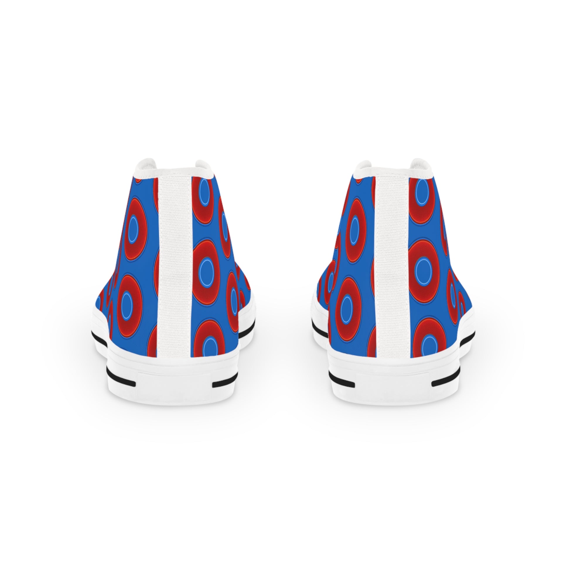 Men's High Top Chucks - large vivid red donut print w/dark royal blue background