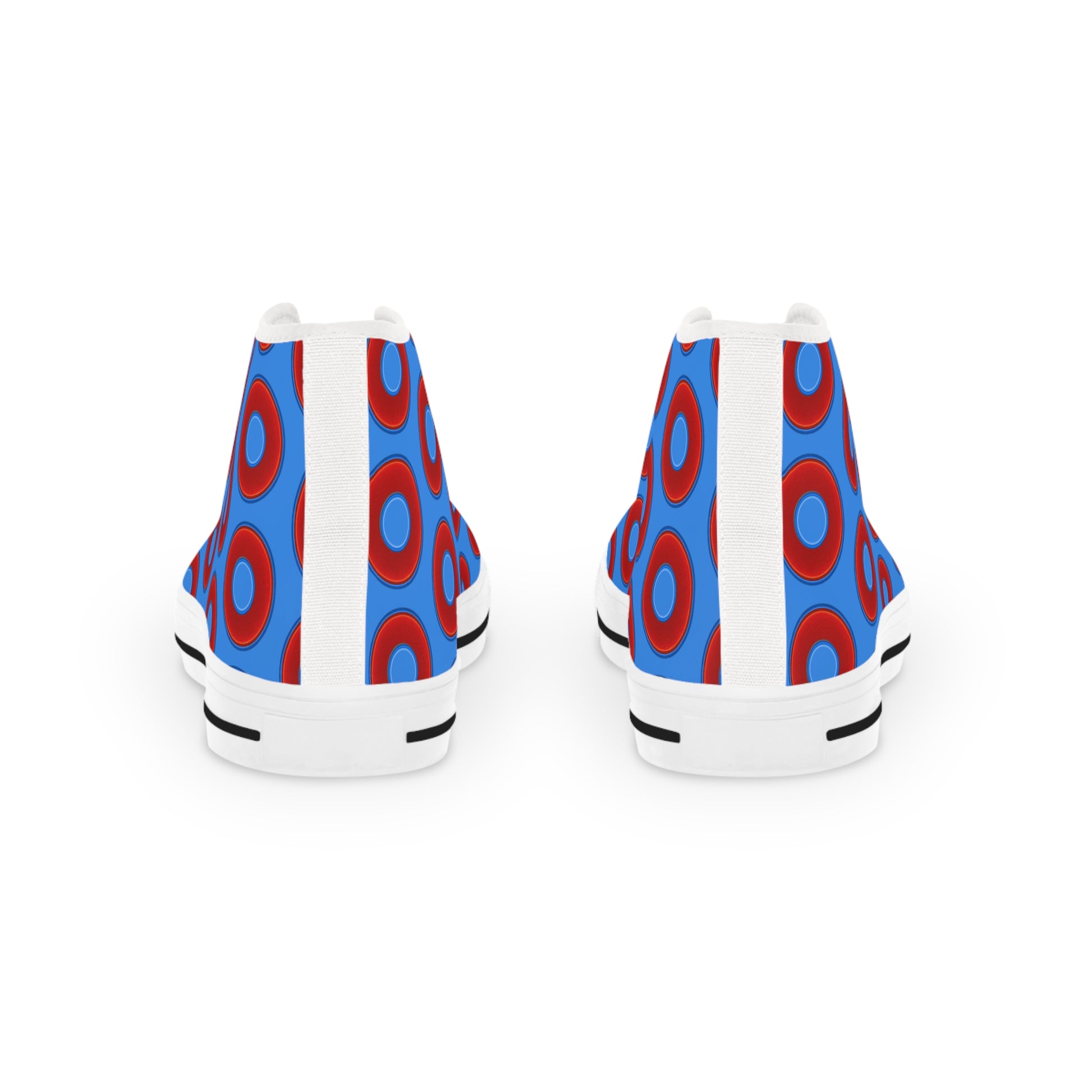 Men's High Top Chucks - large vivid red donut print w/light royal blue background