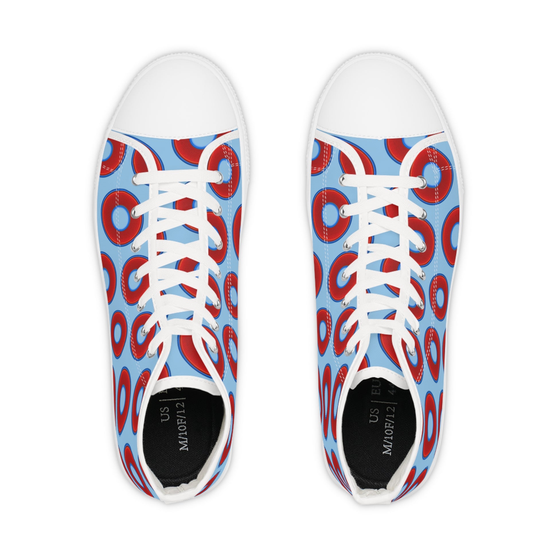 Men's High Top Chucks - large vivid red donut print w/sky blue background