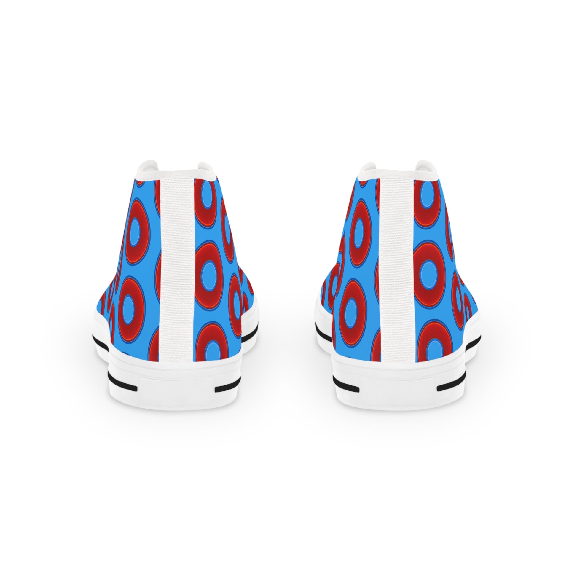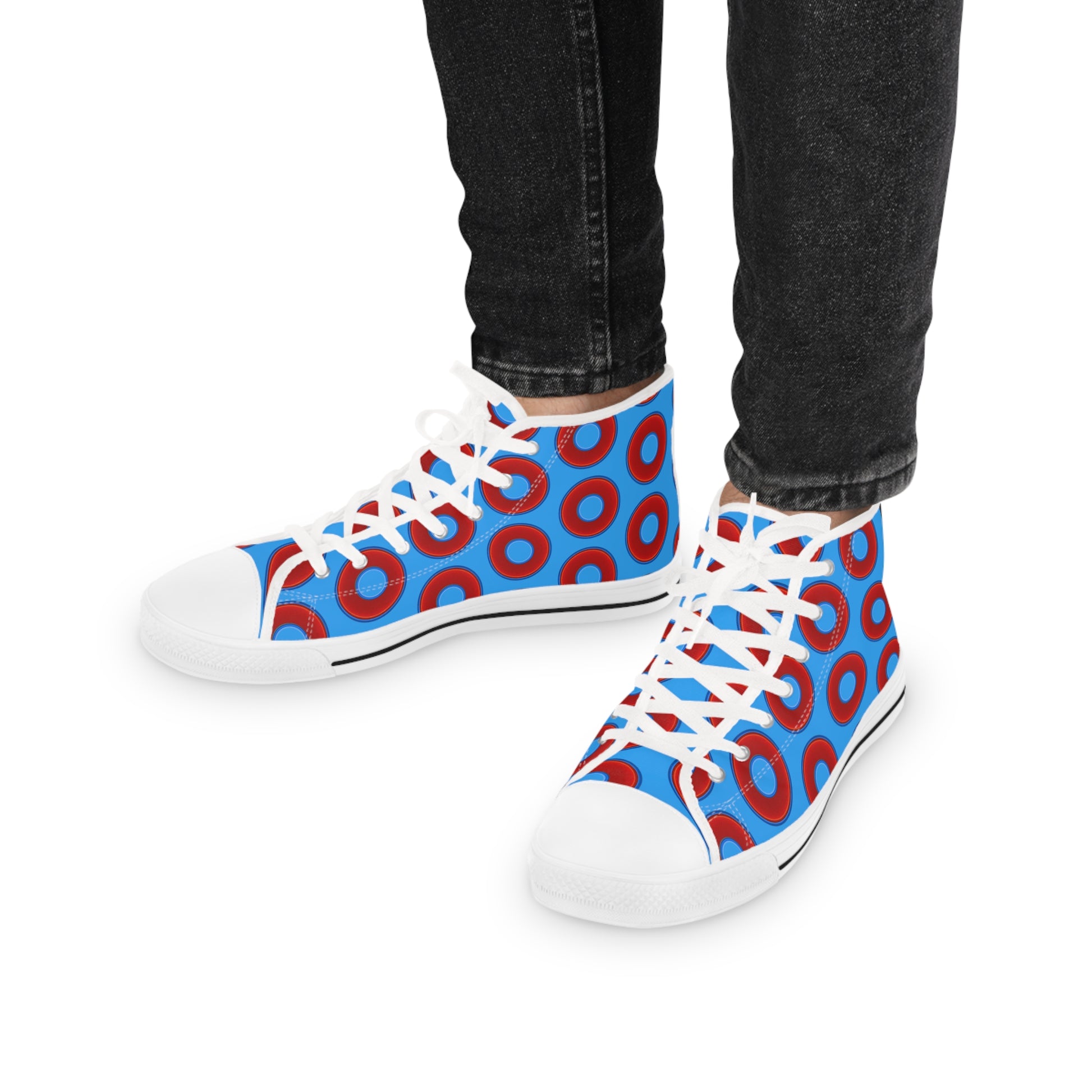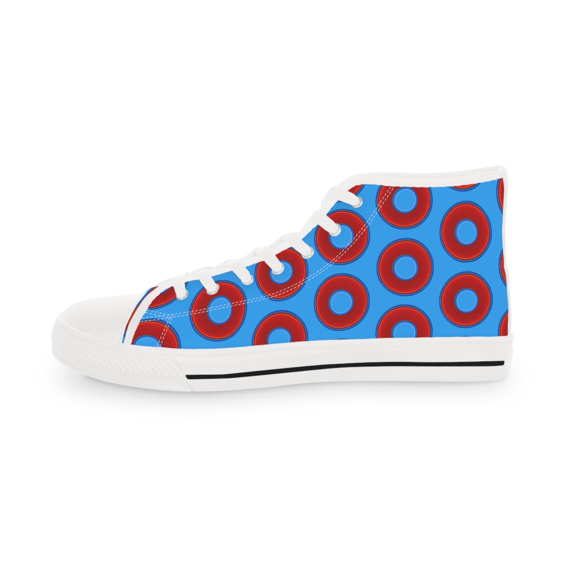 Men's High Top Chucks - large vivid red donut print w/sky royal blue background