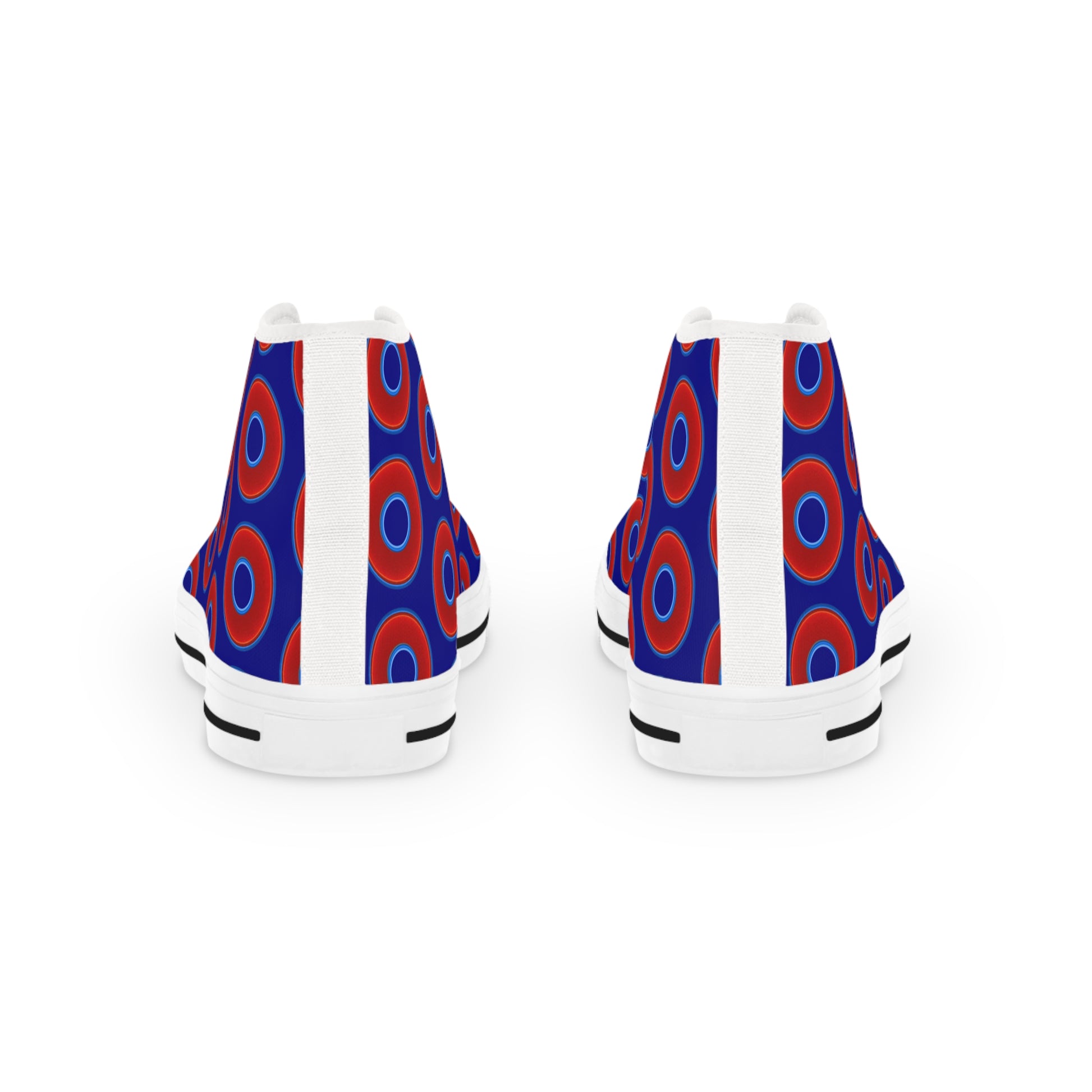 Men's High Top Chucks - large vivid red donut print w/vivid navy blue background