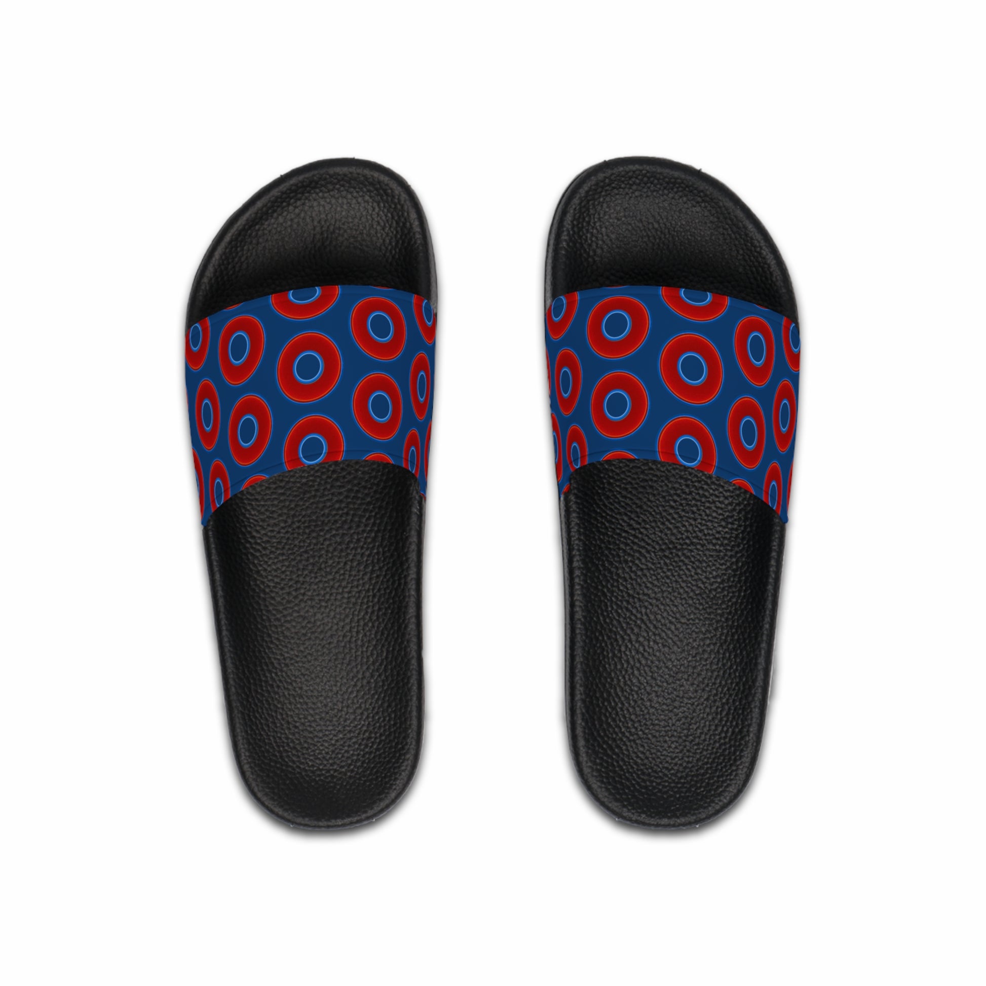 Men's Lumpy Sandals - slip-ons - red vivid donuts w/Atlantic navy blue background