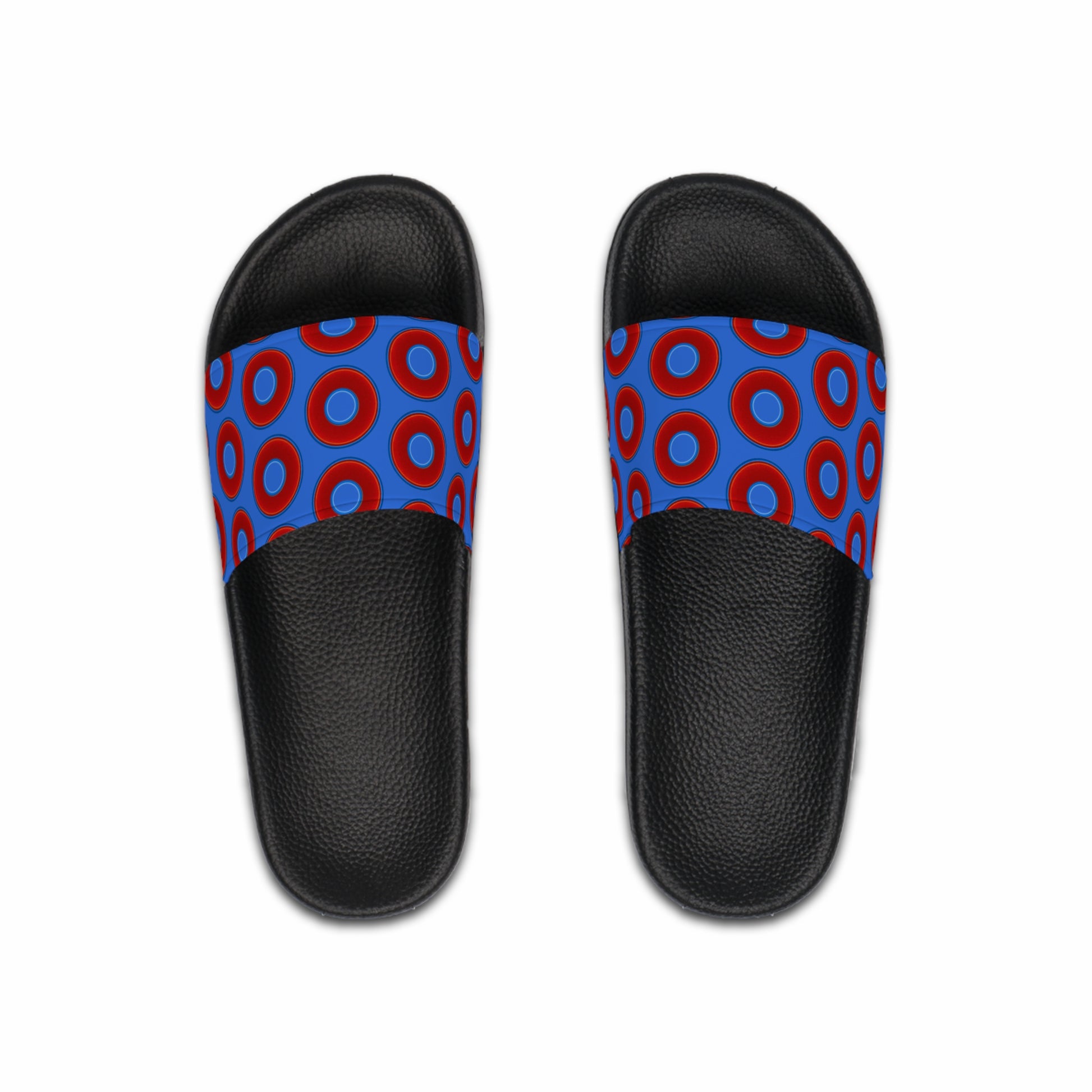 Men's Lumpy Sandals - slip-ons - red vivid donuts w/medium royal blue background